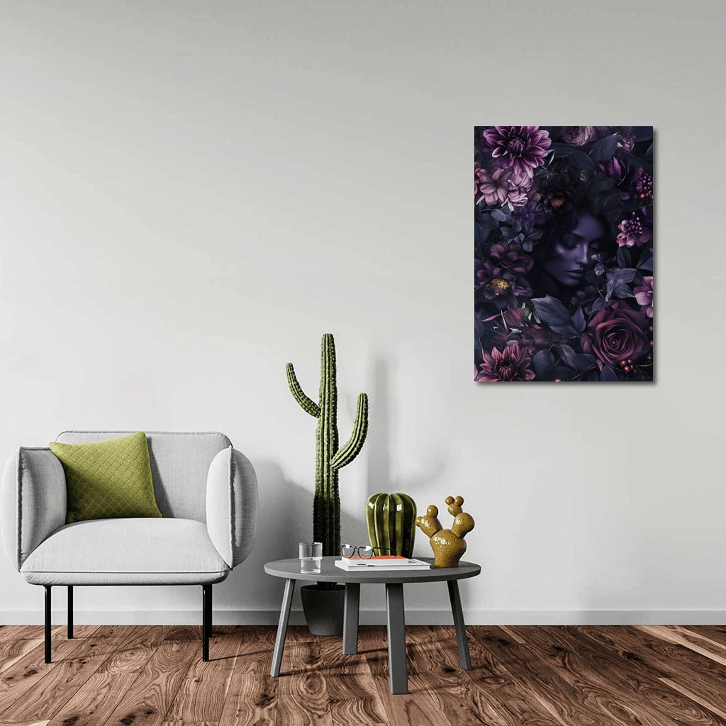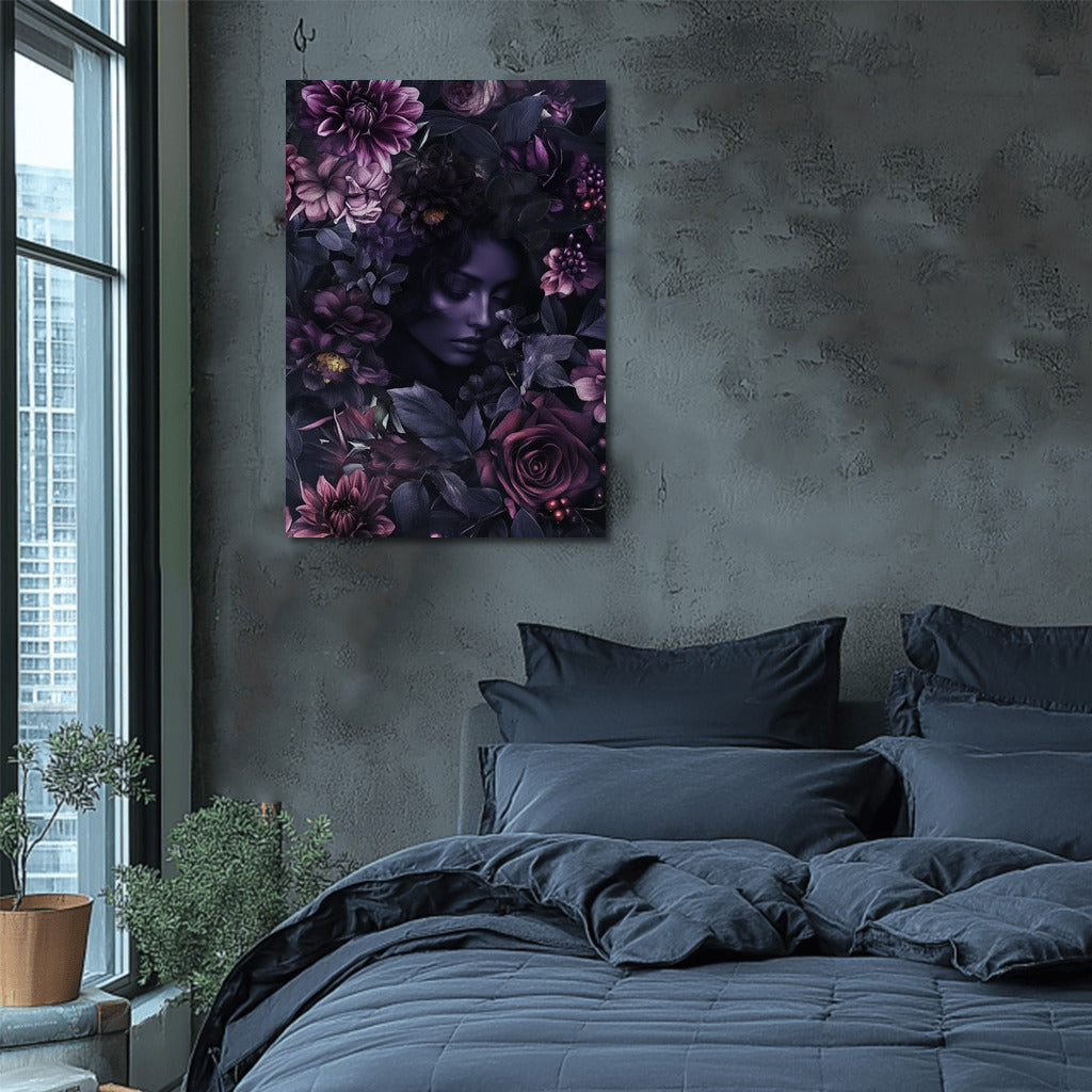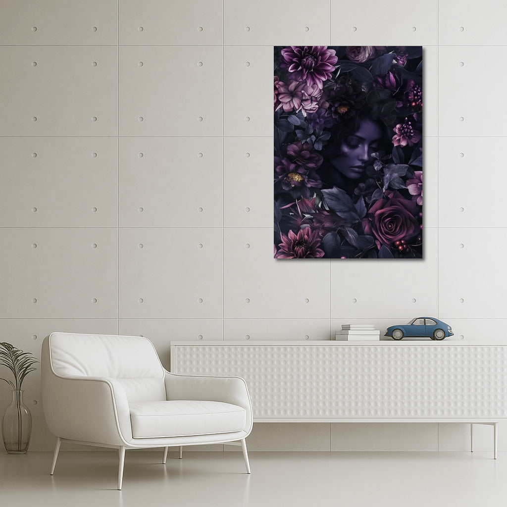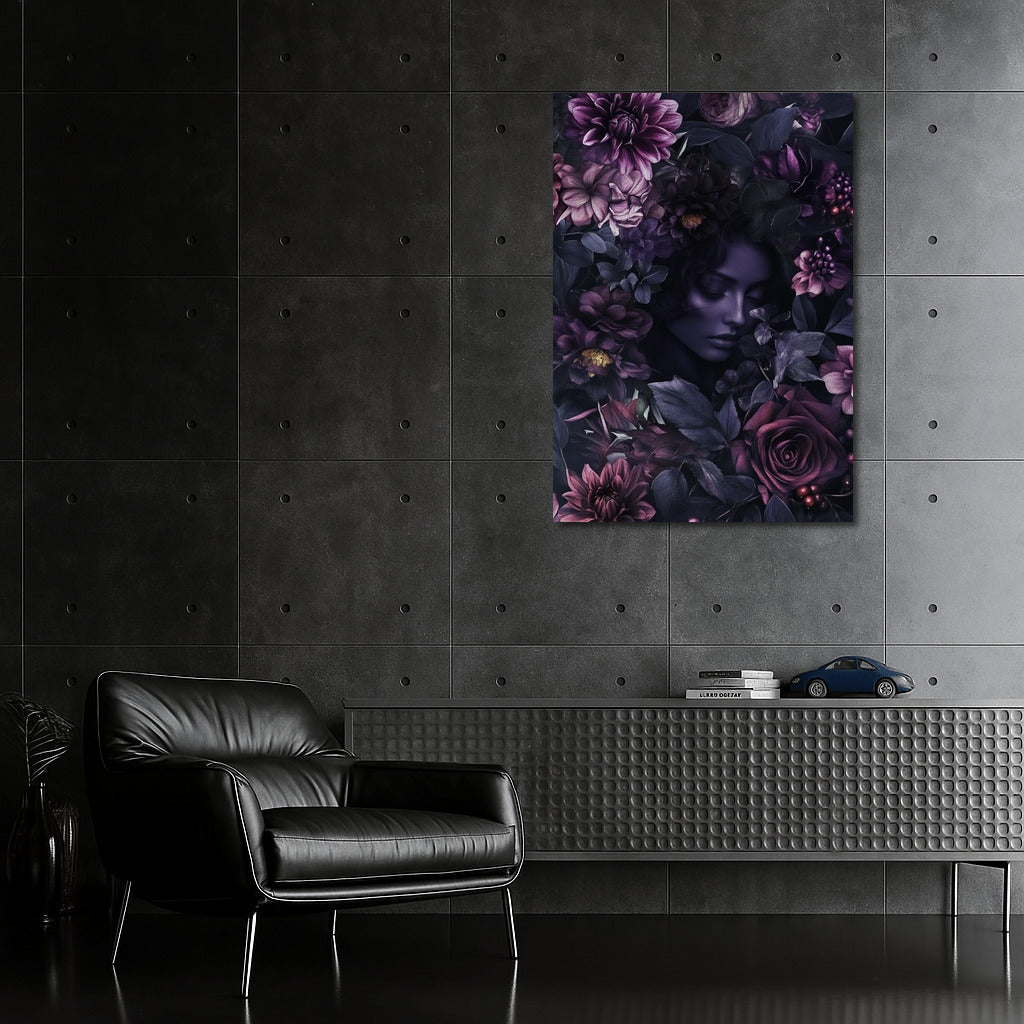 Mysterious painting: a face among dark flowers creates an atmosphere of mystery. The perfect poster for your cozy corner! See more from the collection: Mixed Wall Art
