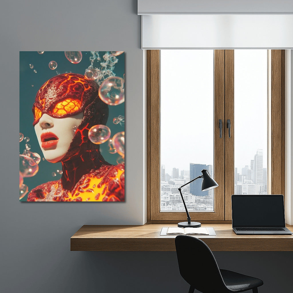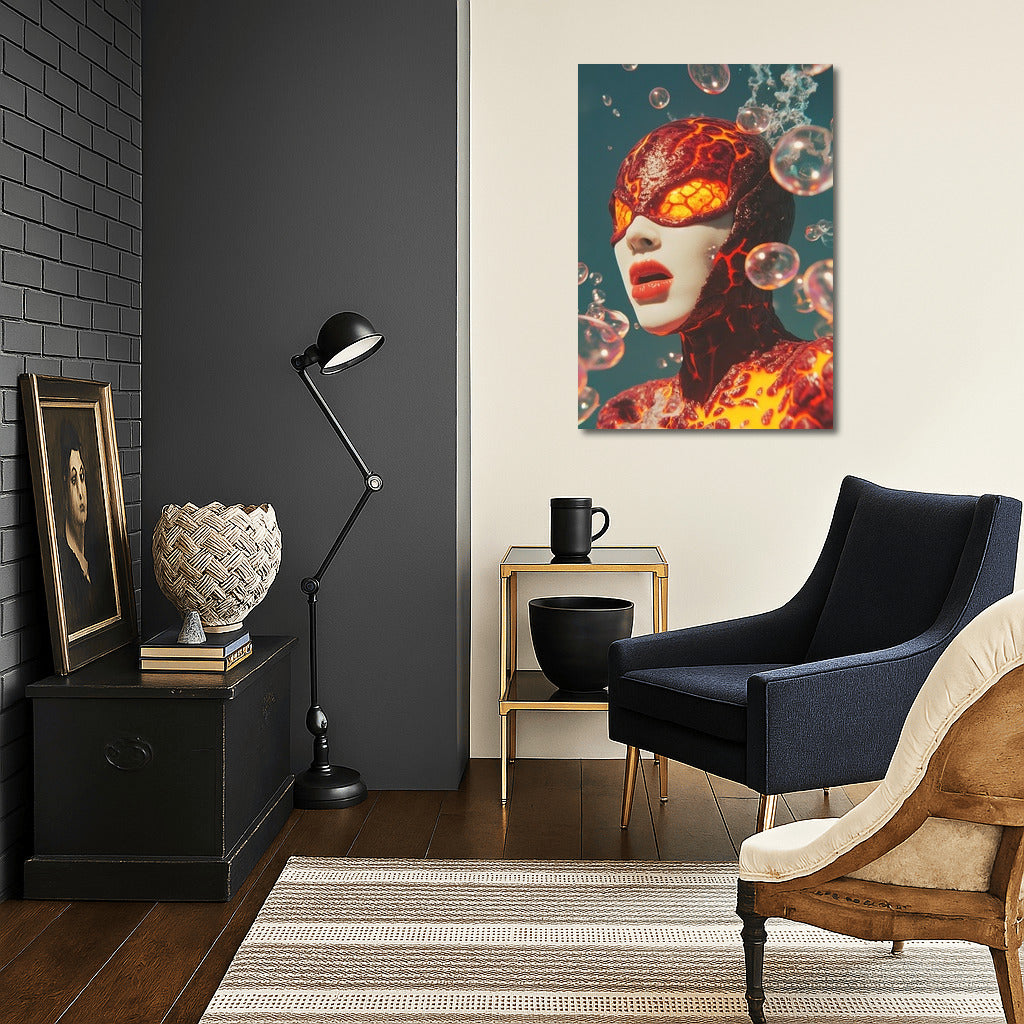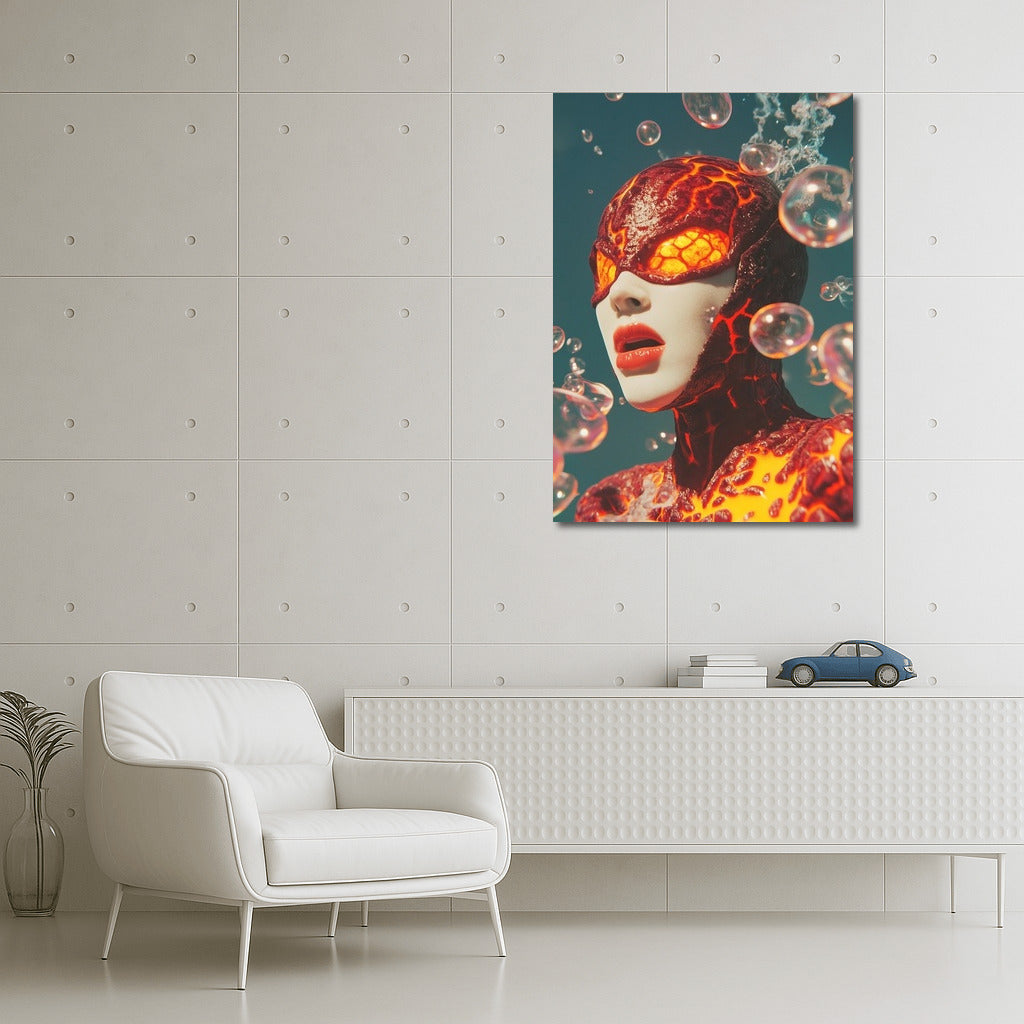 Dive into fantasy with a poster featuring a mysterious face surrounded by bubbles and a fire pattern. Wall art for dreamers! See more from the collection: Mixed Wall Art