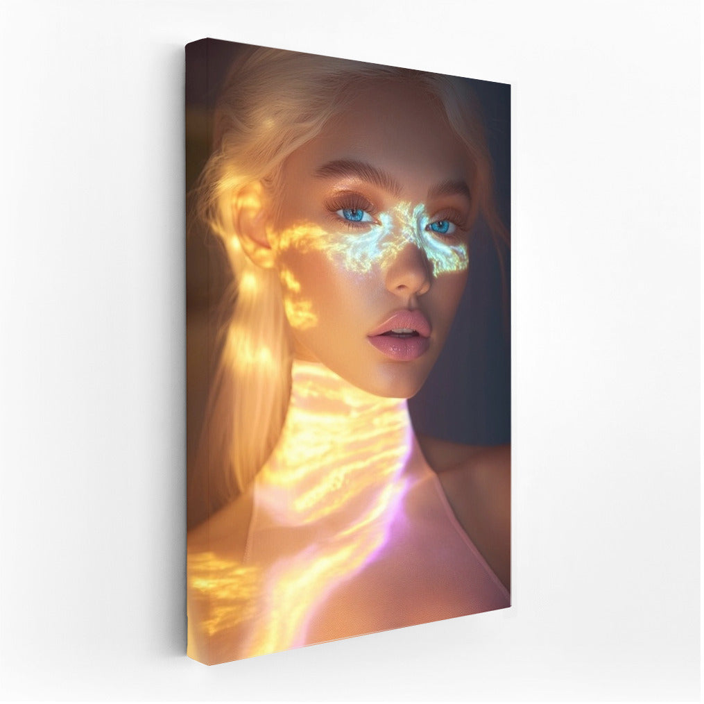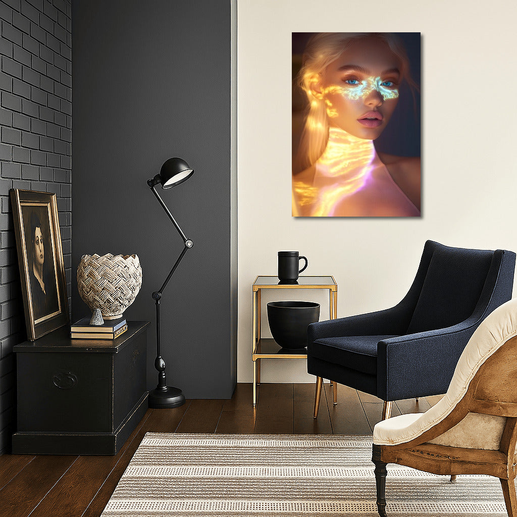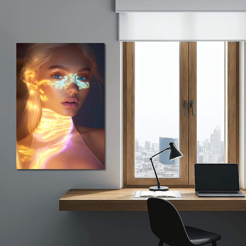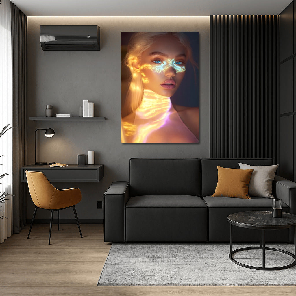 A vibrant poster: a play of light and shadow on a face. Contemporary wall art where the magic of light comes to life in every stroke. See more from the collection: Wall Art with Women