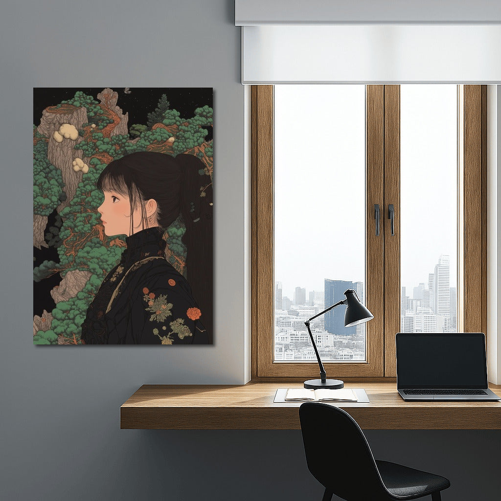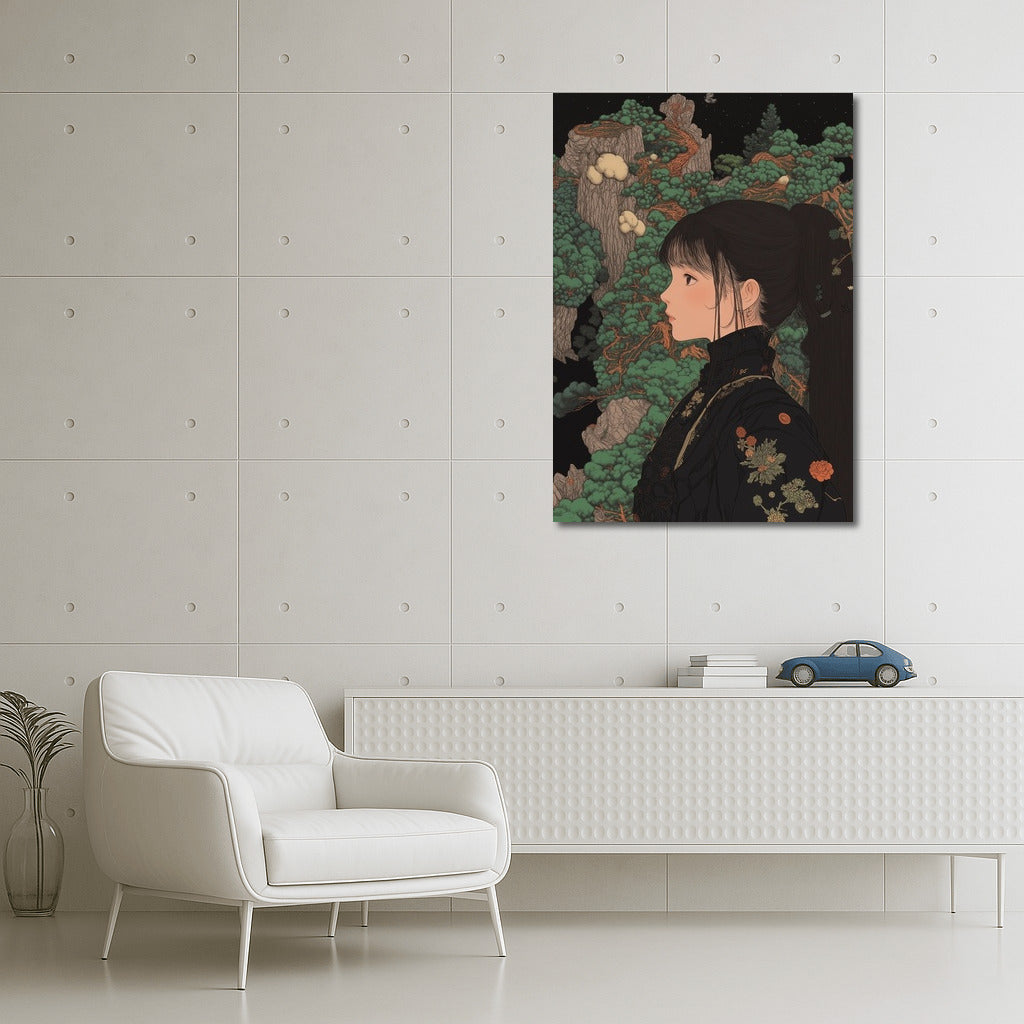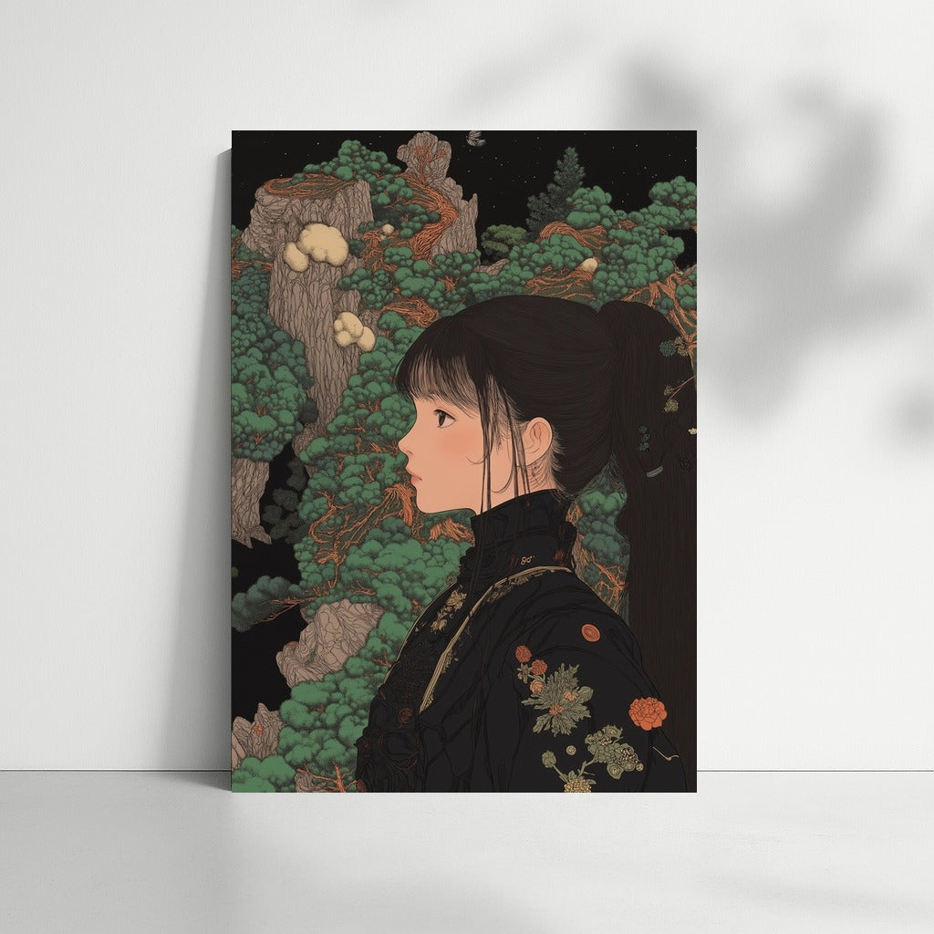 An unusual painting of a girl in a Japanese garden, where nature comes to life in detail. An ideal poster for a stylish interior. See more from the collection: Anime & Manga genres Art