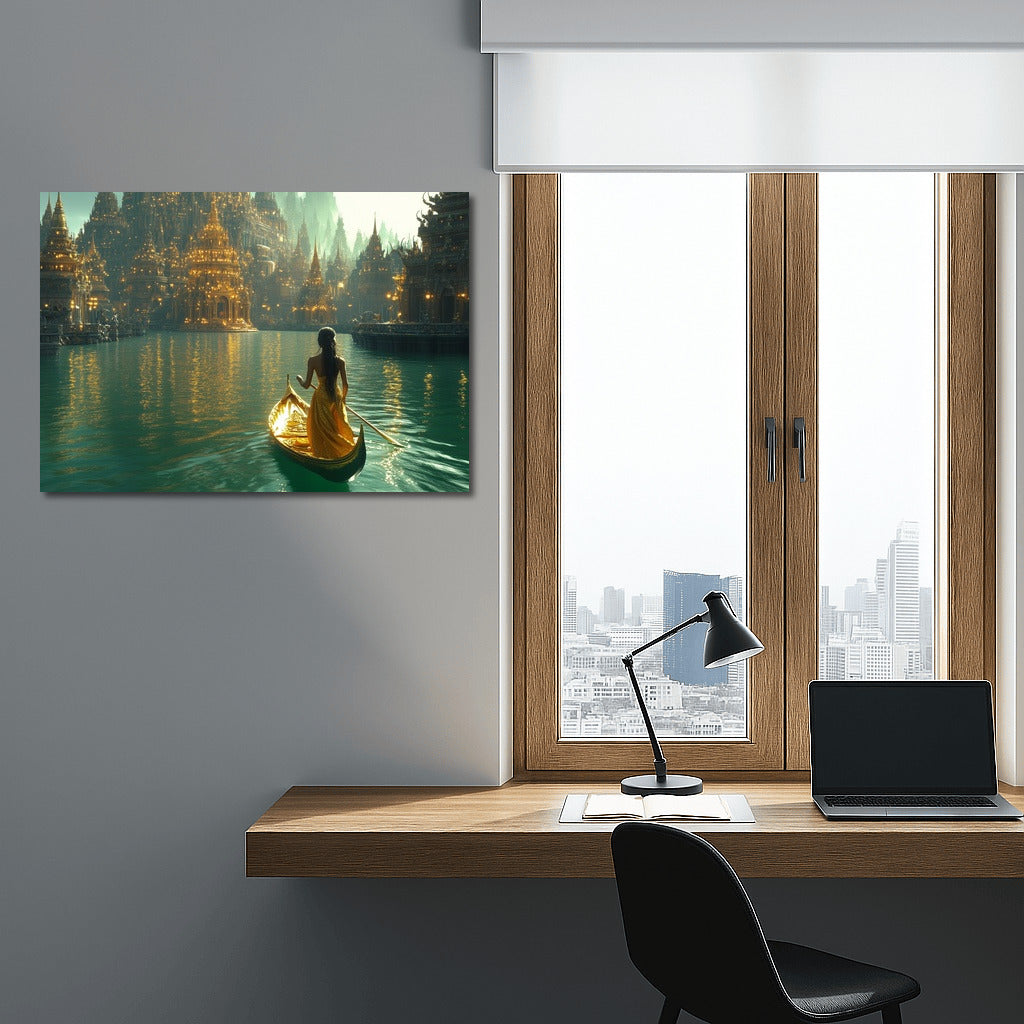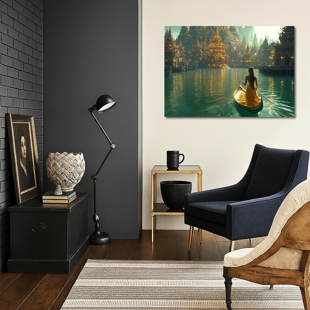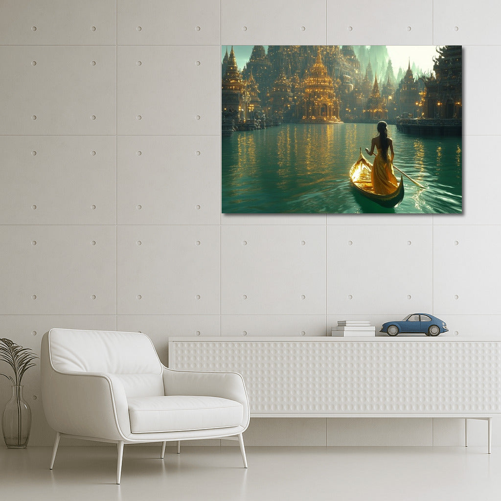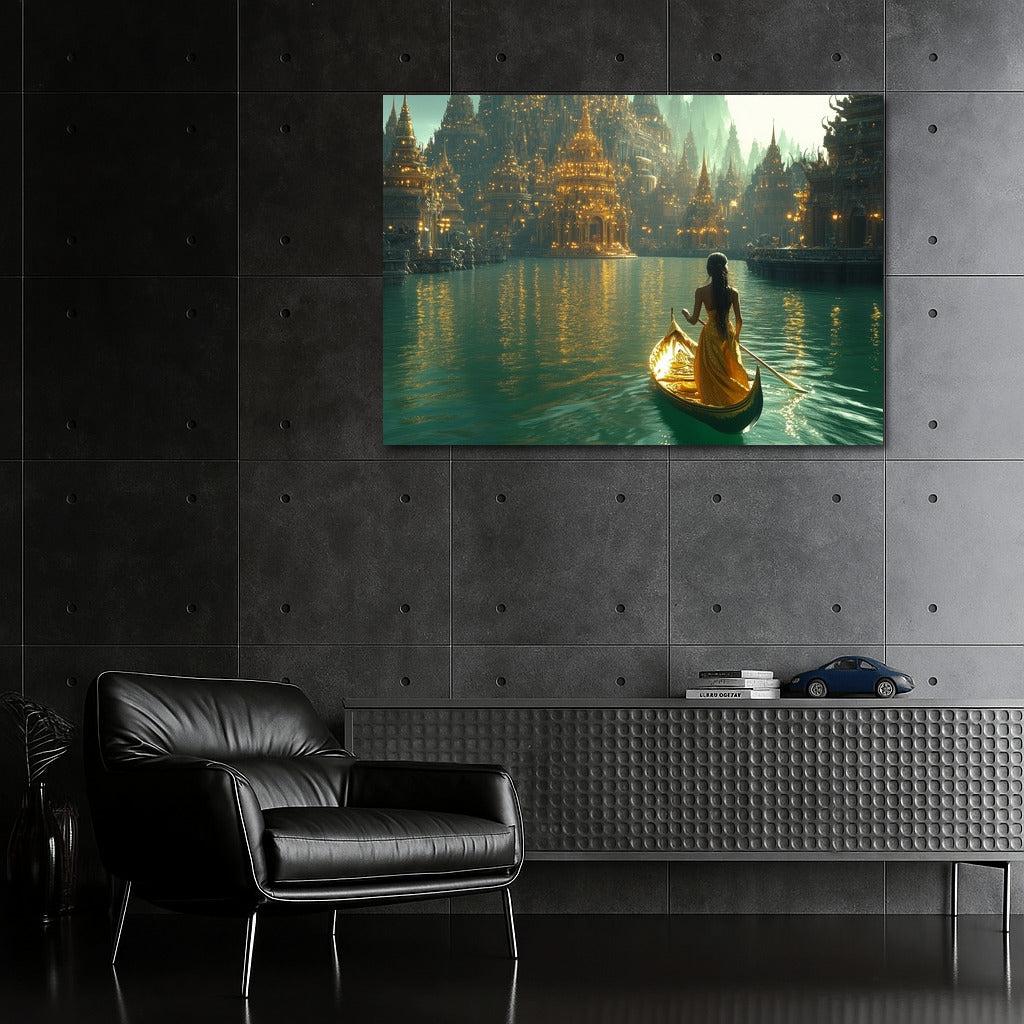Mysterious poster: a figure in a boat sailing through a glittering legendary city. Wall art that immerses you in a fairy tale! See more from the collection: Mixed Wall Art