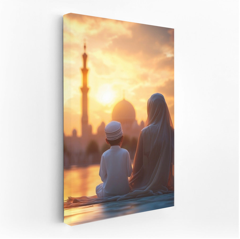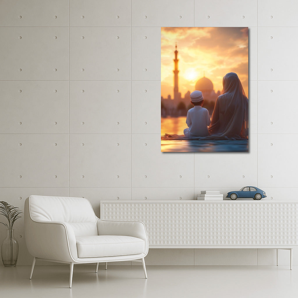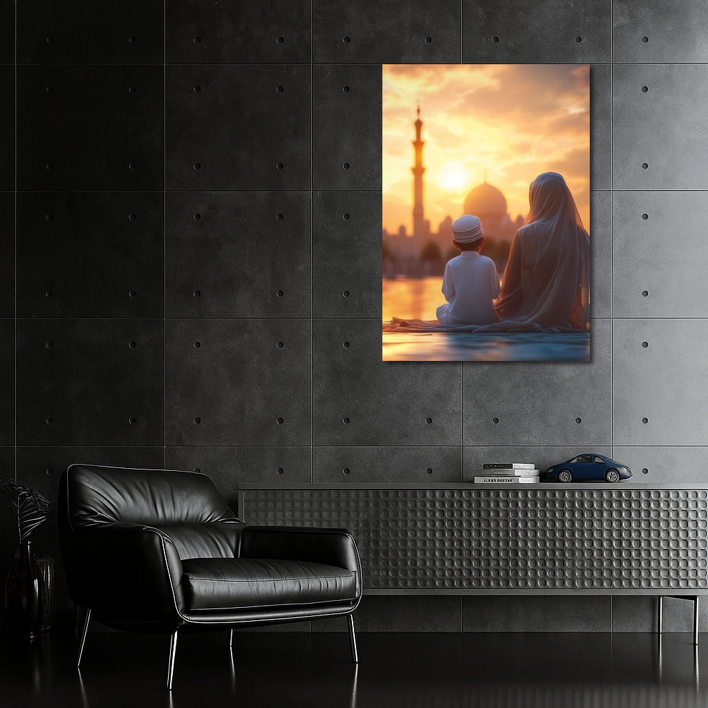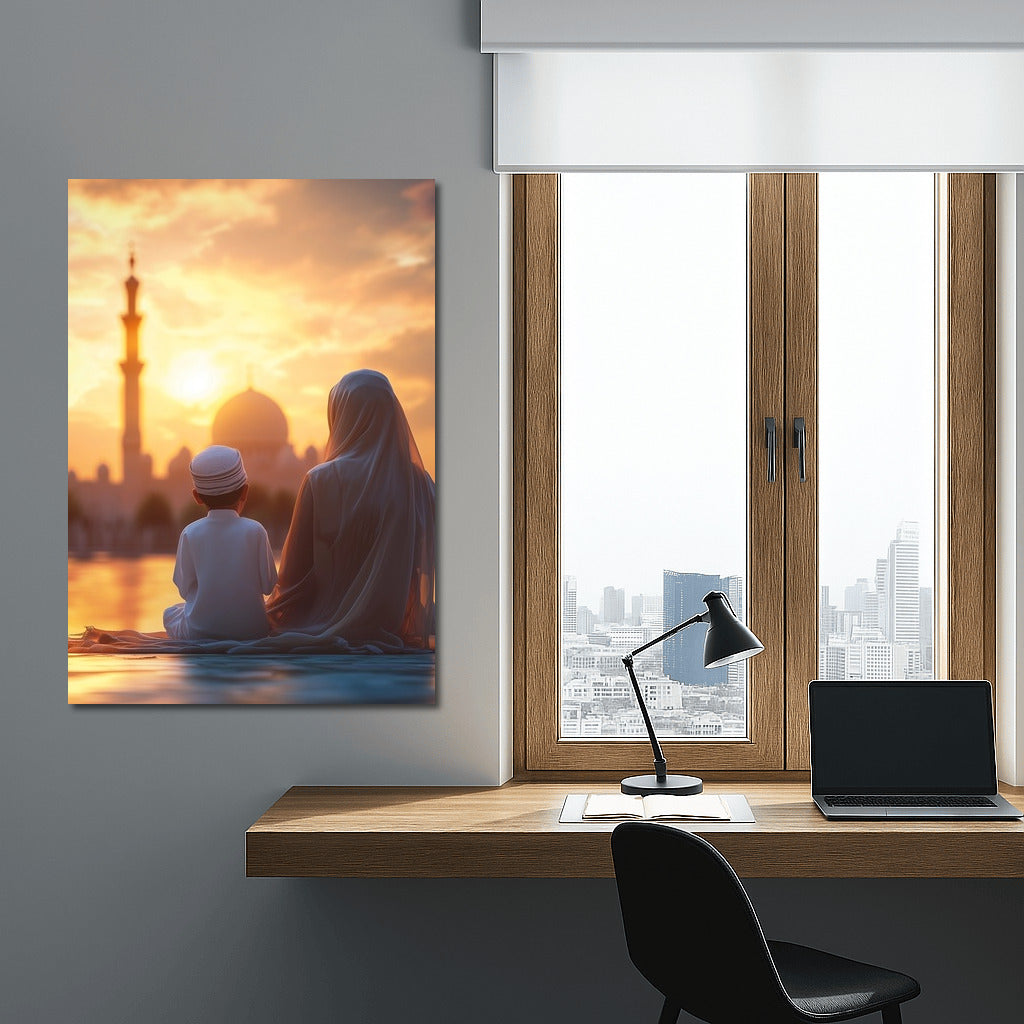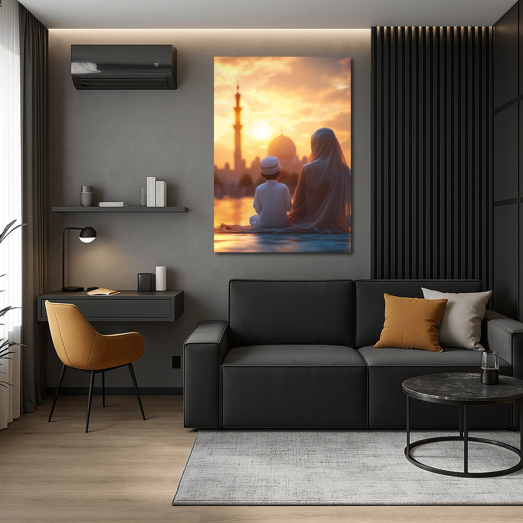 Sunset Dreams: A poster where delicate silhouettes in an oriental fairy tale come to life, surrounded by the magic of sunset light. Wall art. See more from the collection: Islam Art