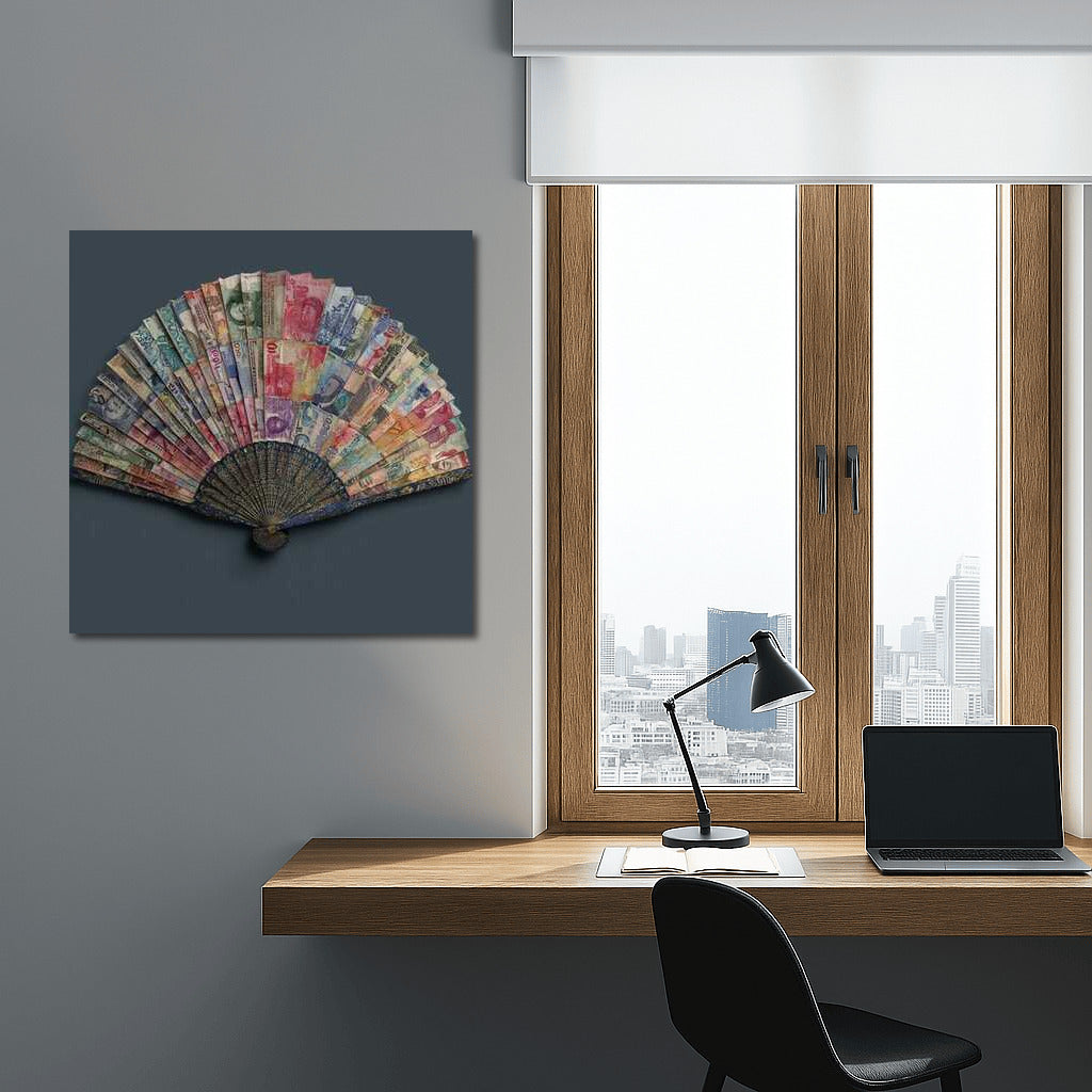 Wonderful wall art featuring a fan of bills. Add a touch of exoticism and opulence to your interior with this Money poster. See more from the collection: Money Art