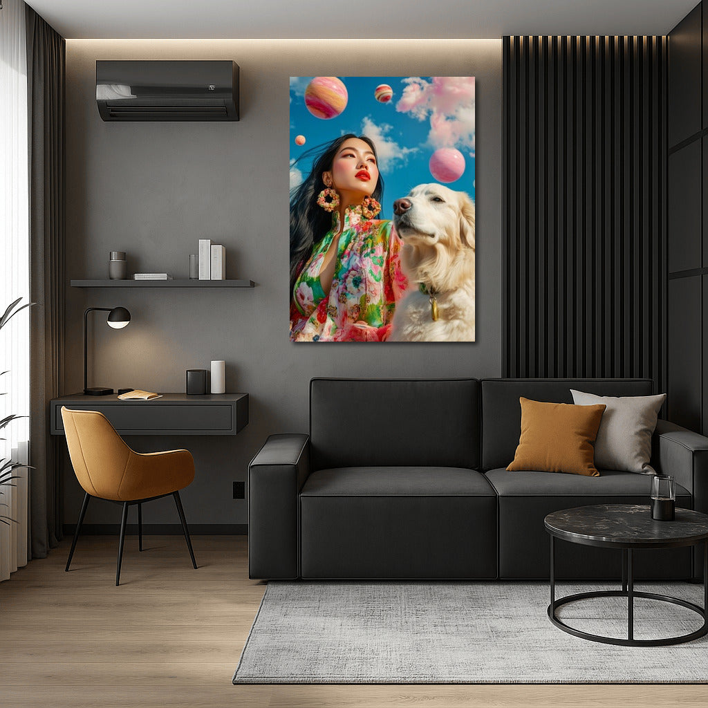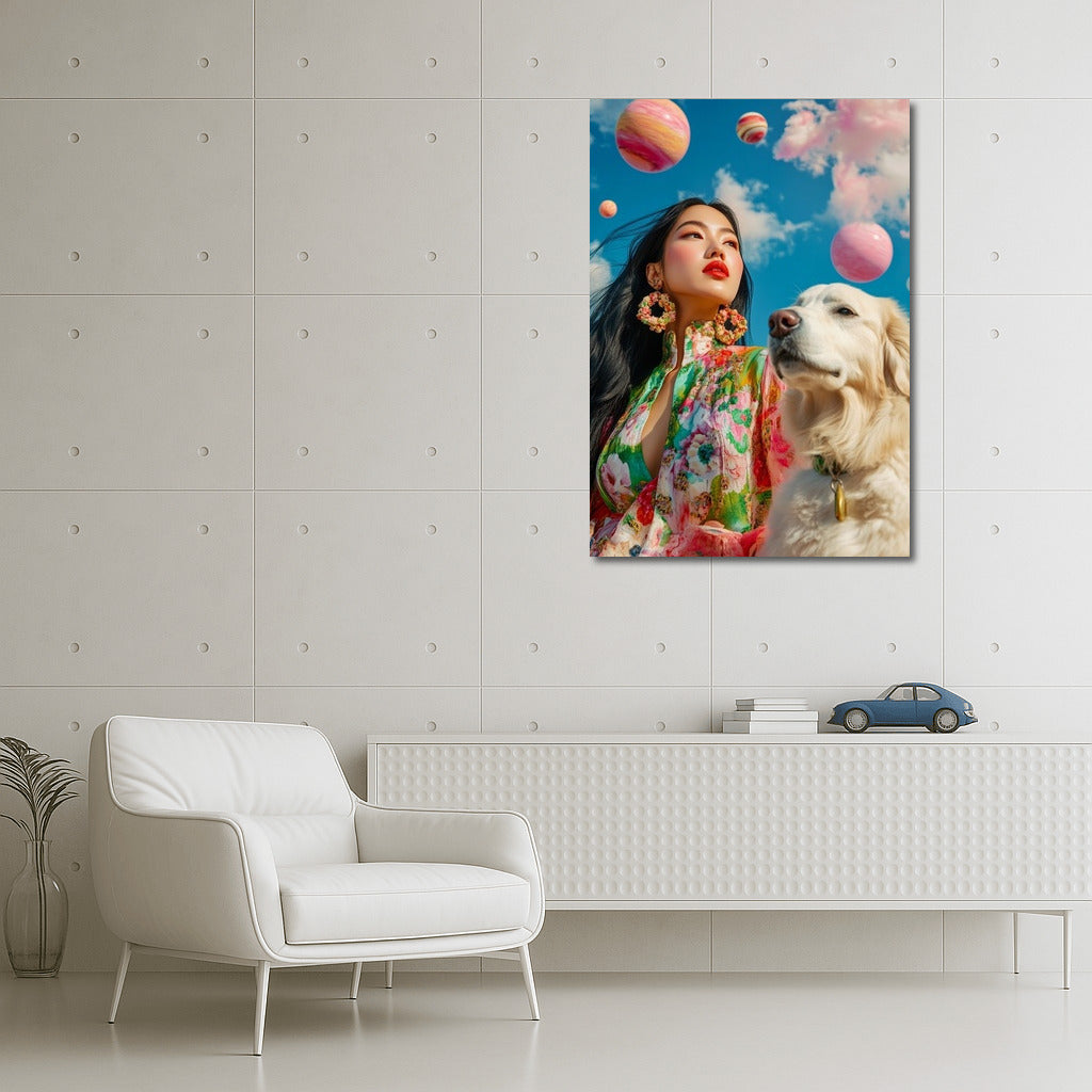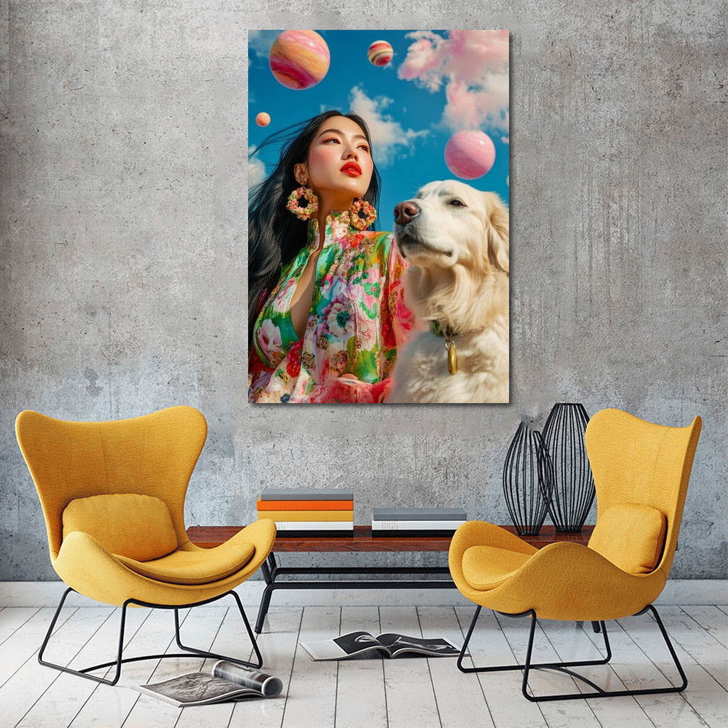 A fairytale painting: a girl and a dog in a world where fantasy comes to life. A poster that inspires you to dream. See more from the collection: Wall Art with Women
