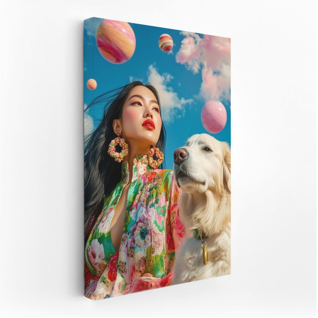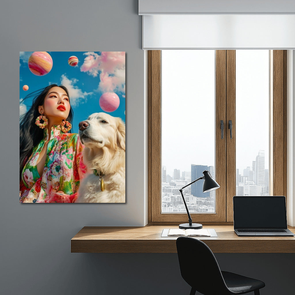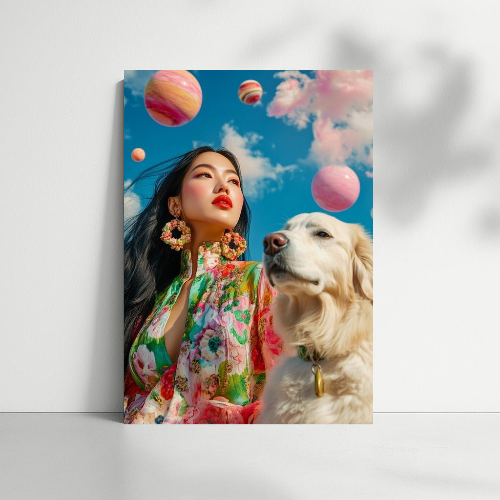 A fairytale painting: a girl and a dog in a world where fantasy comes to life. A poster that inspires you to dream. See more from the collection: Wall Art with Women