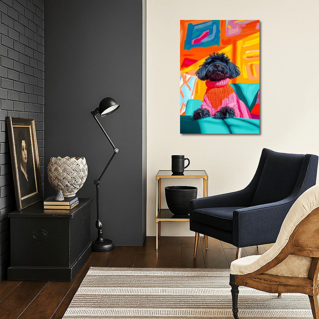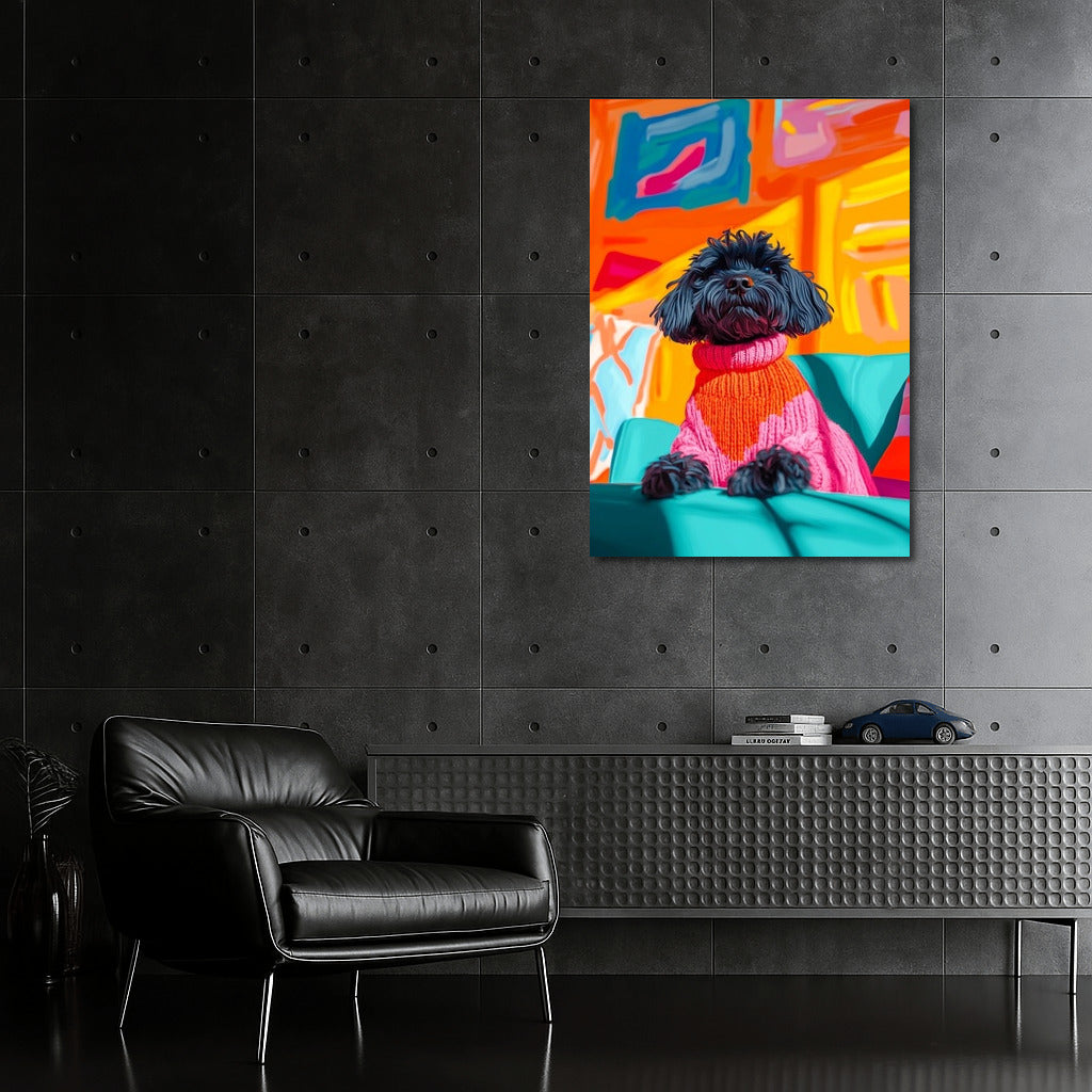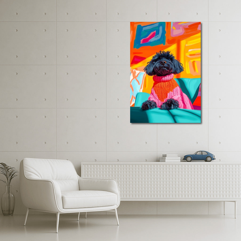 Bright poster: a stylish dog in a sweater against the background of abstract art. Add expressiveness to the interior with this wall masterpiece! See more from the collection: Animals Art
