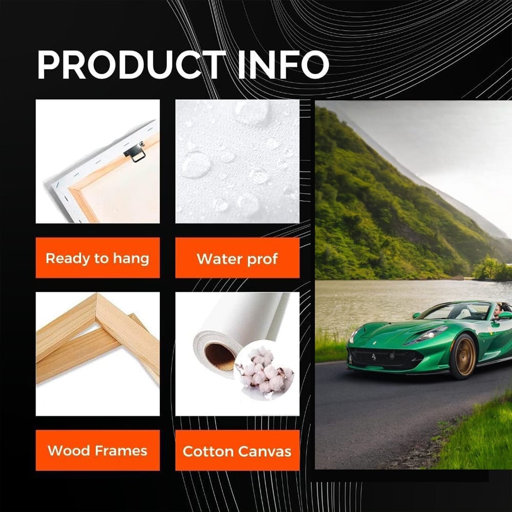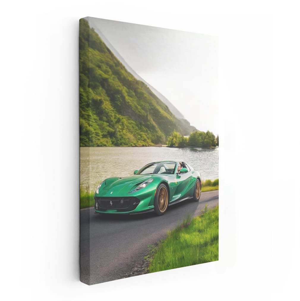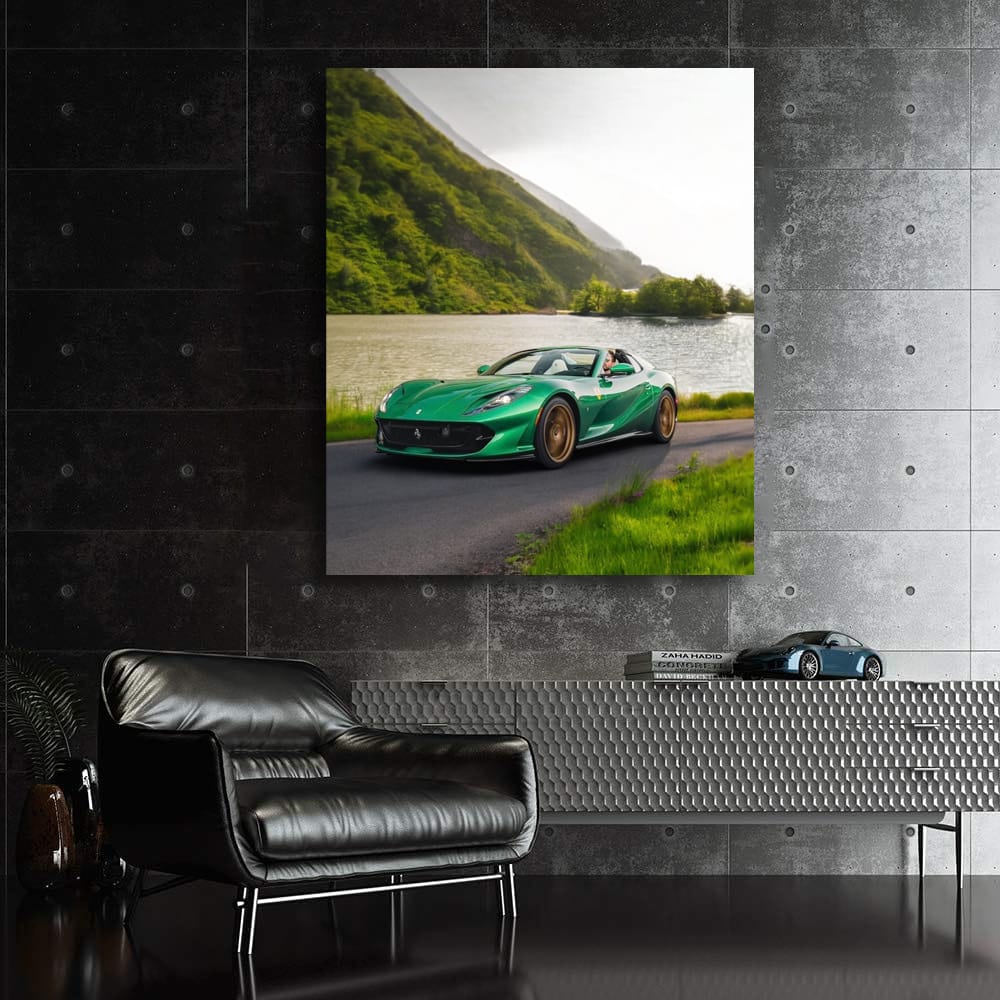 This poster is like a breath of fresh gasoline for a car enthusiast. Ferrari 812 GTS with a wild nature background is a painting that will give you goosebumps. Wall art that will liven up the garage and make your heart beat faster. See more from the collection: Ferrari 812 Superfast Art