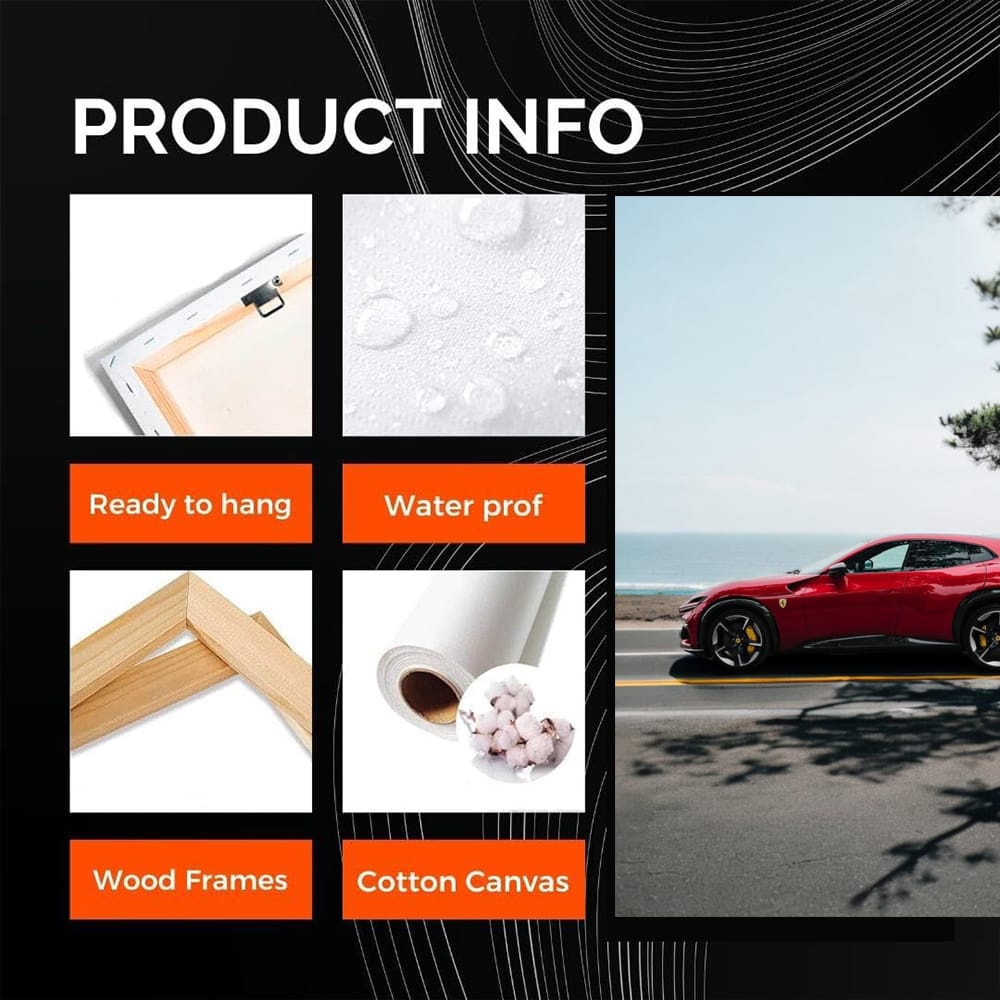 What a poster, bro! Ferrari Purosangue against the sea is a pure adrenaline rush. This wall art is a car lover's dream. The painting conveys the power and style of the Italian stallion, as if the engine is roaring right in your home. No compromises, just speed! See more from the collection: Ferrari Art