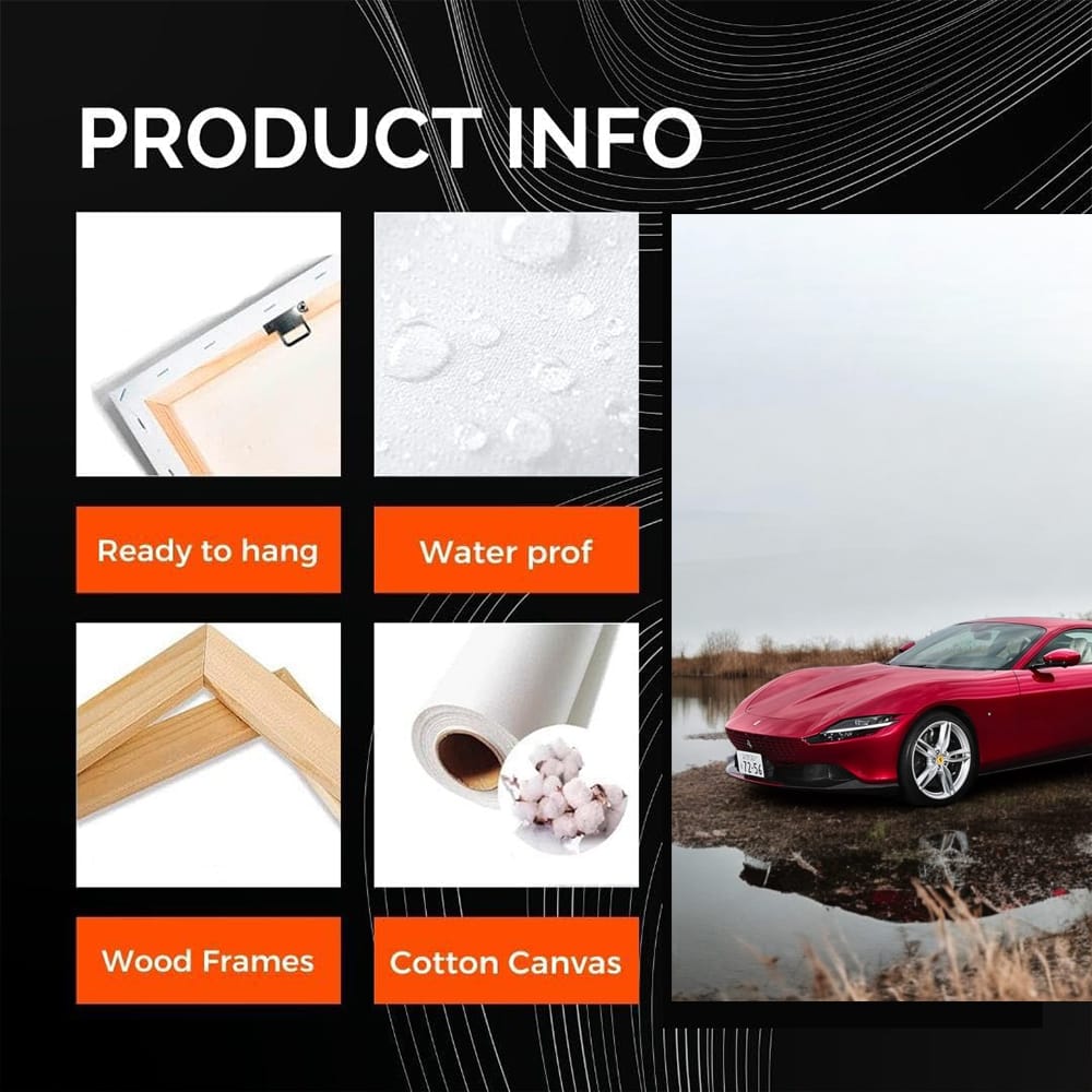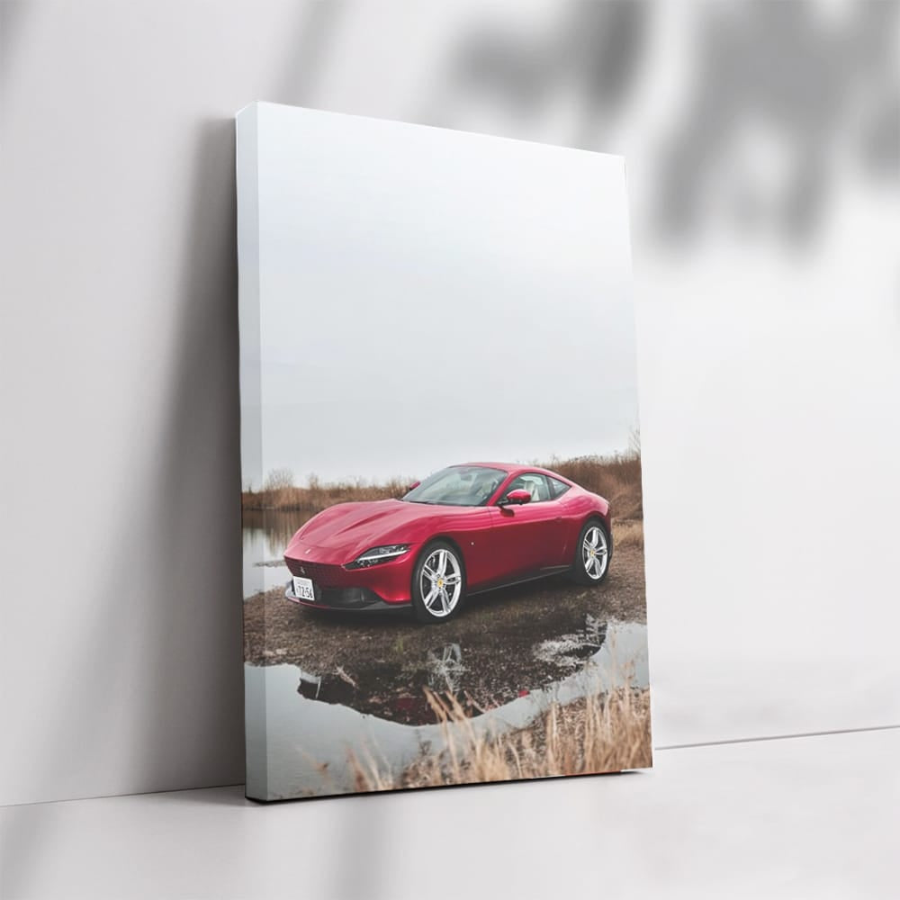 Bro, check out this wall art! Ferrari Roma on the lake is not just a poster, it's a real painting for car fans. This car looks like it's ready to tear up the asphalt right from the canvas. A real thrill for those who are into it. See more from the collection: Ferrari Art