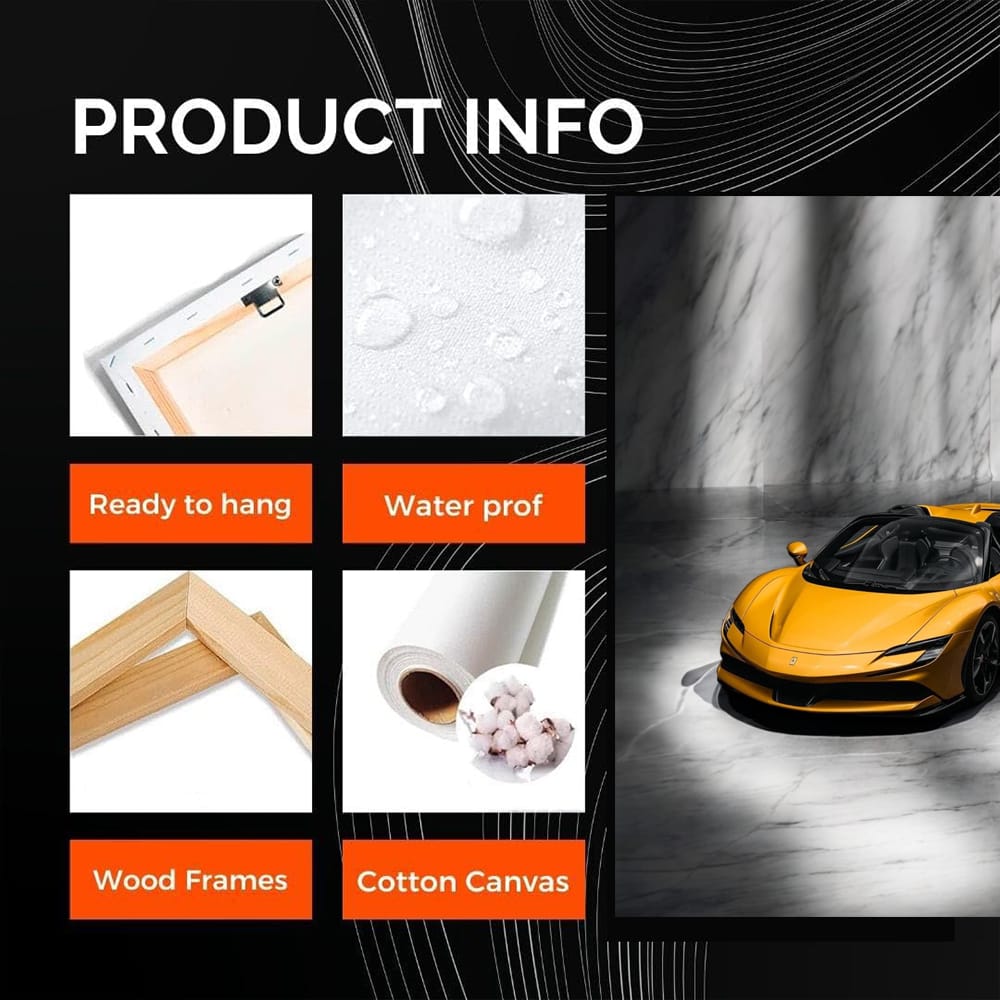 This painting is pure fire! The Ferrari SF90 Spider on the wall is not just a poster, but a real piece of racing soul. The marble background emphasizes the power of the car. Such wall art will make the heart beat faster than any engine. See more from the collection: Ferrari Art
