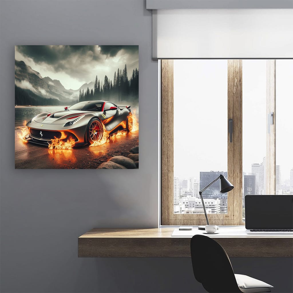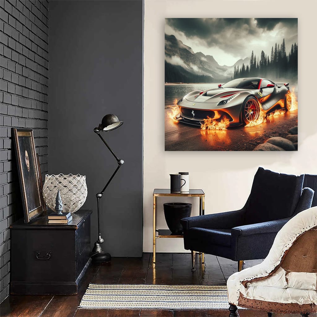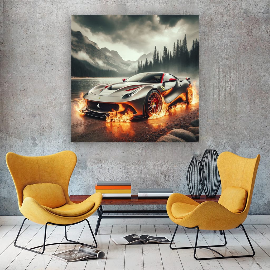 This is a poster - Ferrari SF90 Stradale in a fiery paint job! Wall art for real petrolheads. This beast on the wall is like a challenge to all boring interiors. A painting that screams: "Step on the gas, bro!" See more from the collection: Ferrari Art