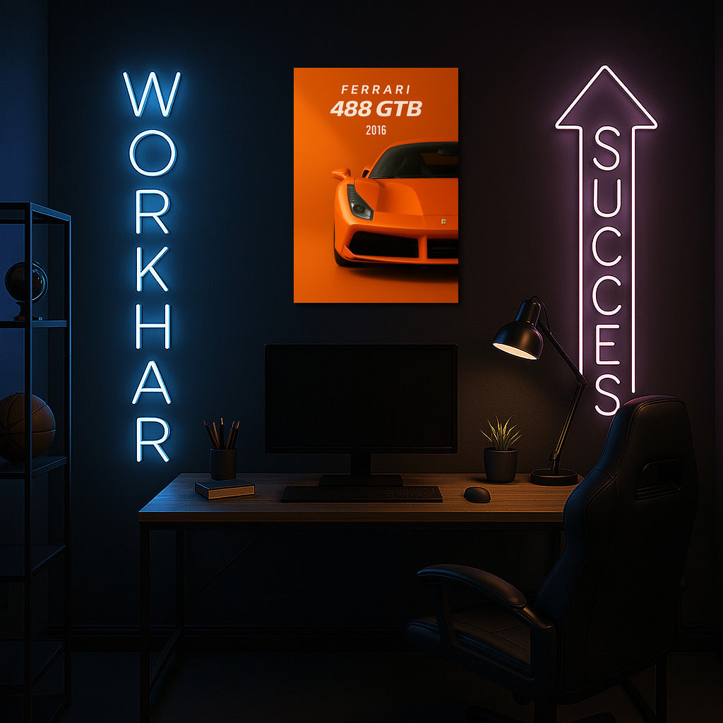 Wall art for those who love speed: a painting of a striking 2016 Ferrari 488 GTB in fiery orange. See more from the collection: Ferrari Art