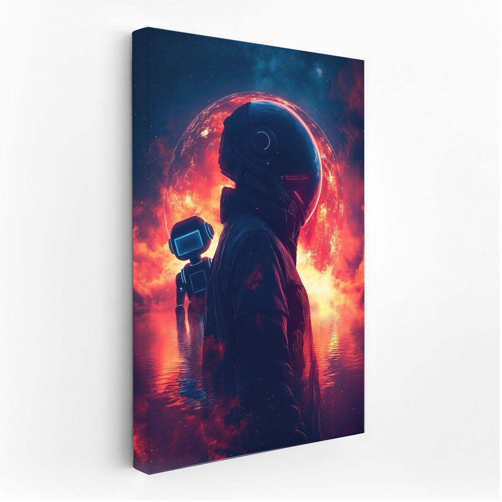 Space fantasy comes to life in this poster: a mysterious silhouette and a robot against the backdrop of fiery space. Wall art of the future! See more from the collection: Mixed Wall Art