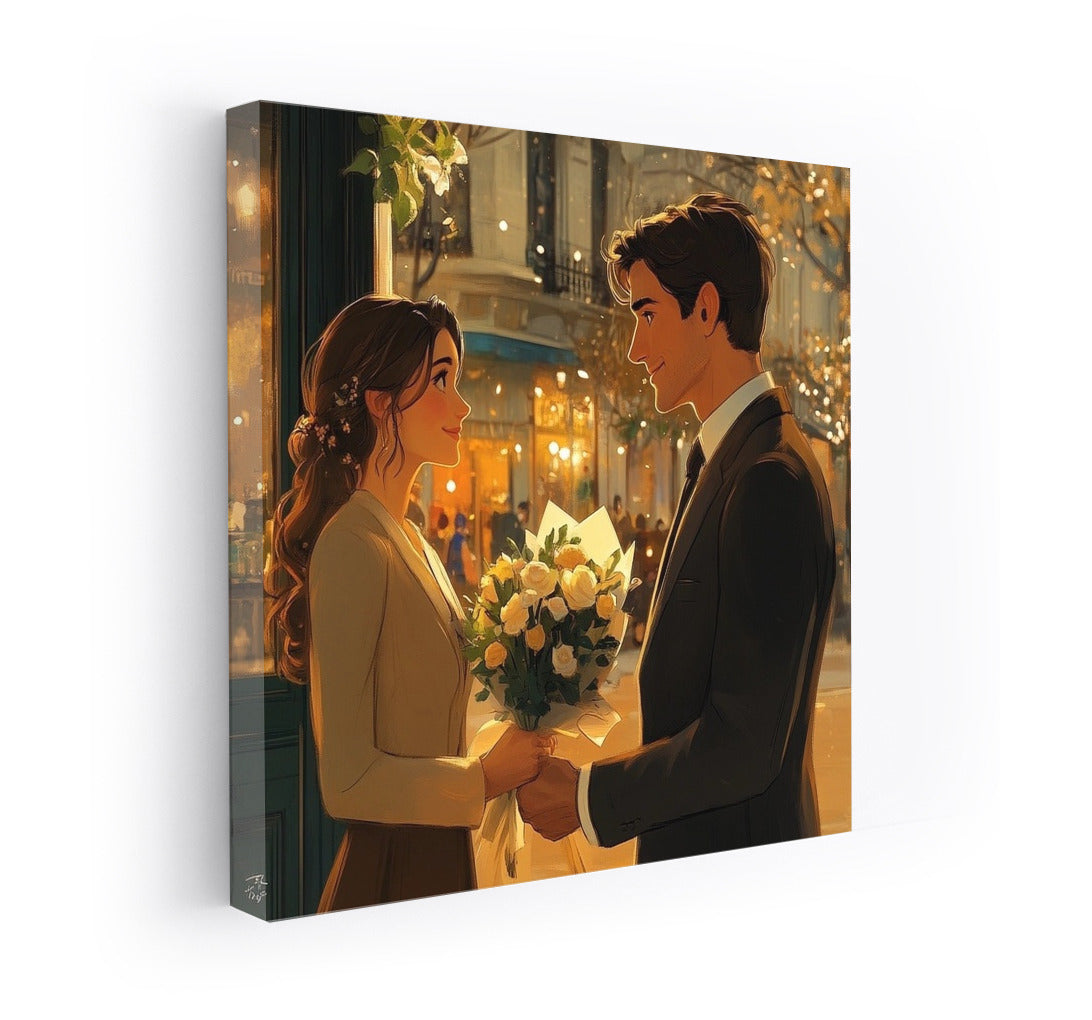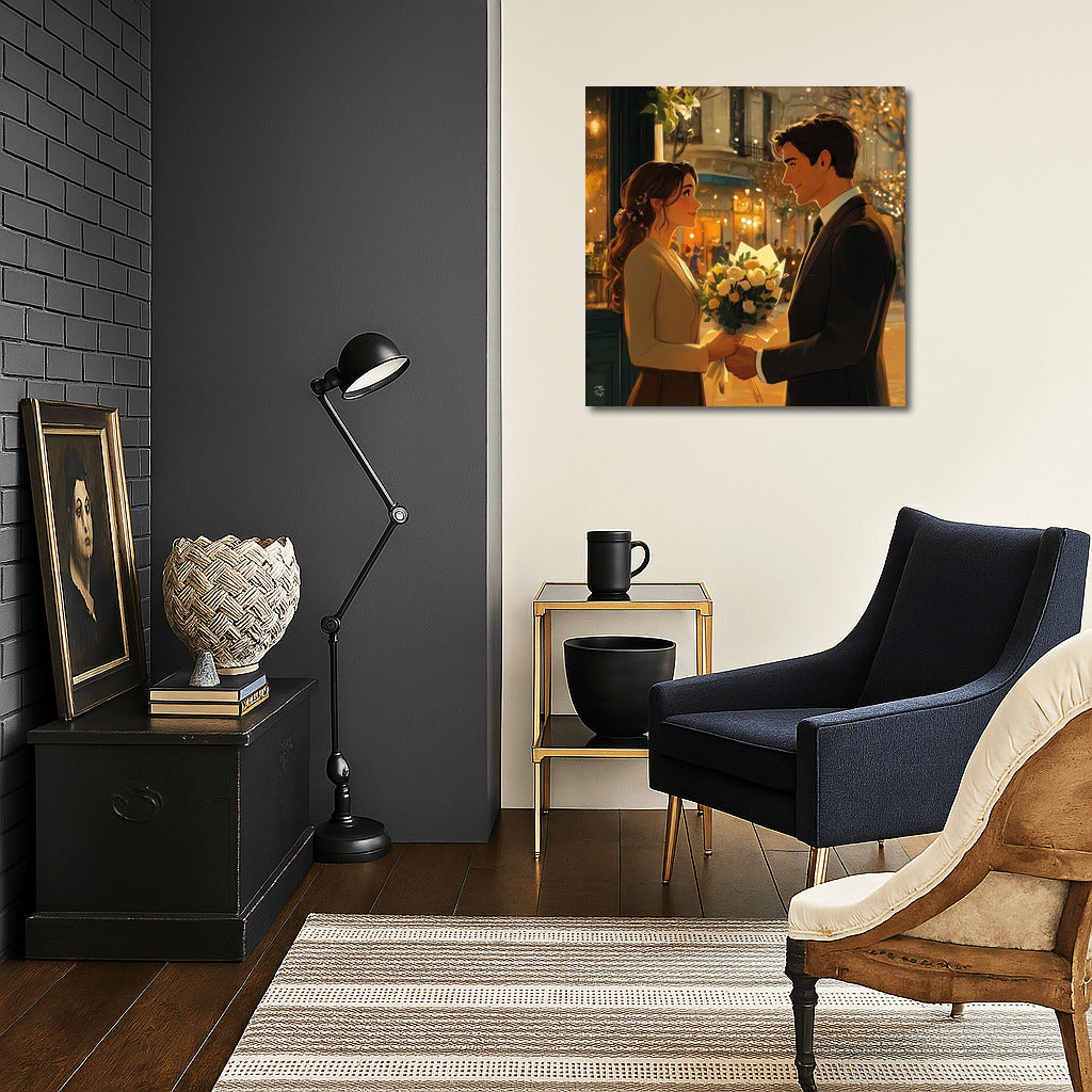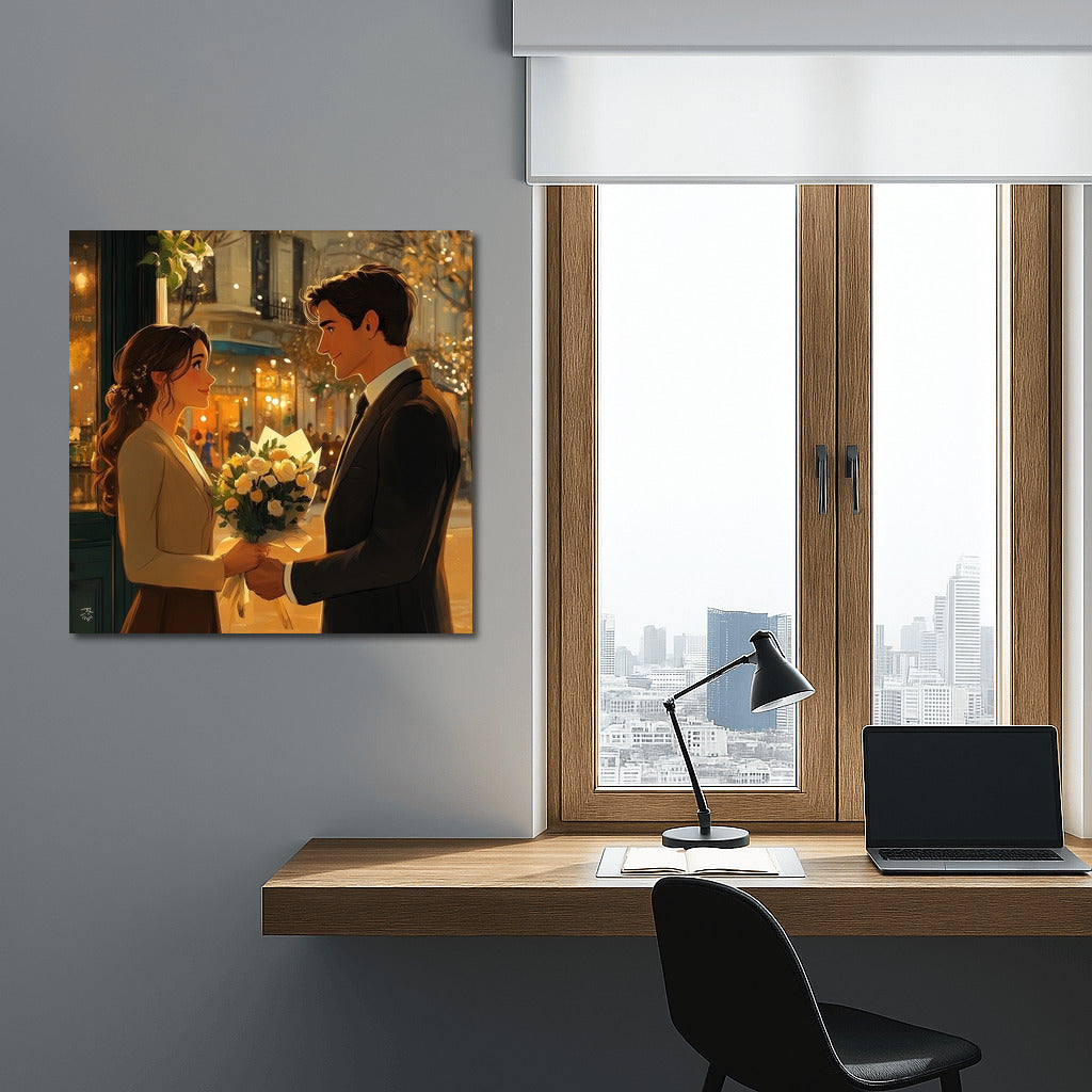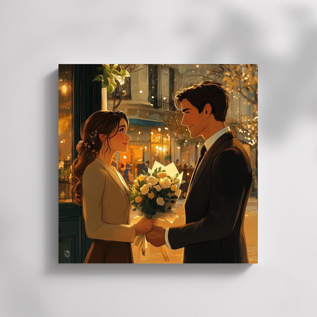 Romance of the city: a poster with a tender meeting under the evening lights will create coziness and warmth in your home. Wall art for the soul. See more from the collection: Cartoon Art