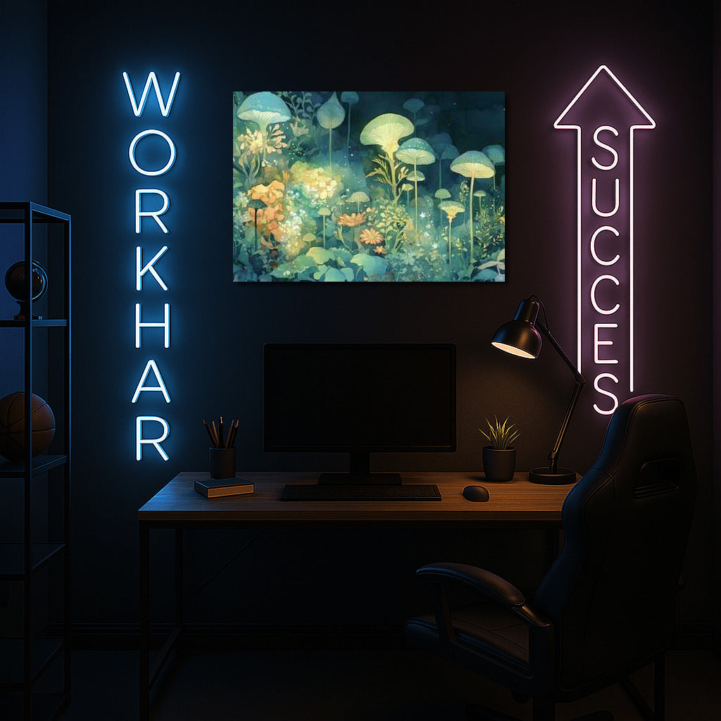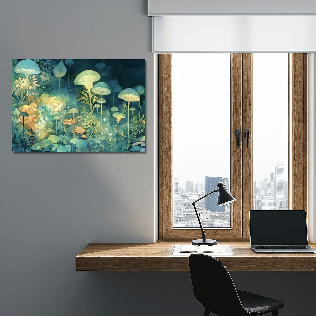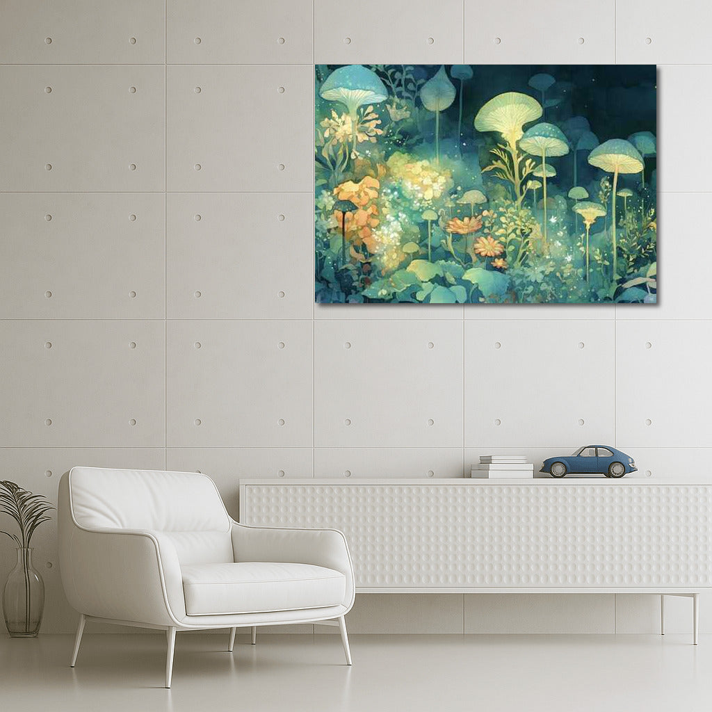 Dive into a dream world with this fantasy painting: magic mushrooms and fireflies create the atmosphere of a fairytale forest on your wall. See more from the collection: Fantasy Art