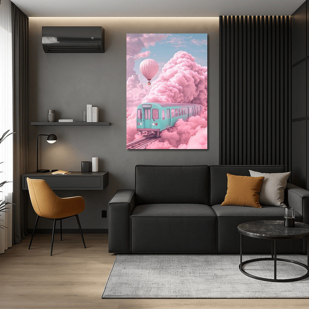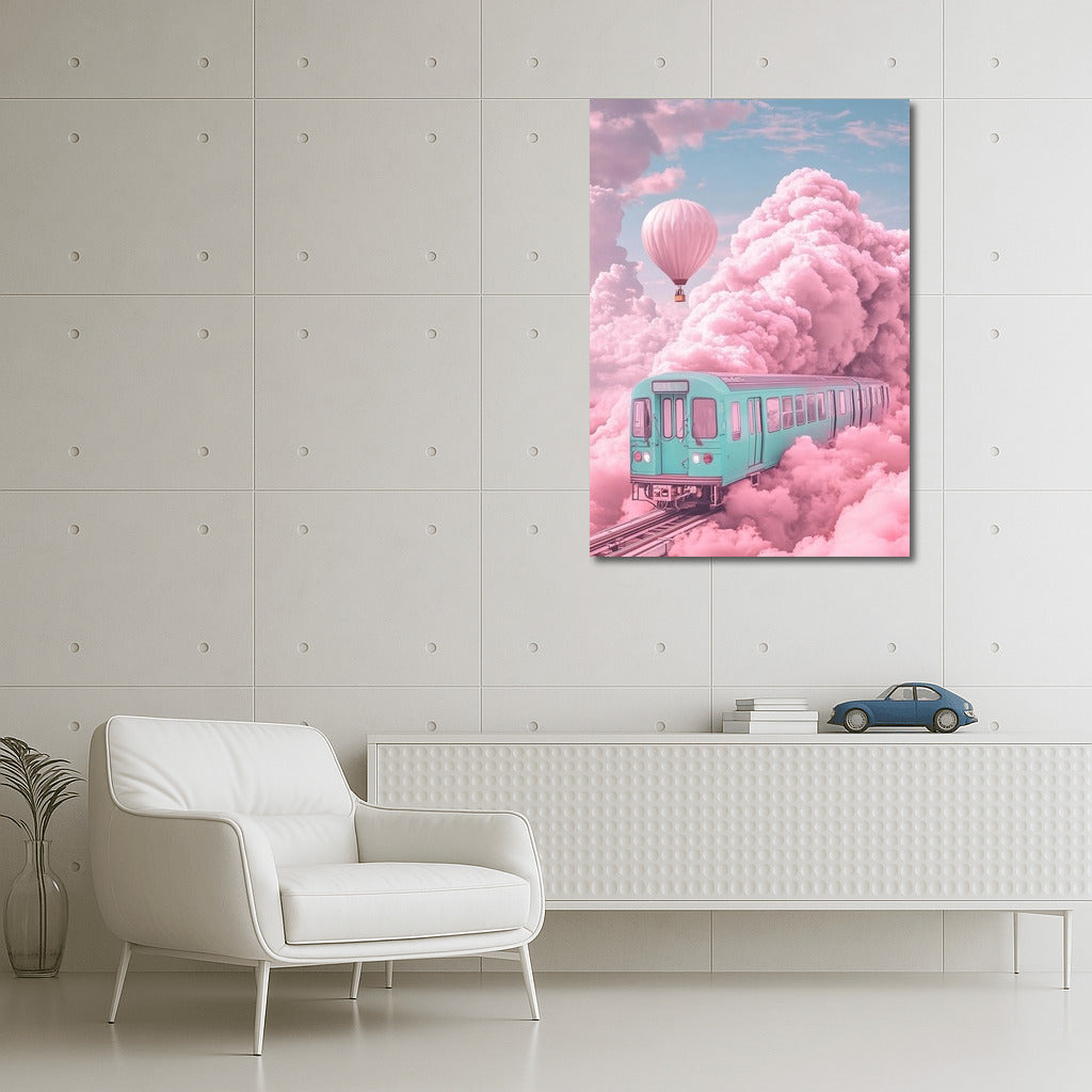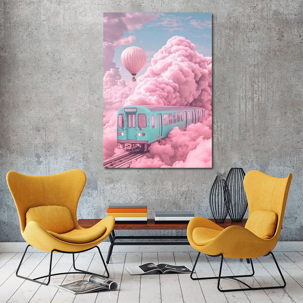 Dream train and hot air balloon in the clouds. This painting is a perfect poster for inspiration and adding magic to your walls! See more from the collection: Mixed Wall Art