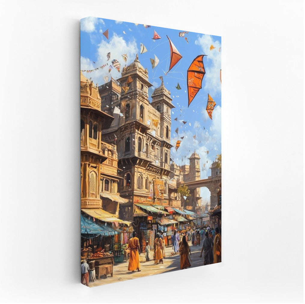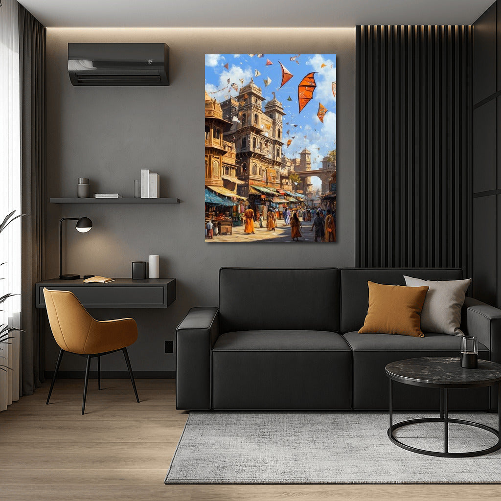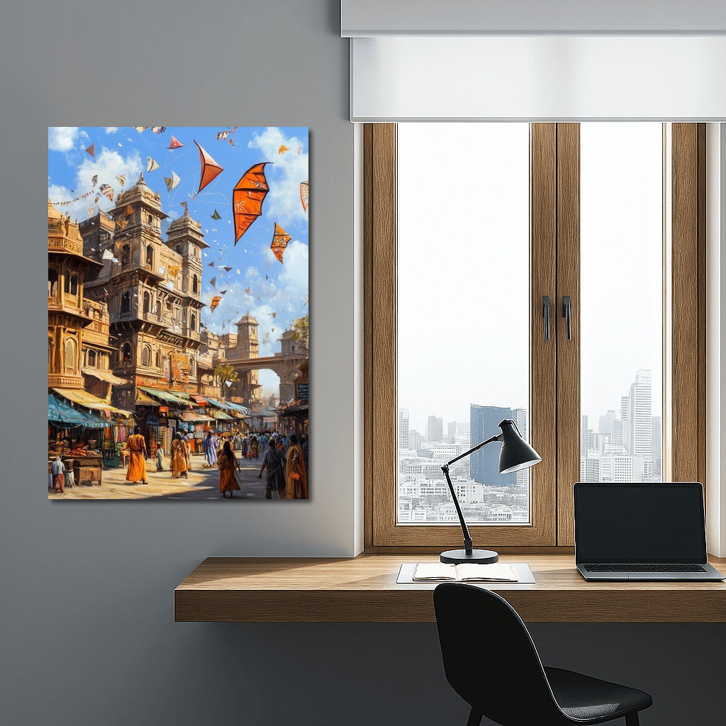Vibrant wall art: kites flying over a busy street where the past meets the future. The atmosphere of the East in every detail. See more from the collection: Country Art