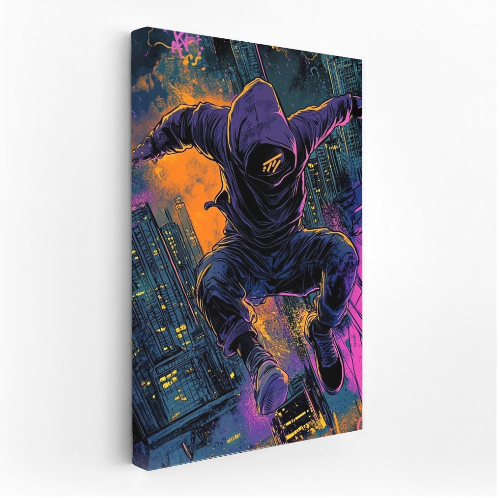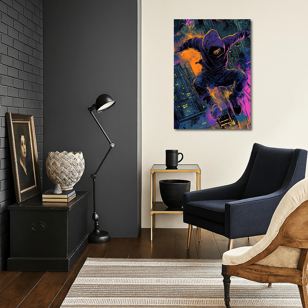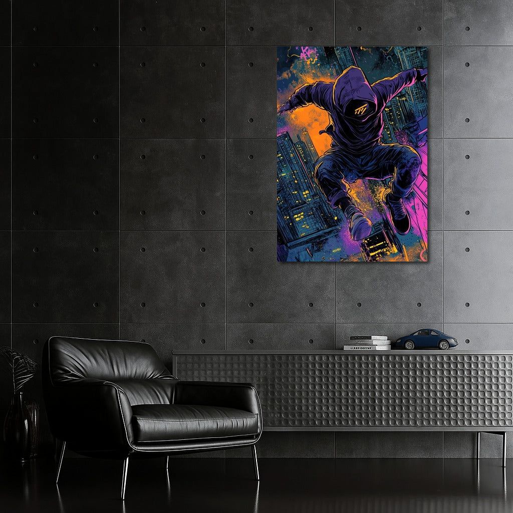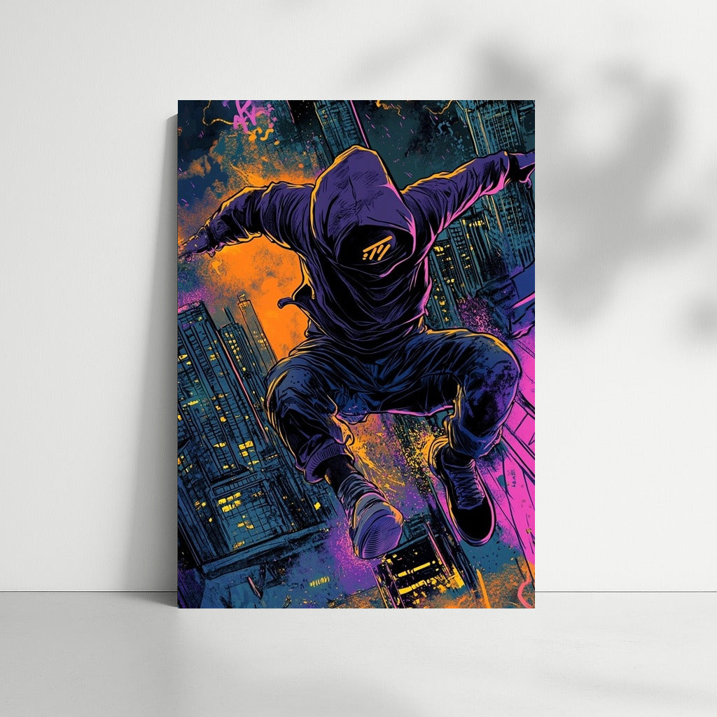 Graffiti explosion in motion: a mysterious figure hovers over a colorful city. The perfect poster for lovers of dynamic wall art! See more from the collection: Neon Art