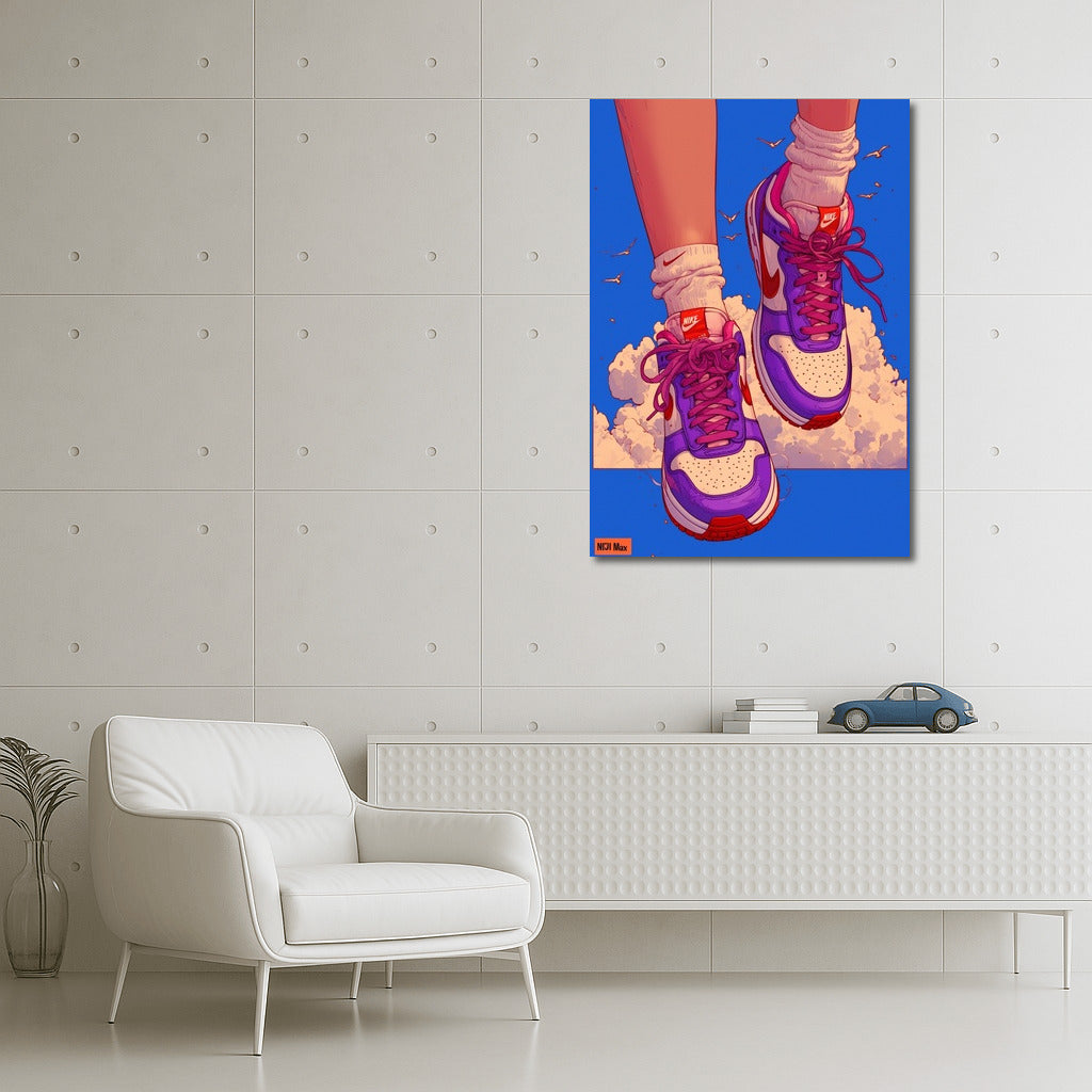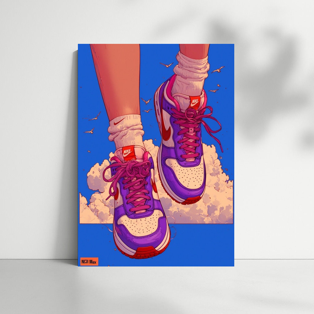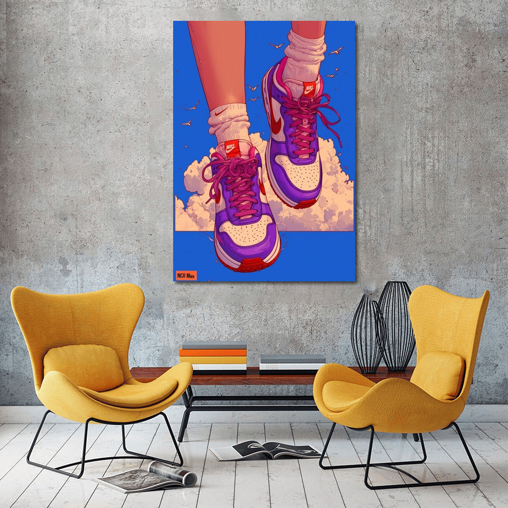 A bright poster with a girl soaring in the sky in stylish Nike sneakers. Add dynamics and freshness to your wall art! See more from the collection: Nike Art