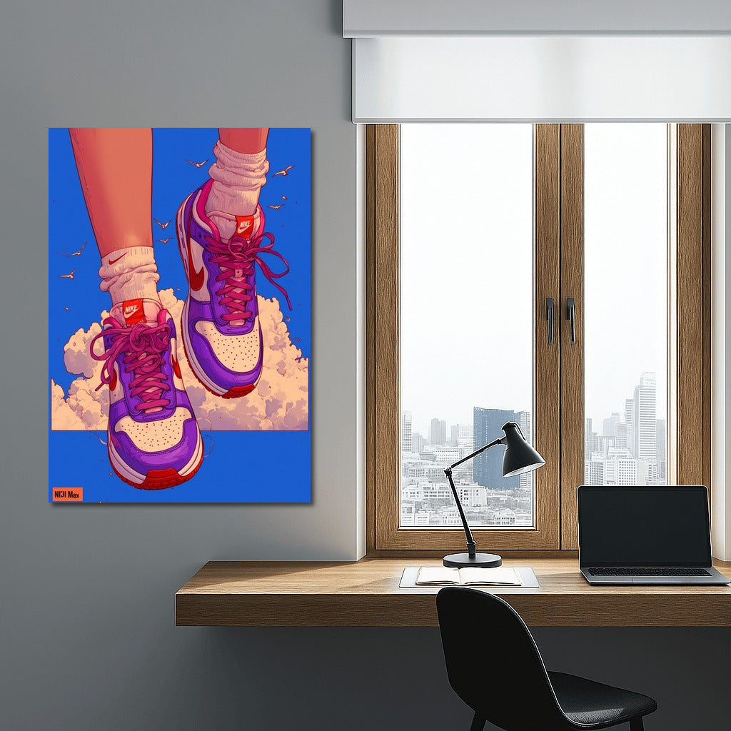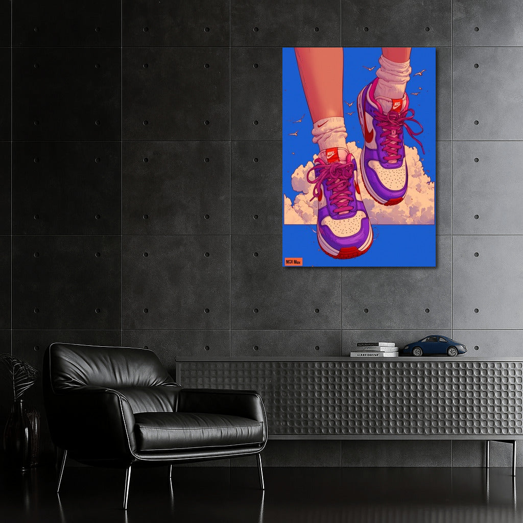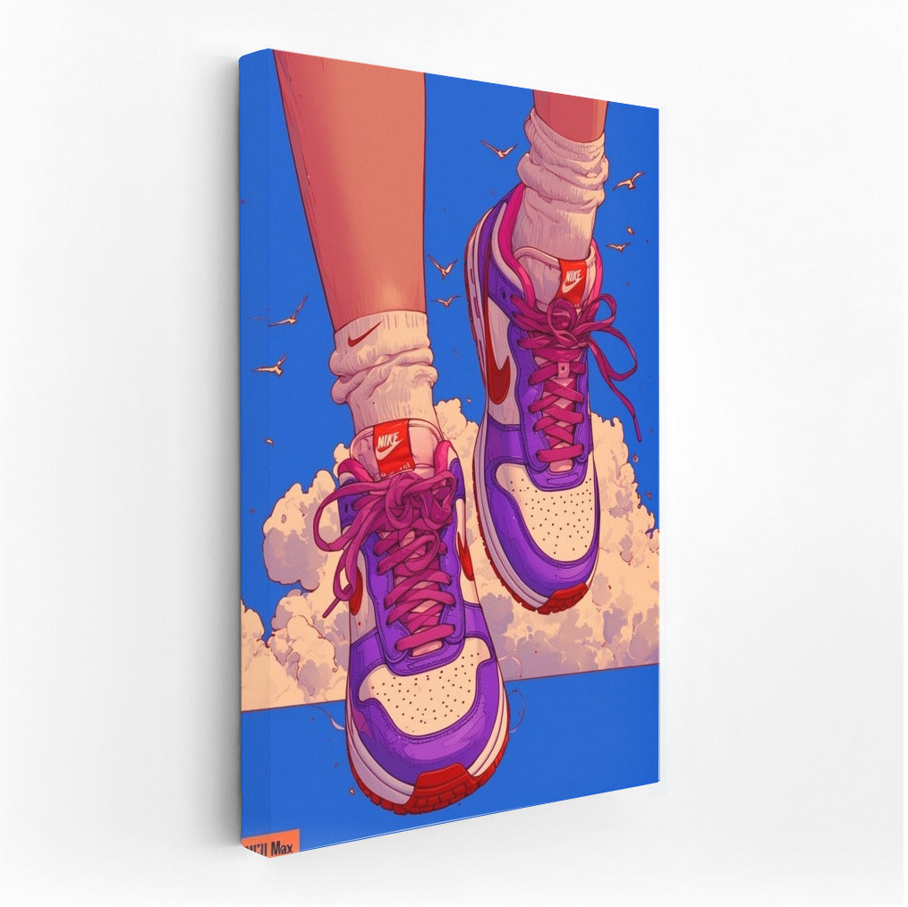 A bright poster with a girl soaring in the sky in stylish Nike sneakers. Add dynamics and freshness to your wall art! See more from the collection: Nike Art