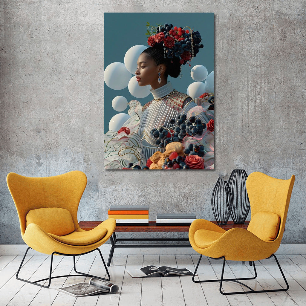 Delightful wall art: girl surrounded by flowers and fruits. Add brightness and style to your interior with this poster! See more from the collection: Fashion Art