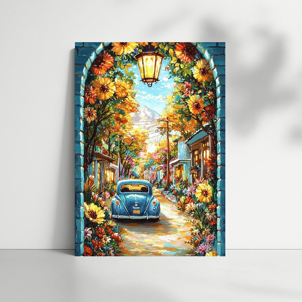 A fairytale journey through a flower paradise with a retro Volkswagen. A poster for dreamers looking for the perfect wall art. See more from the collection: Volkswagen Art