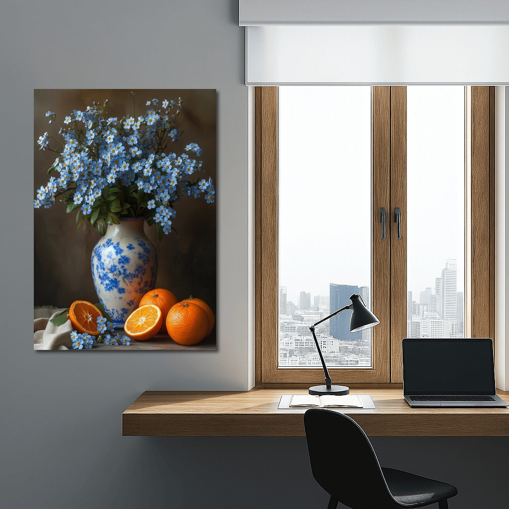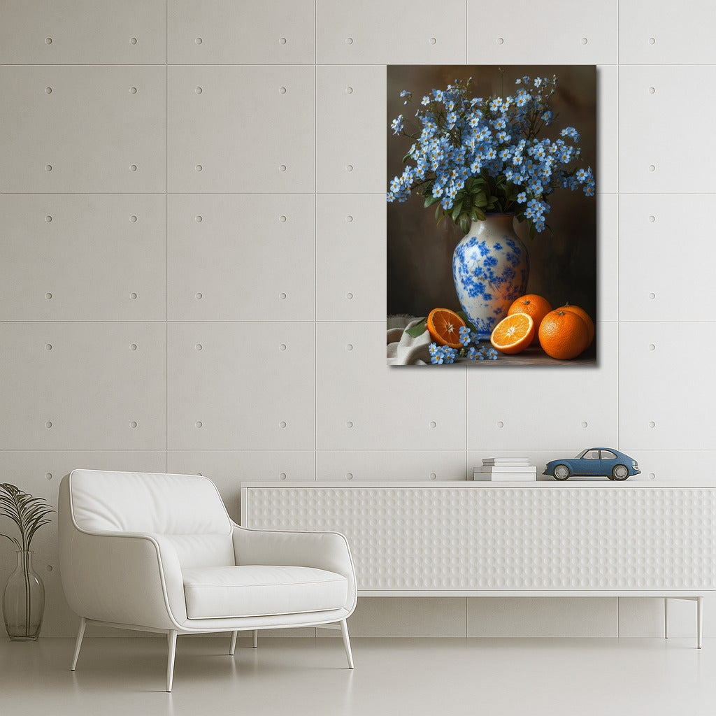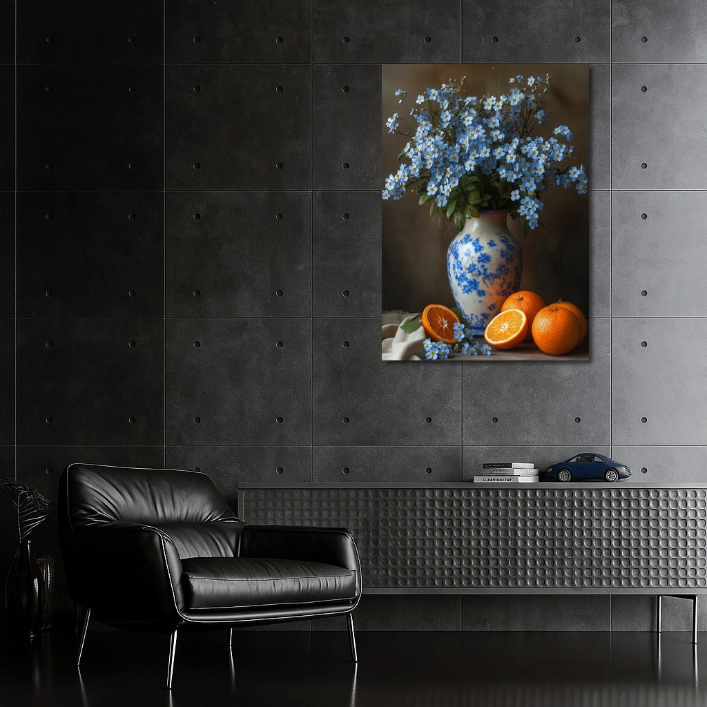 Bright poster with a bouquet of blue flowers and juicy oranges. Inspiring wall art for coziness and harmony. See more from the collection: Blue Flowers Art