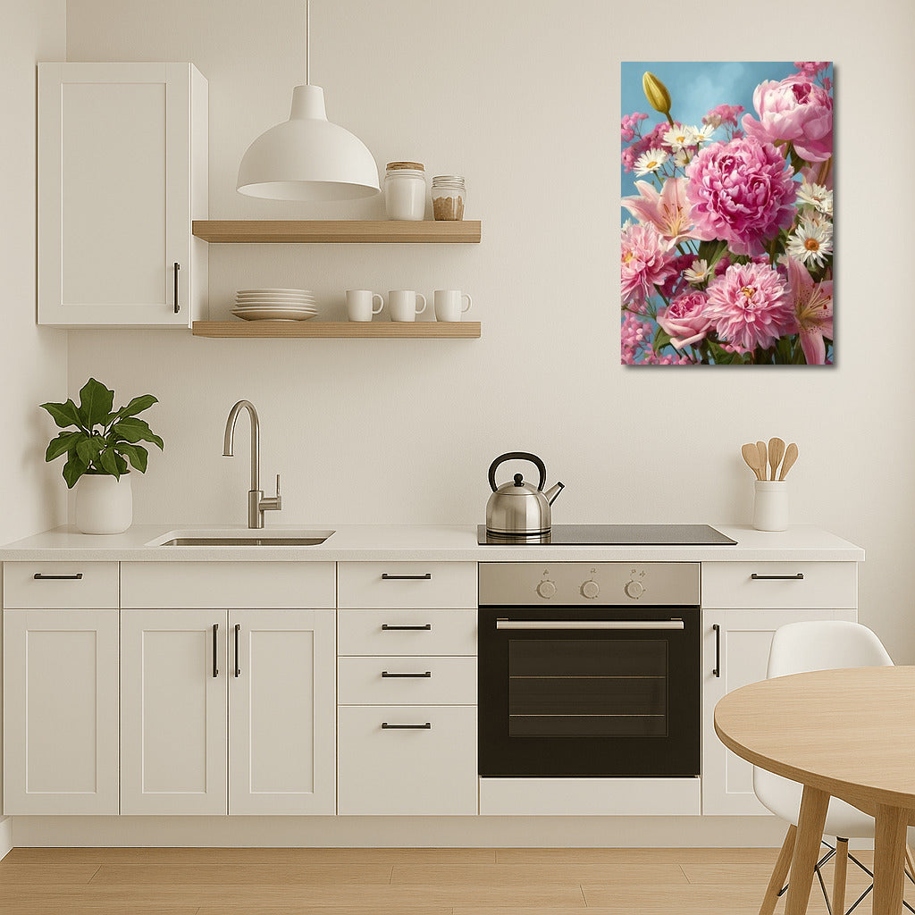 Luxurious peonies, lilies and daisies create a bright accent in this painting. Liven up the interior with a poster with floral magic! See more from the collection: Flowers Art