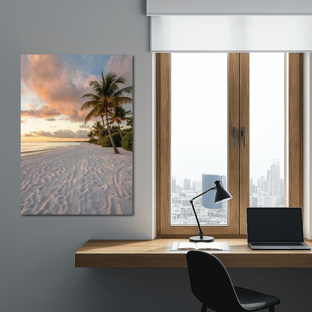 Sunny Florida paradise on your poster: white sand, palm trees and gentle clouds. Wall art for dreamers. See more from the collection: Country Art