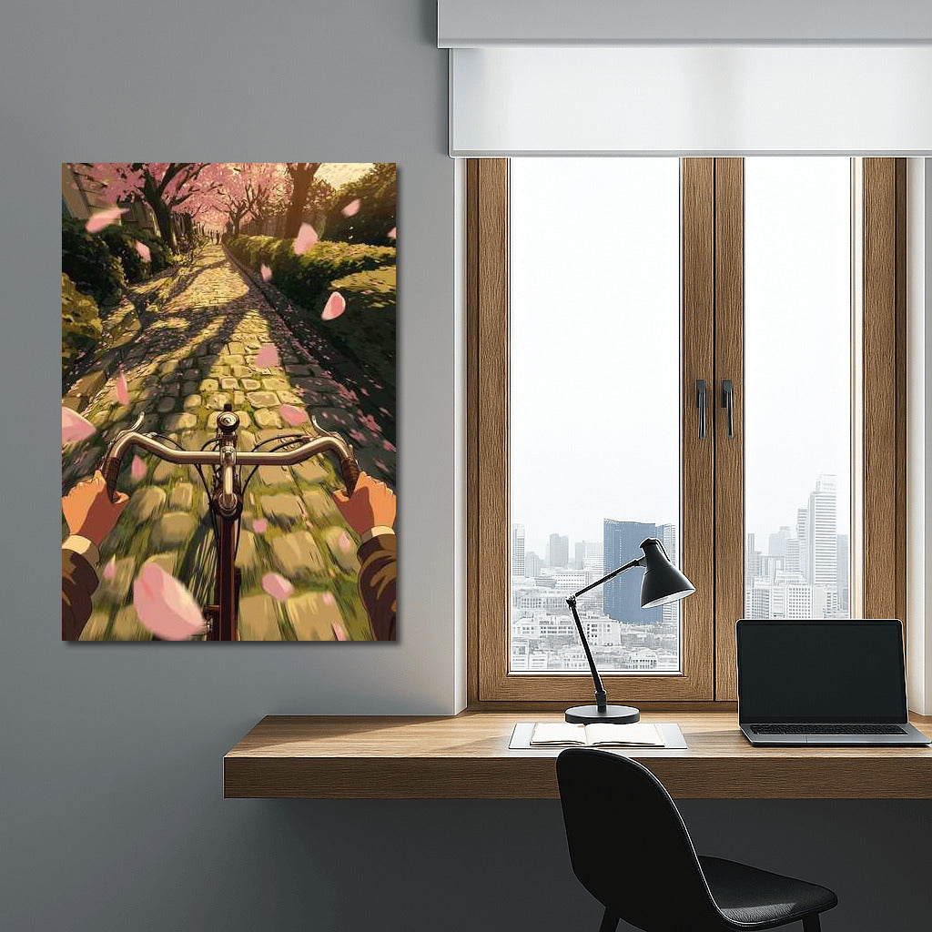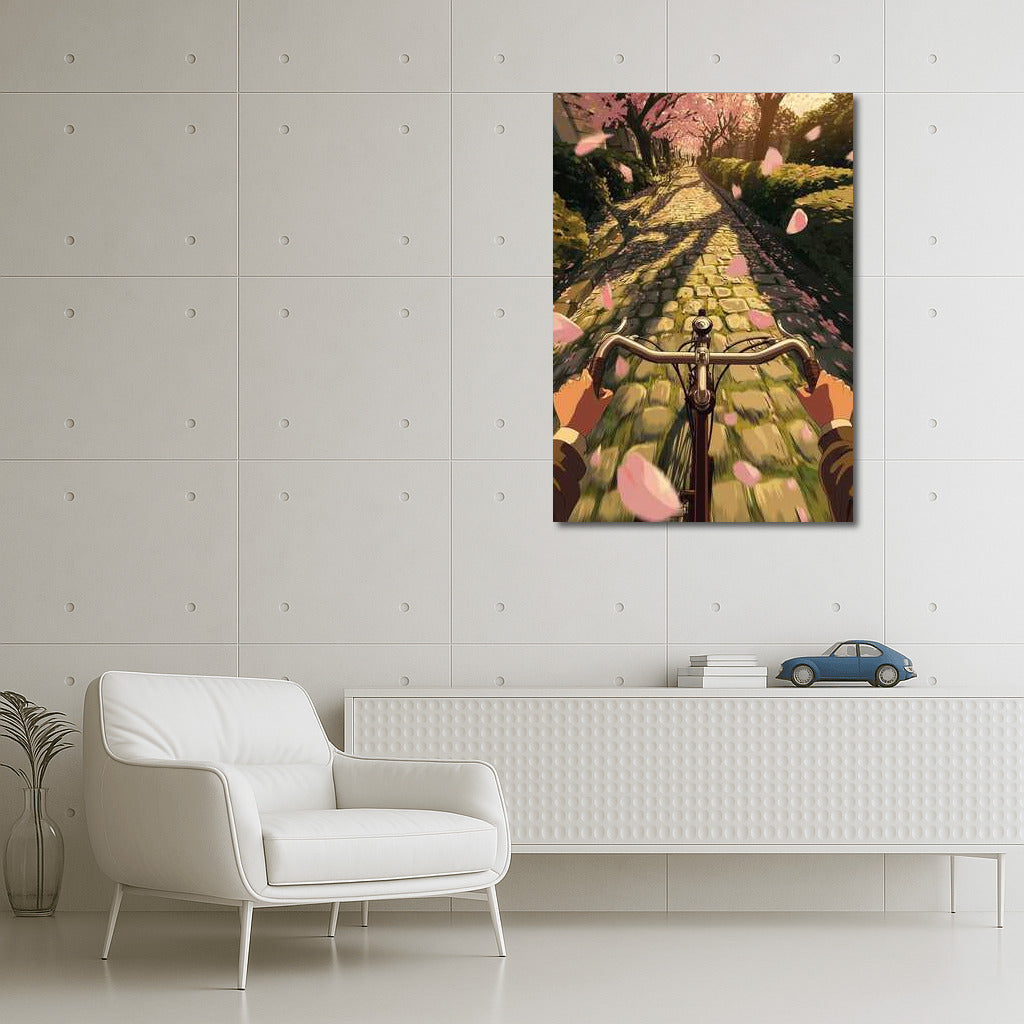 Dive into a dreamy journey along a flowery alley with this bicycle. A poster for those who appreciate aesthetics in motion. See more from the collection: Bicycle Art