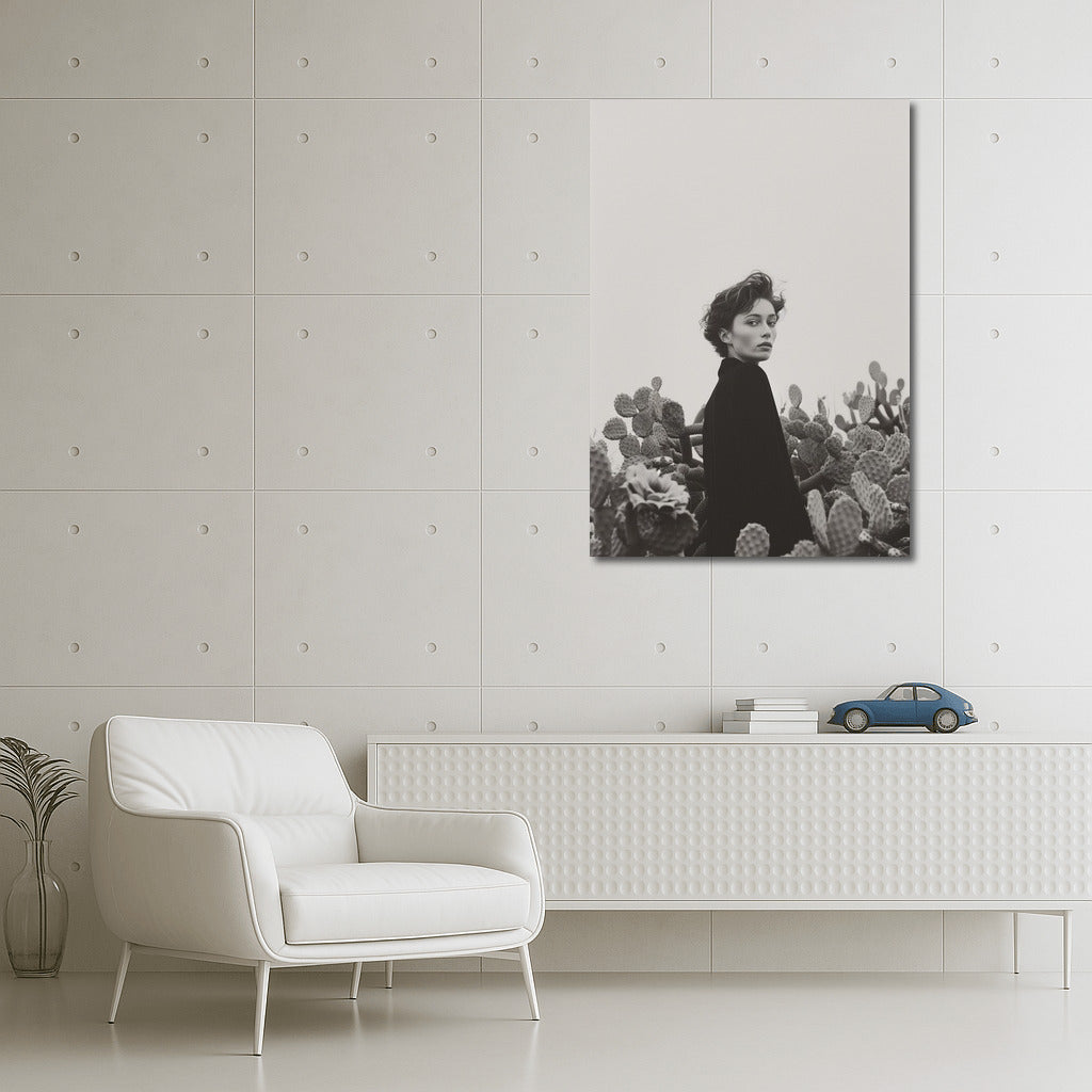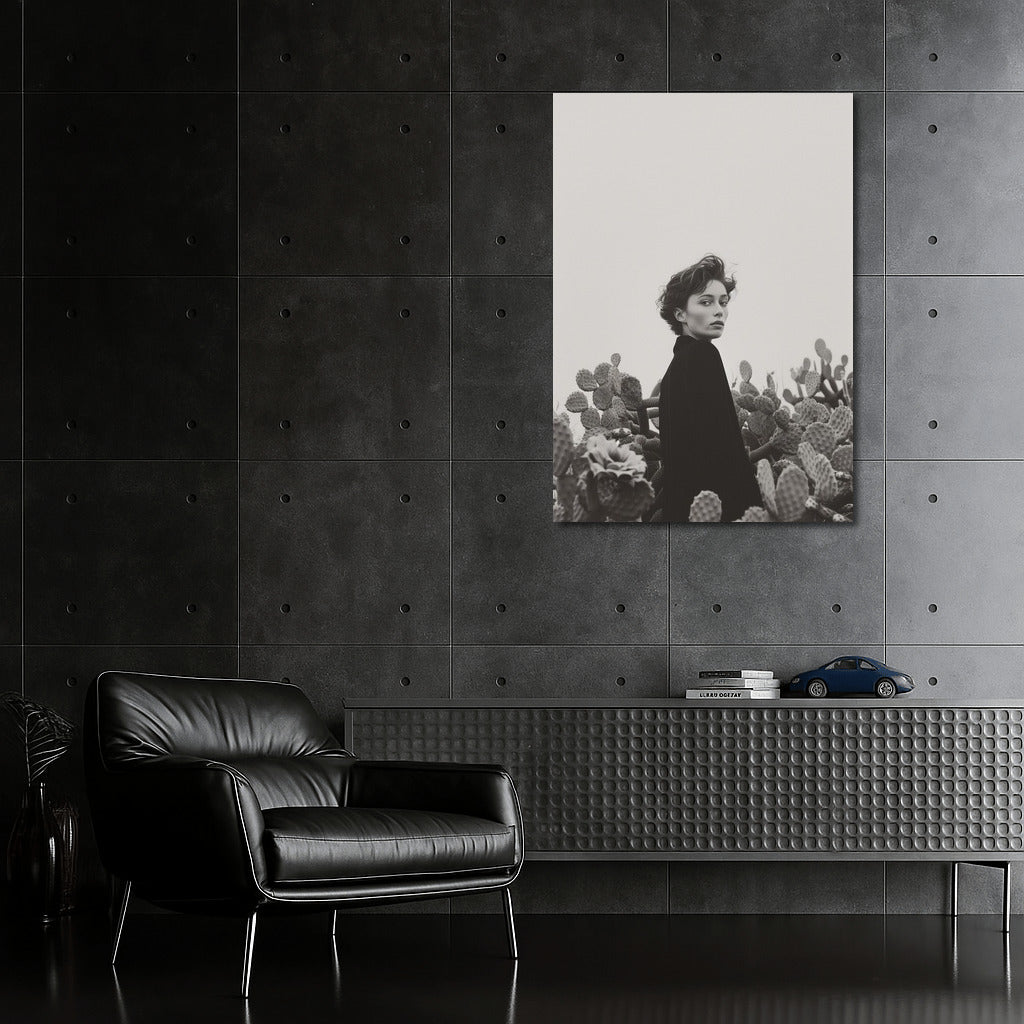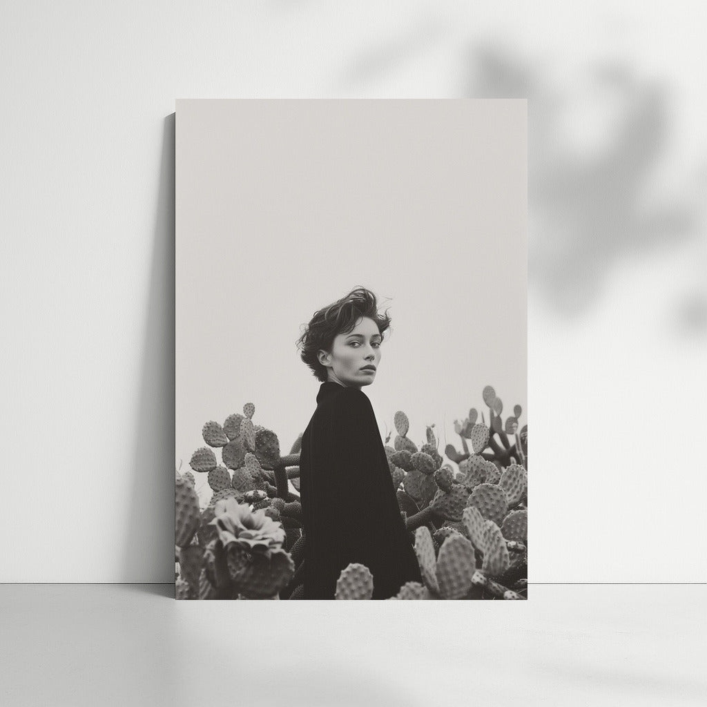 Exclusive art poster: girl among prickly cacti. Aesthetics of loneliness and strength in wall art. See more from the collection: Black and White Art