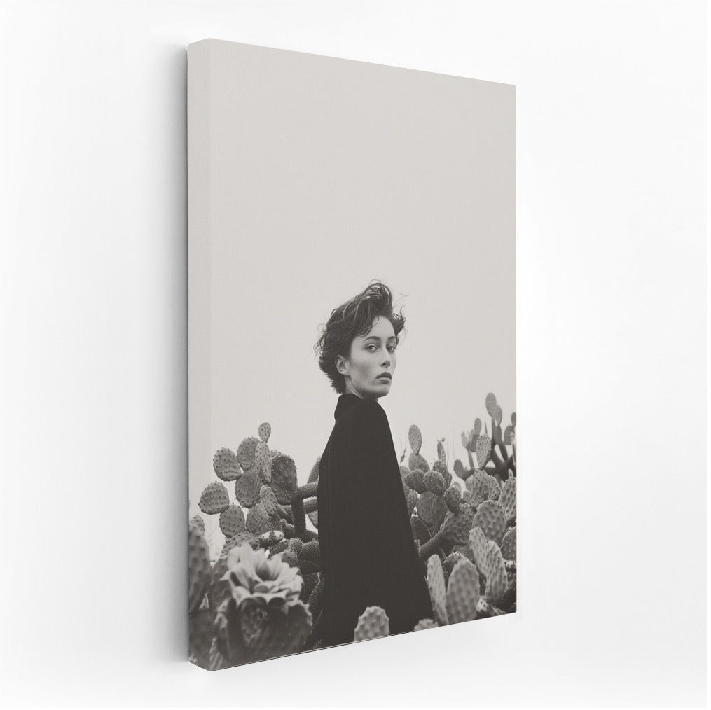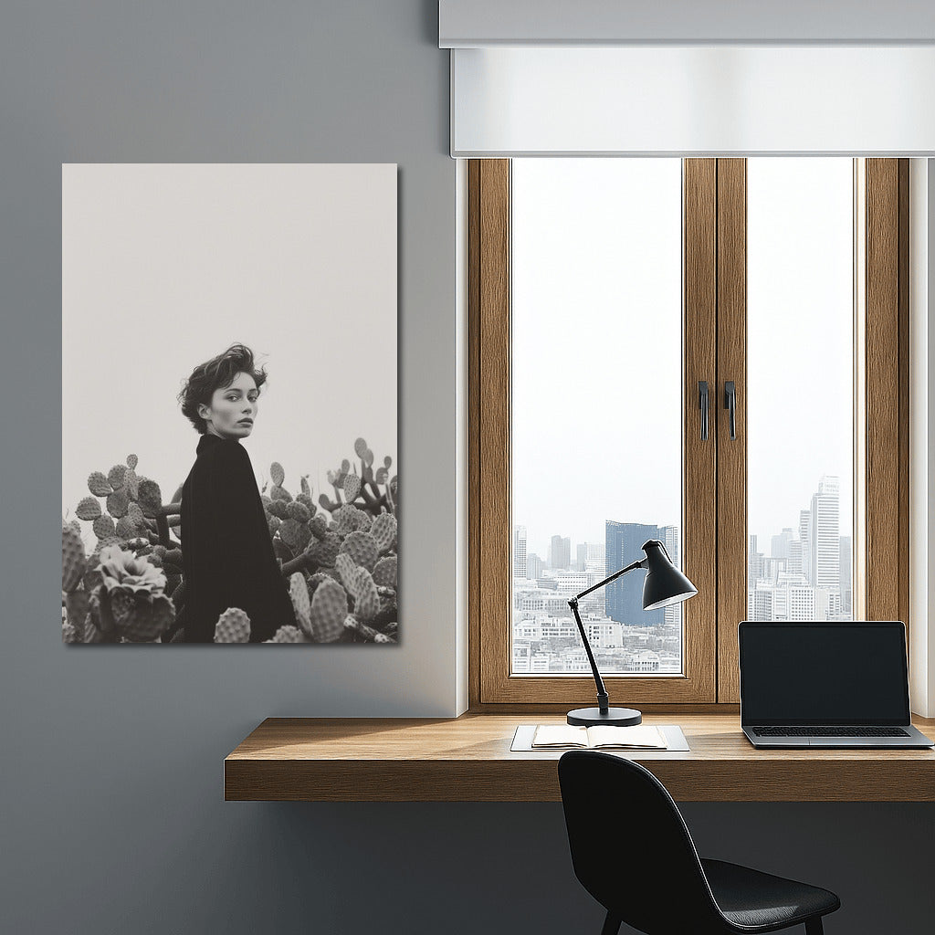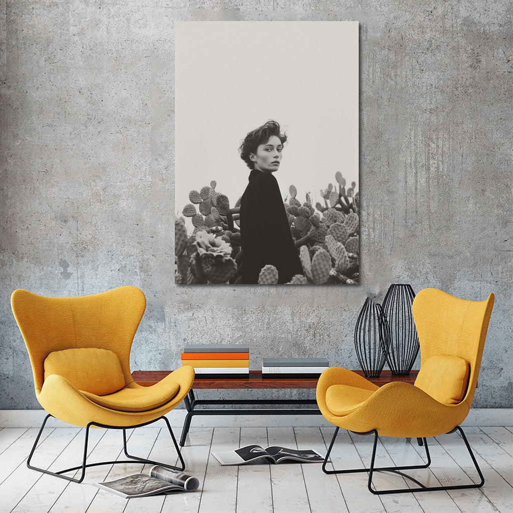 Exclusive art poster: girl among prickly cacti. Aesthetics of loneliness and strength in wall art. See more from the collection: Black and White Art