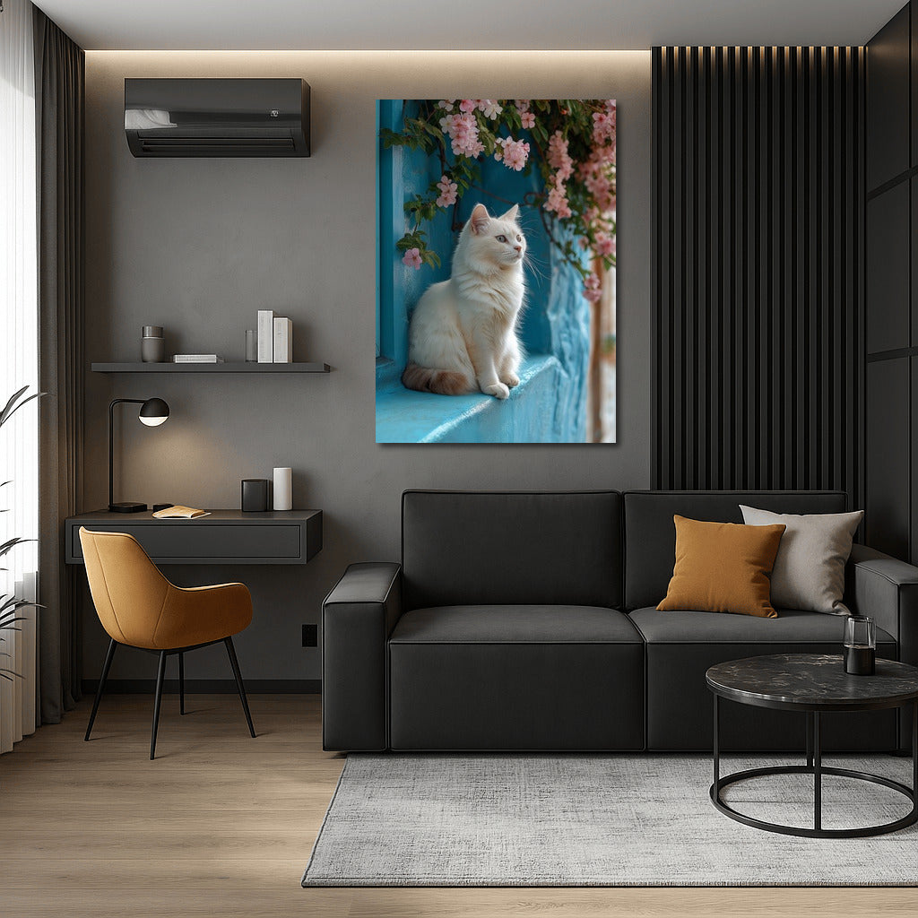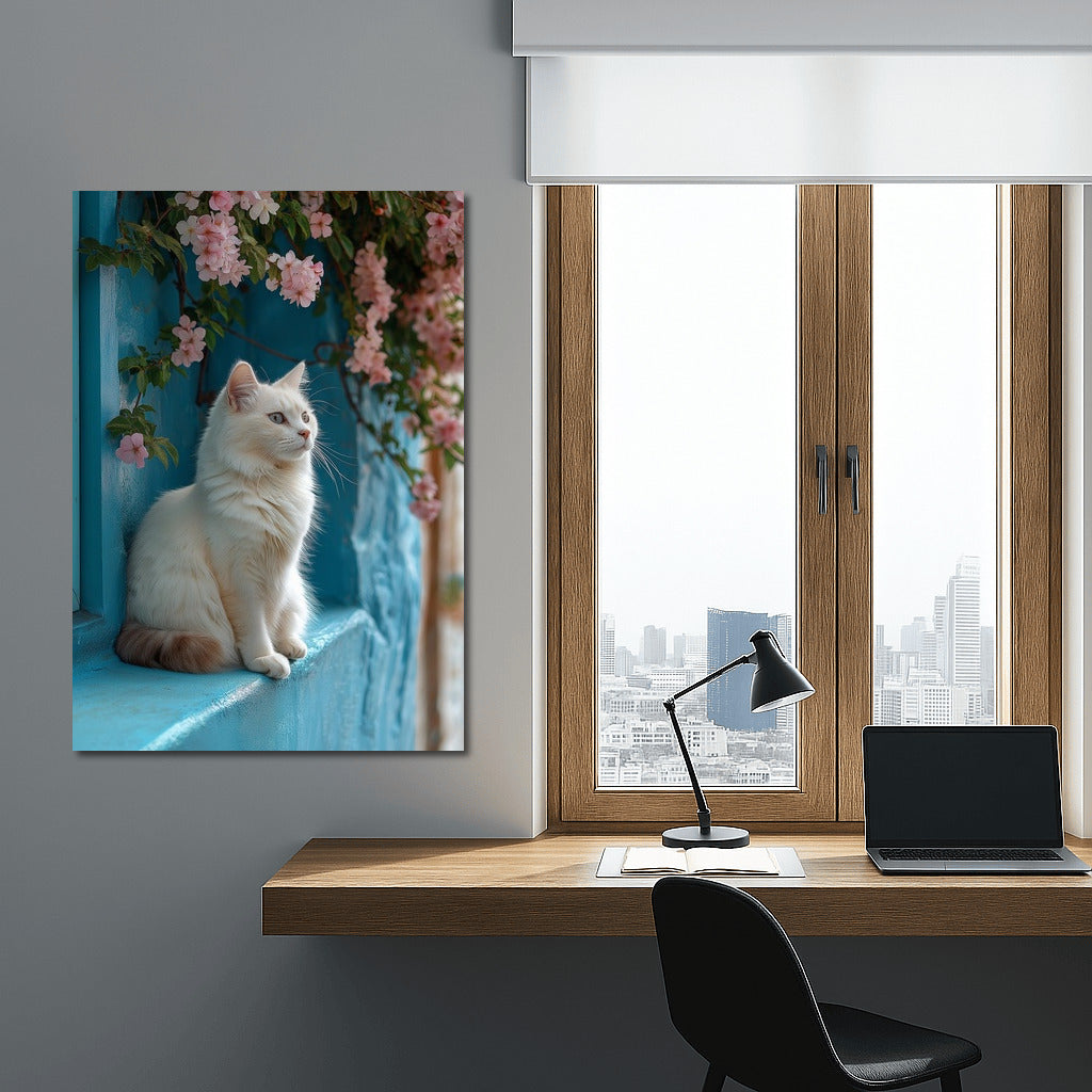 A cat surrounded by delicate flowers on a blue background. This poster will create an atmosphere of coziness and lightness in your interior. See more from the collection: Animals Art
