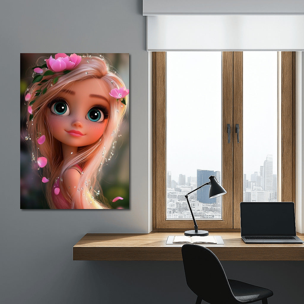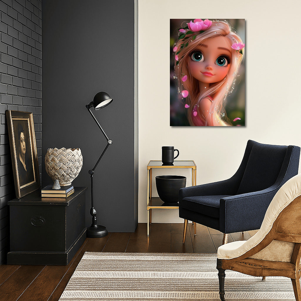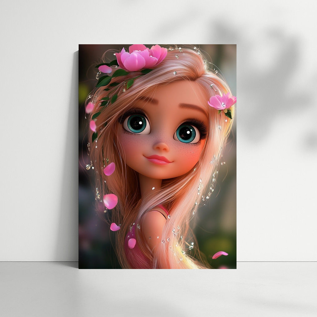 A vibrant poster featuring a charming character and floral accents. Add a fairytale glow to your wall art! See more from the collection: Art For Girls