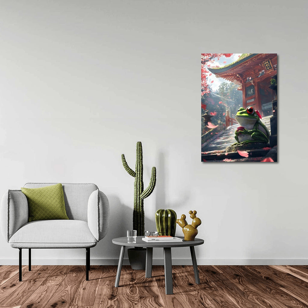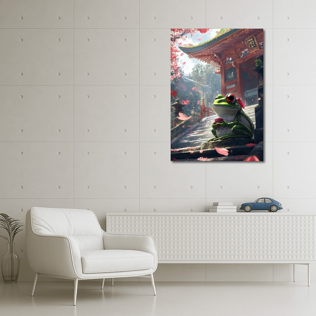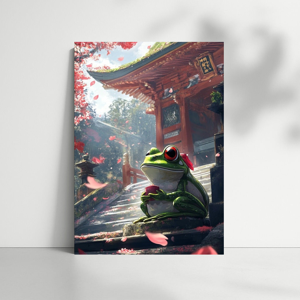 Frog in the Garden Poster: A magical wall art featuring a frog with flowers and a temple in the background. Perfect for creating a cozy atmosphere. See more from the collection: Mixed Wall Art