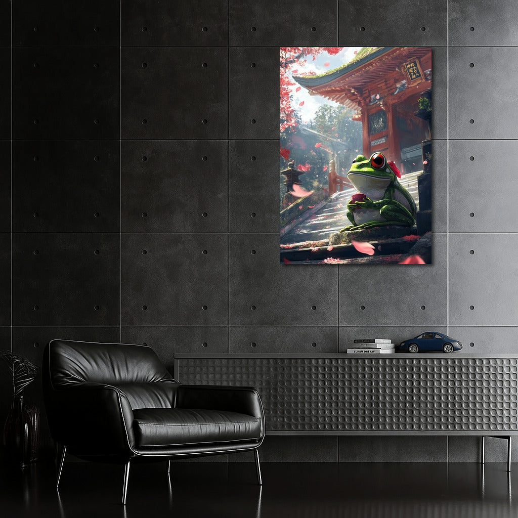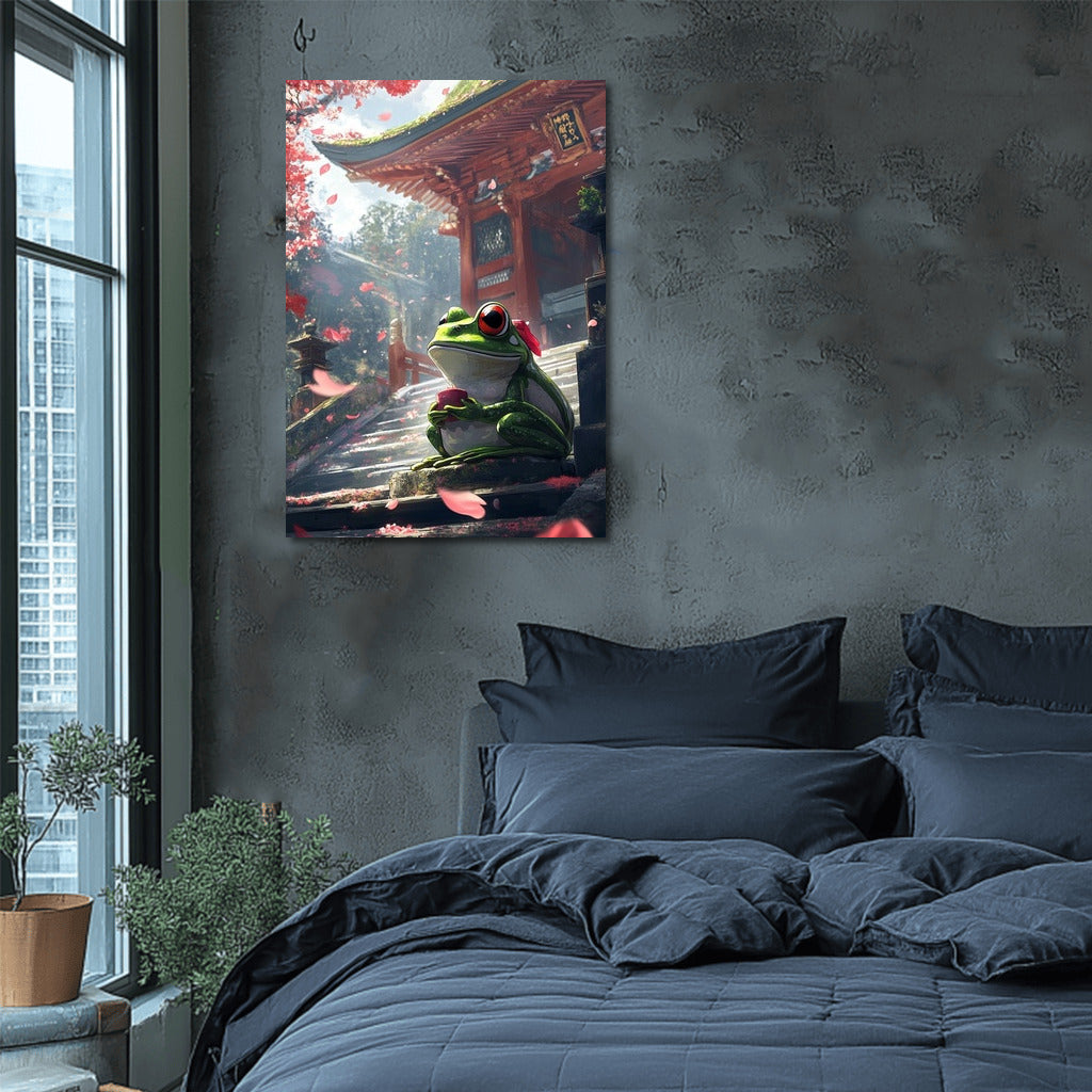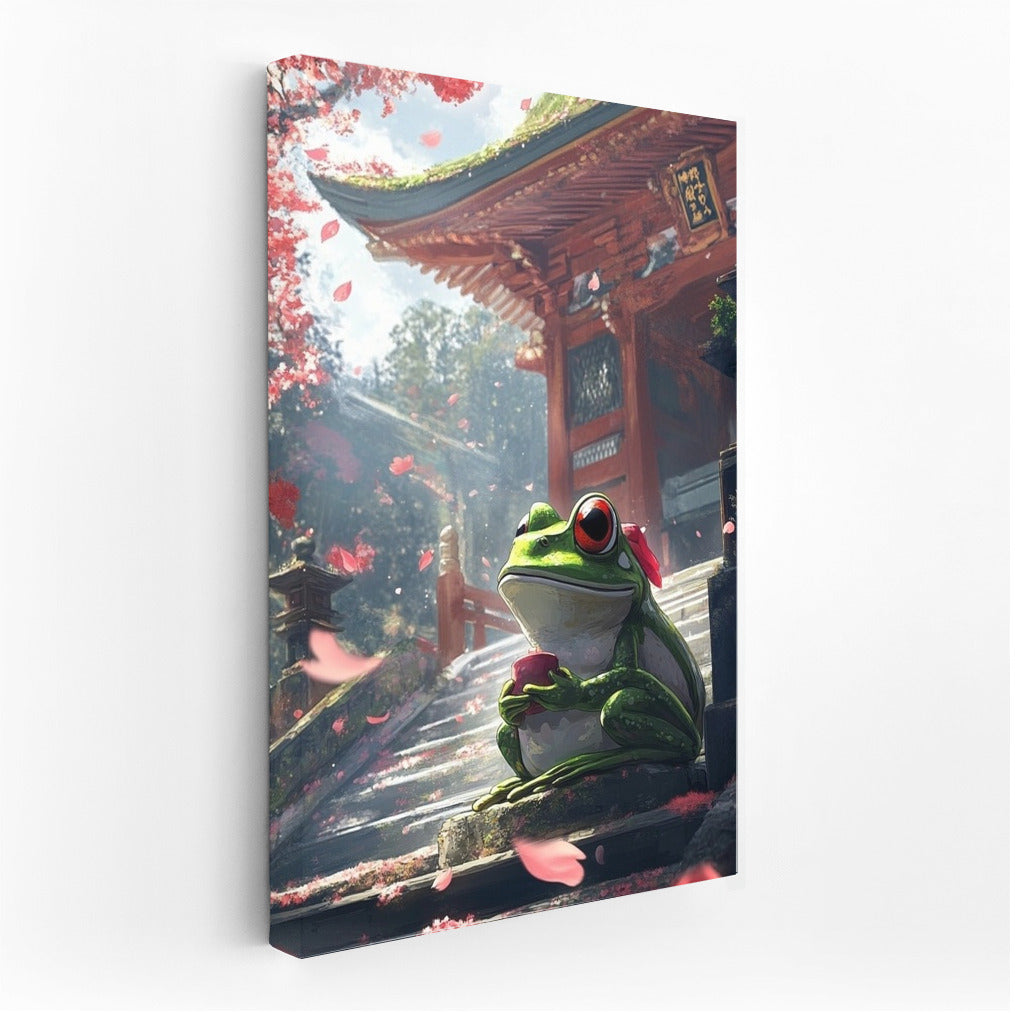 Frog in the Garden Poster: A magical wall art featuring a frog with flowers and a temple in the background. Perfect for creating a cozy atmosphere. See more from the collection: Mixed Wall Art