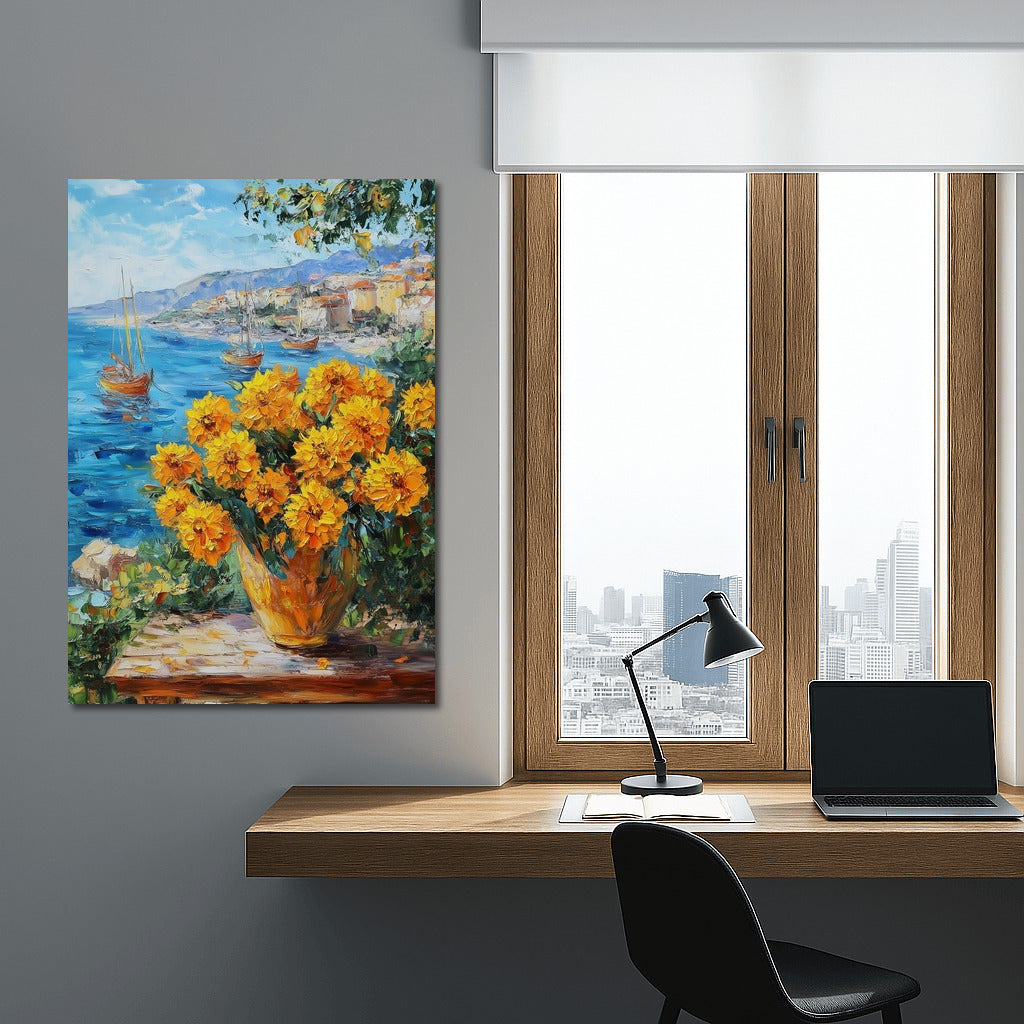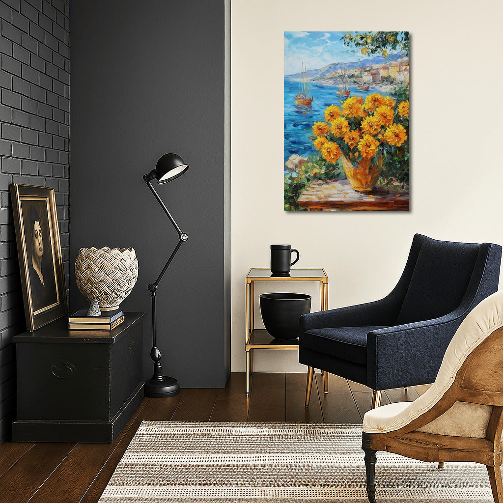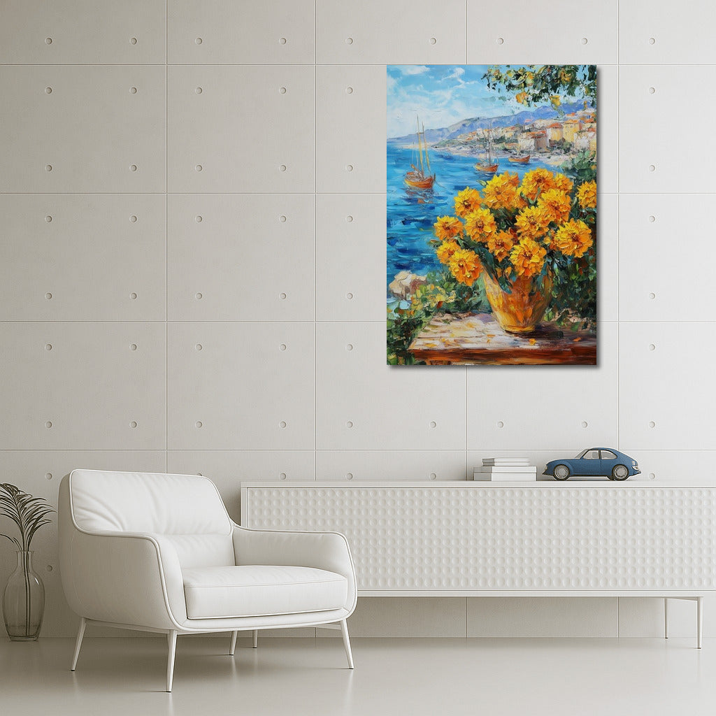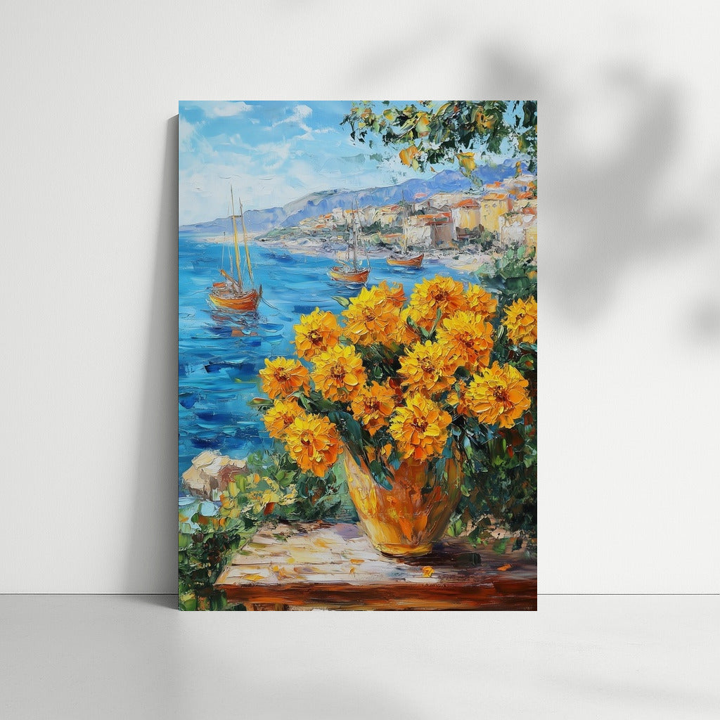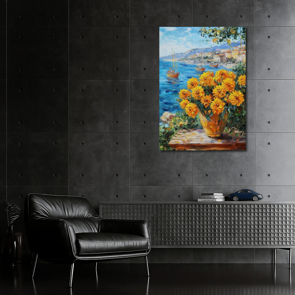 Bright poster: flowers in front of the sea harbor, immersing in the atmosphere of calm and sunny shore. Wall art of dreams. See more from the collection: Flowers Art