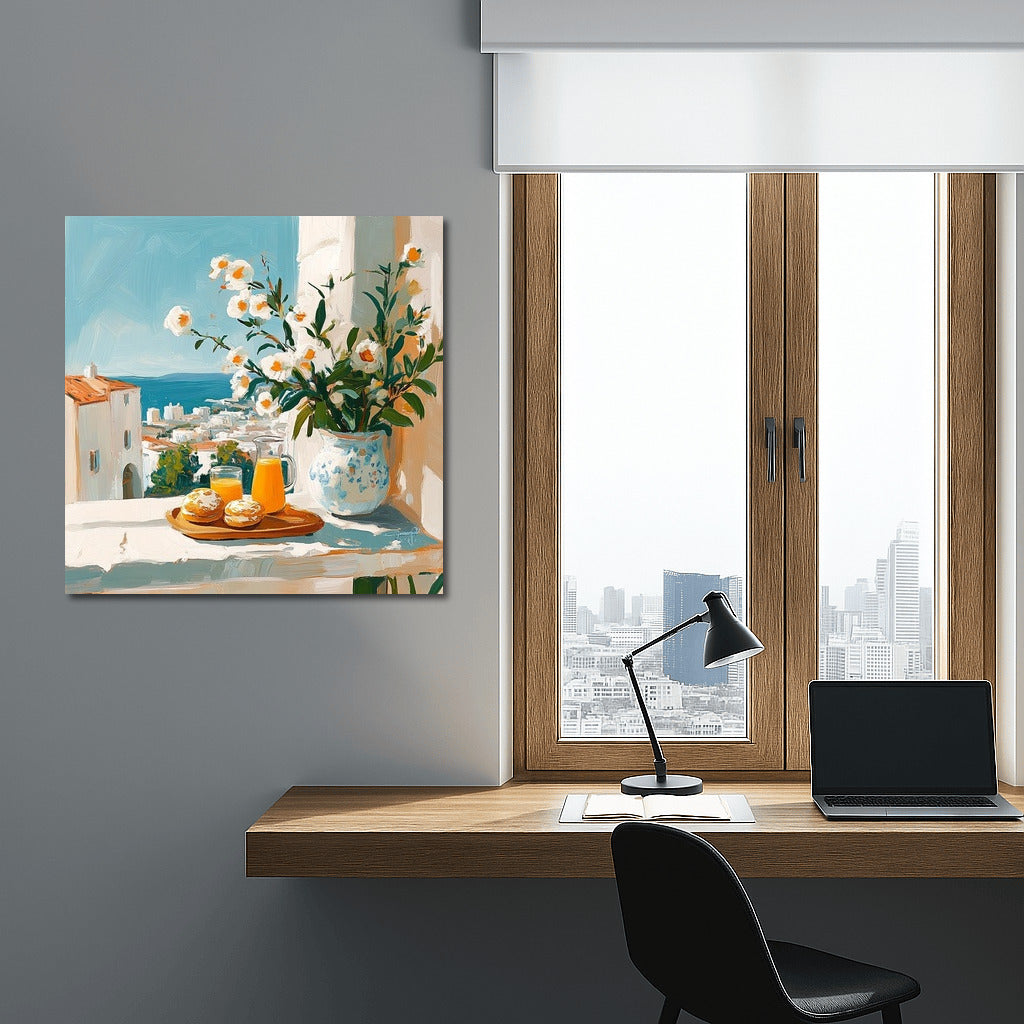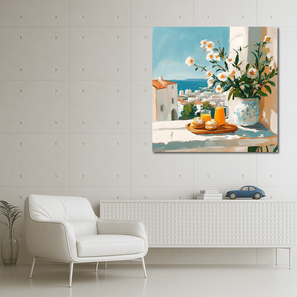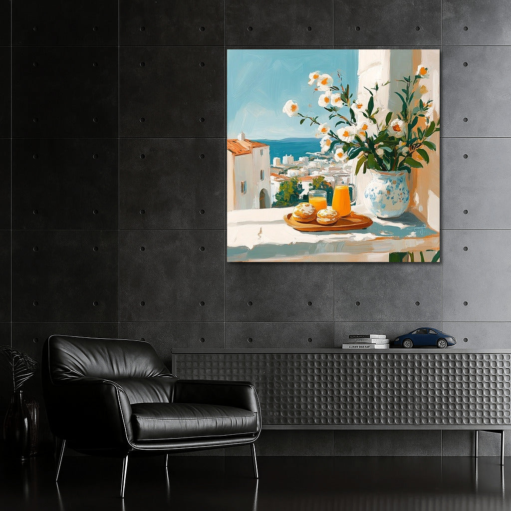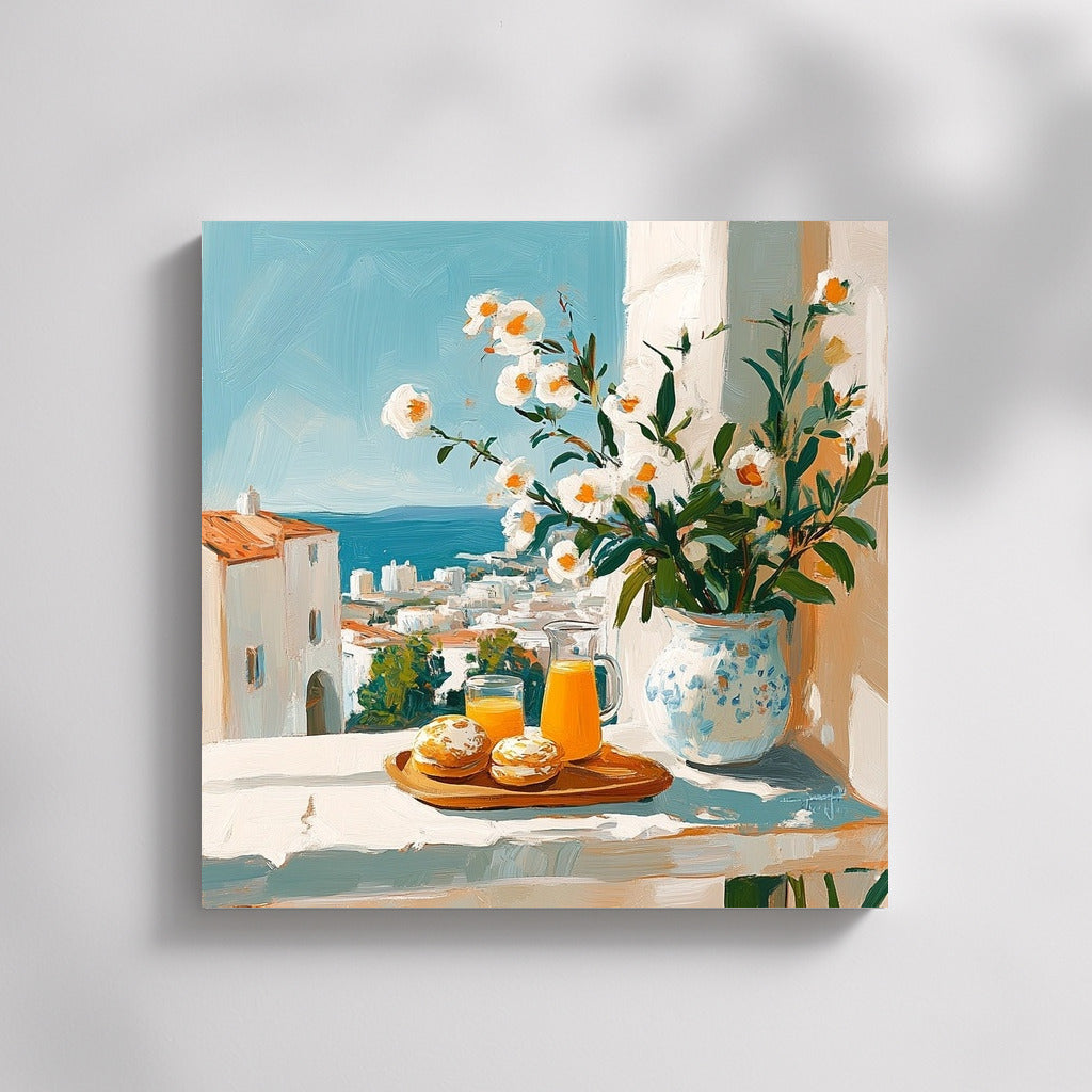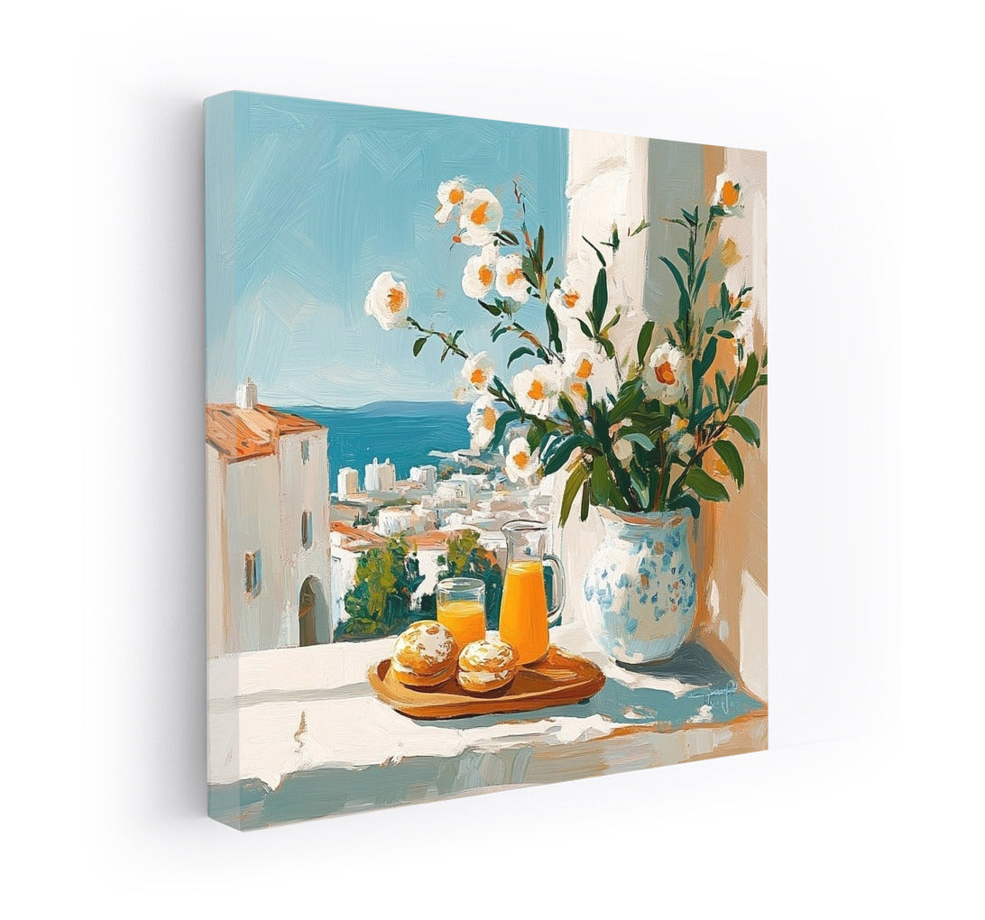 Summer day at the seaside: poster with a bouquet of flowers, juicy orange juice and sweets. A perfect accent for wall art. See more from the collection: Mixed Wall Art