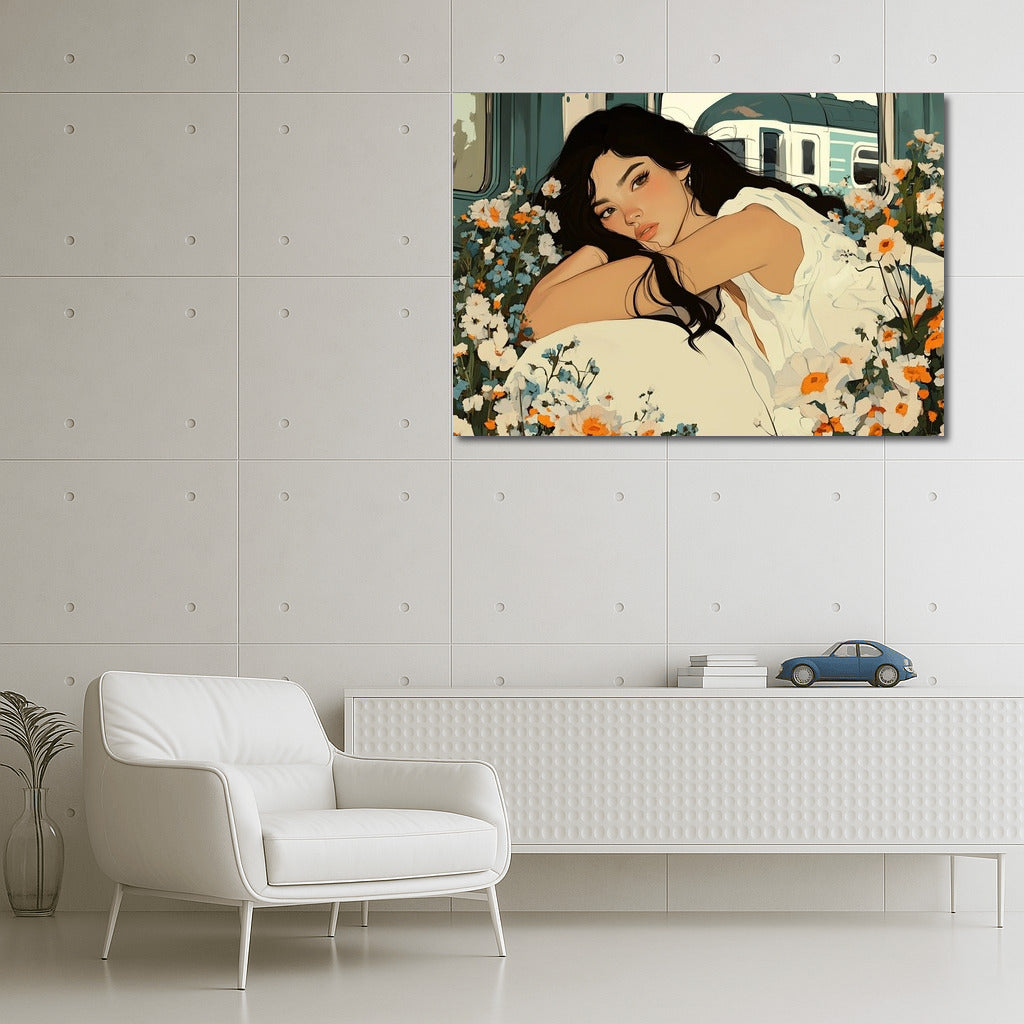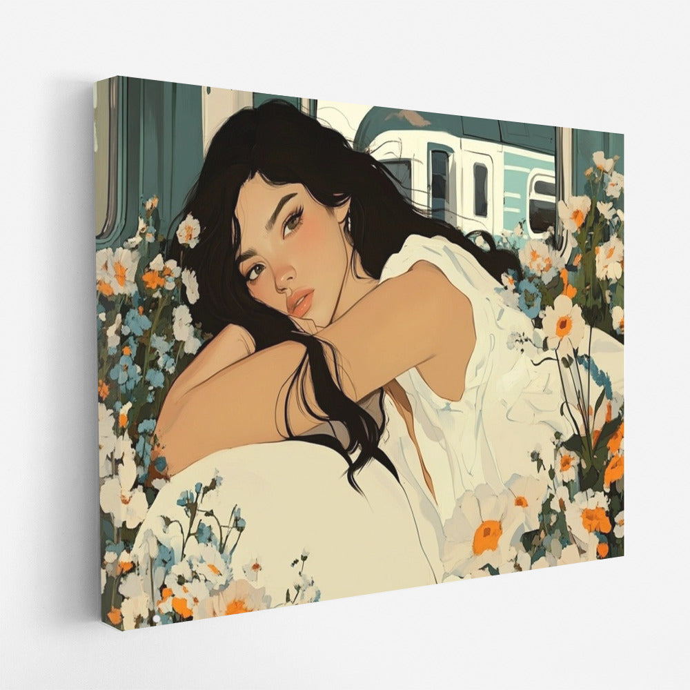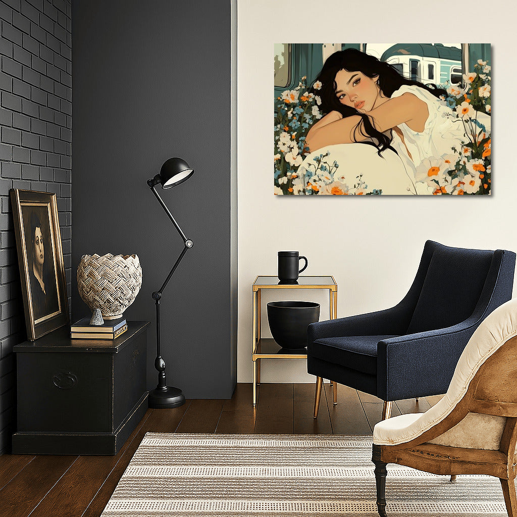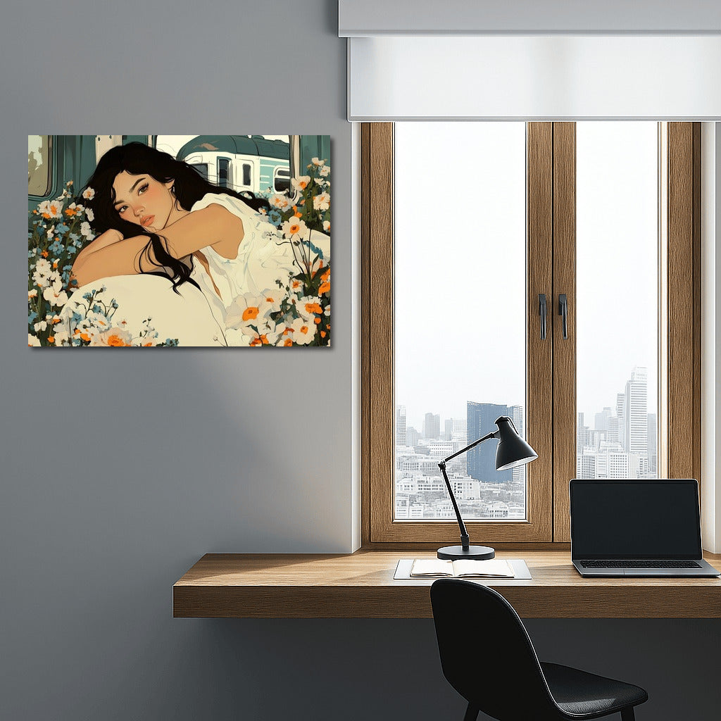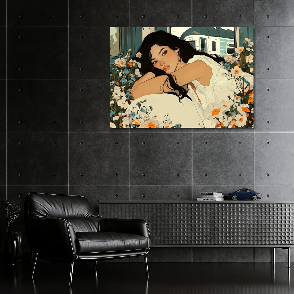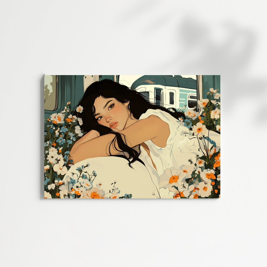 A girl in a flower field looks dreamily out of a train window. This poster will create an atmosphere of travel and tenderness in your home. See more from the collection: Mixed Wall Art