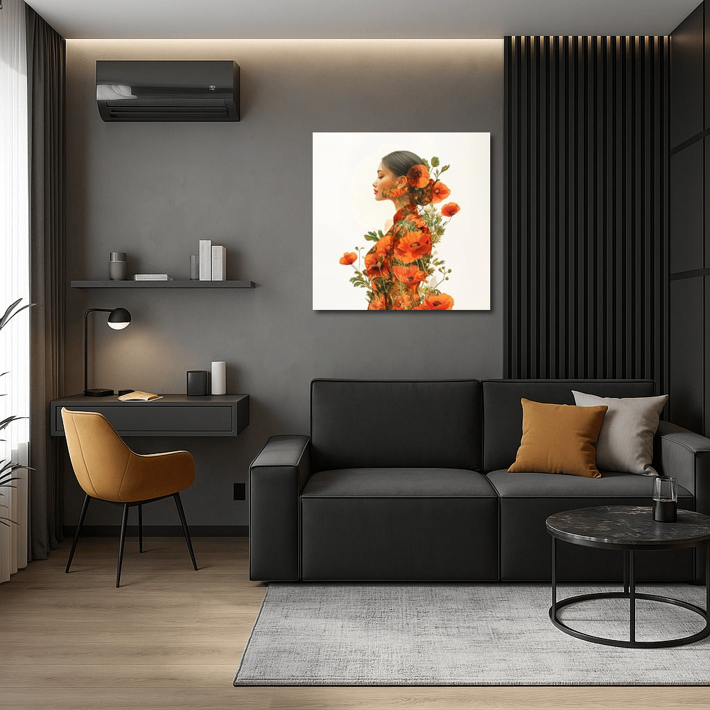 A painting of the fusion of nature and femininity: a mysterious figure in flowers. A poster of inspiration and harmony for your home. See more from the collection: Flowers Art