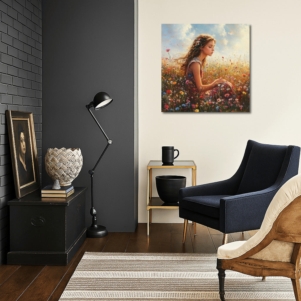 A gentle painting of a girl in a flower field. The poster will fill your interior with harmony and light. Wall art for the soul. See more from the collection: Wall Art with Women