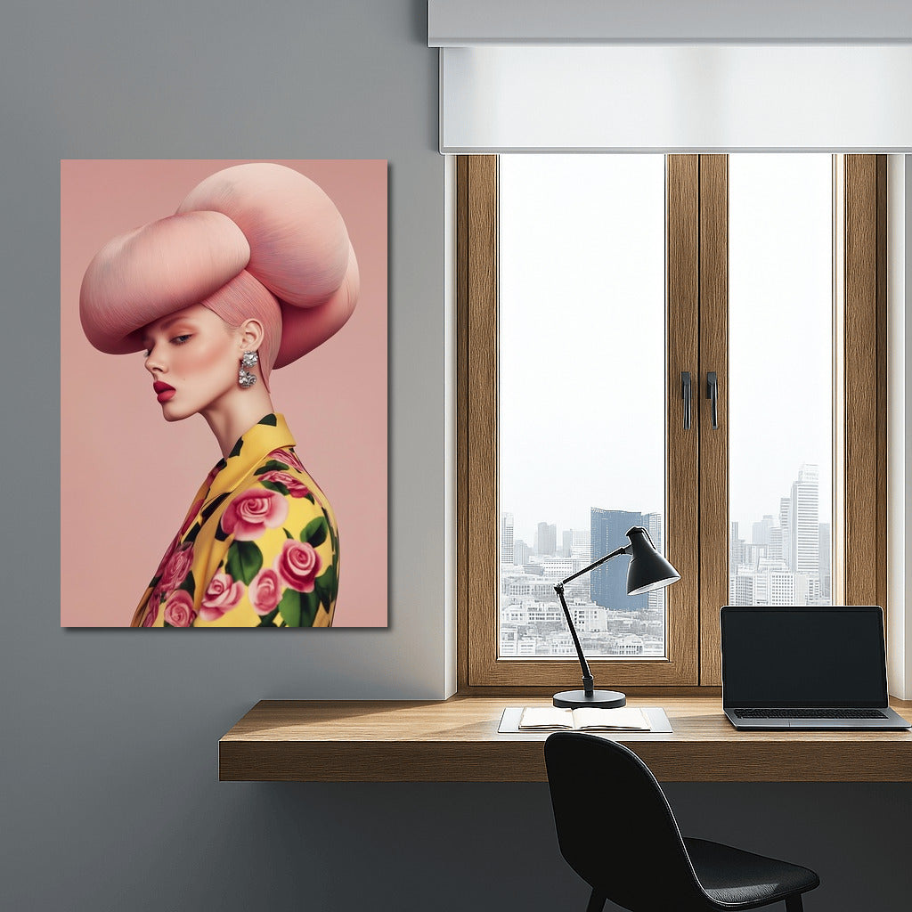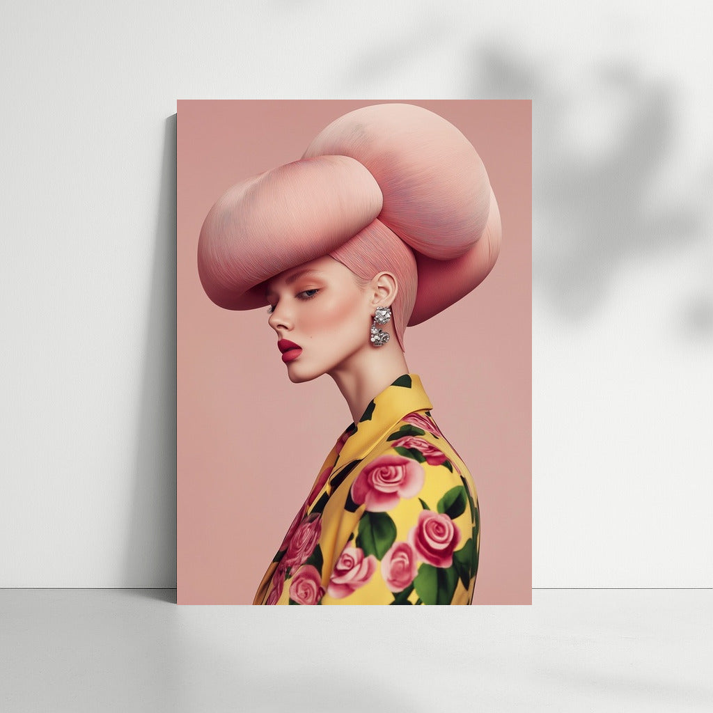 Modern painting: stylish girl with pink hair and in a flowery outfit. The perfect poster for an accent in the interior! See more from the collection: Fashion Art