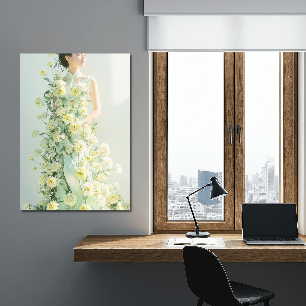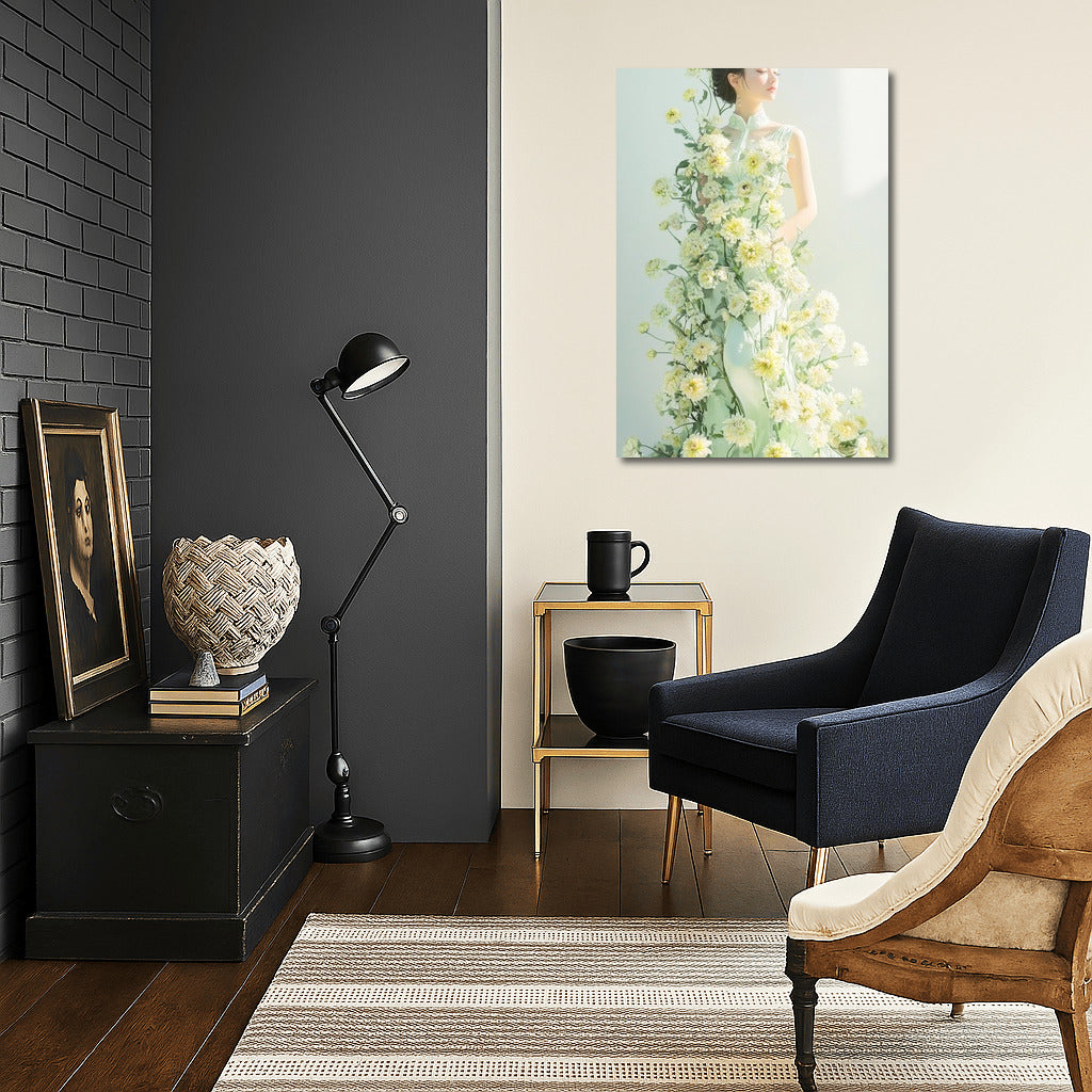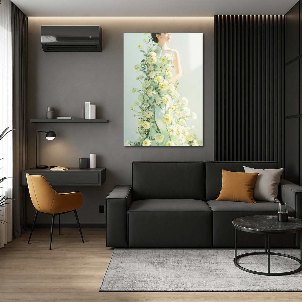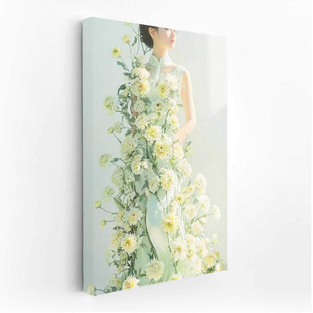 Ephemeral wall art: a girl drowning in white flowers creates an atmosphere of tenderness and dreaminess. See more from the collection: Fashion Art