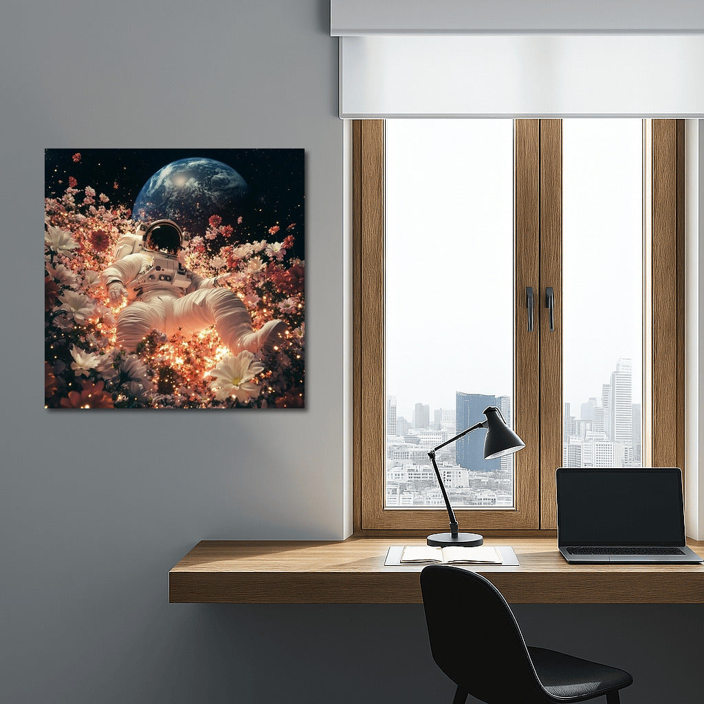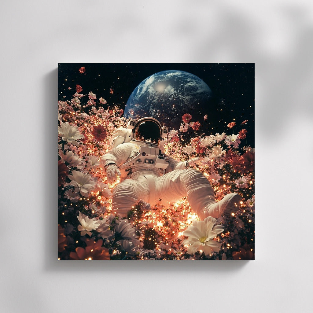 Space Dream: A poster of an astronaut floating among flowers with the Earth in the background. Perfect wall art for fantasy lovers. See more from the collection: Space & Astronomy Art