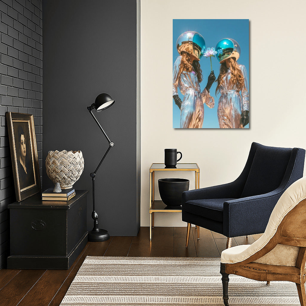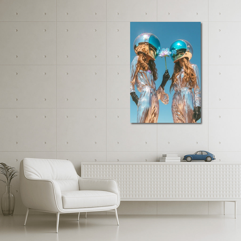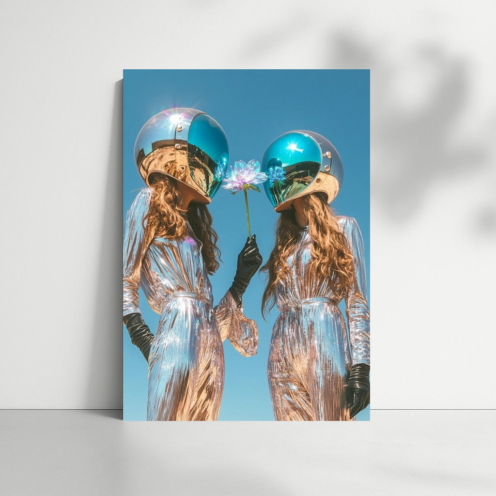 Space fantasy: two mysterious figures in shining spacesuits share a flower. The poster will add style to your wall art. See more from the collection: Mixed Wall Art