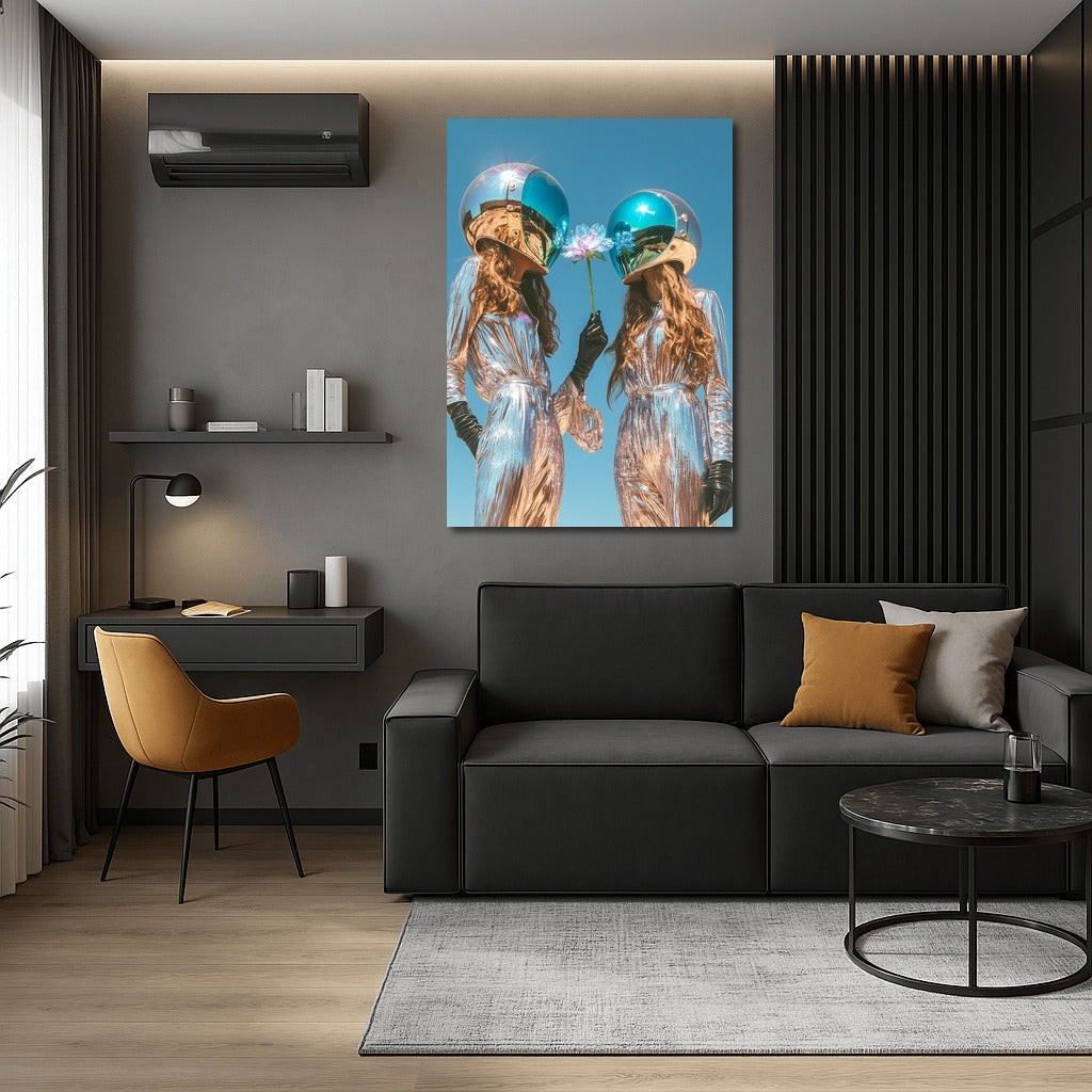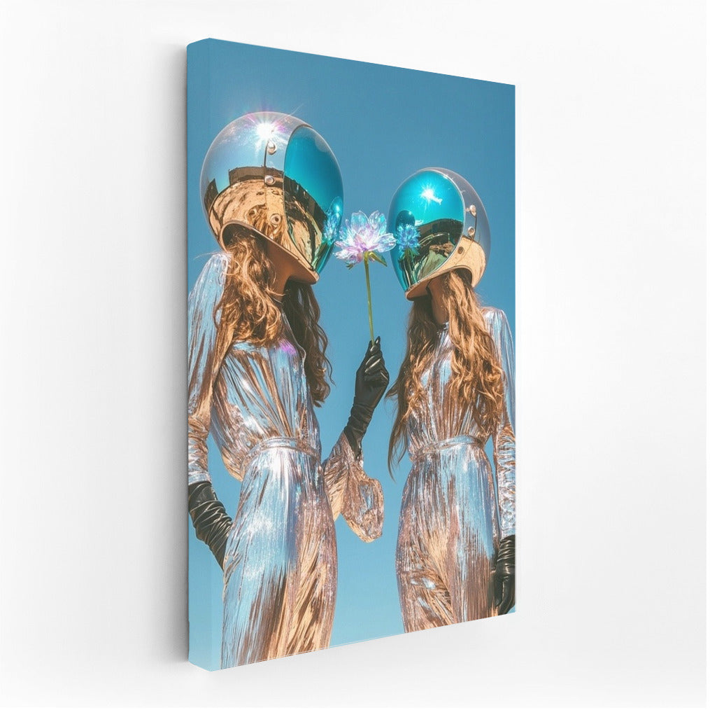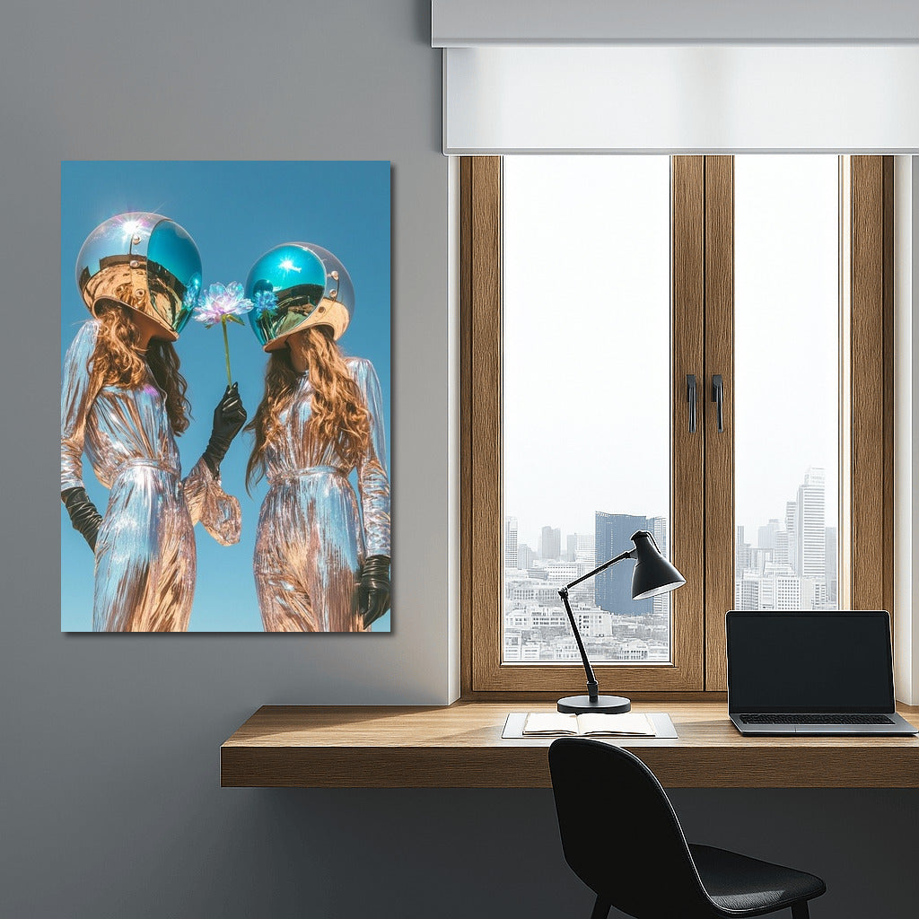 Space fantasy: two mysterious figures in shining spacesuits share a flower. The poster will add style to your wall art. See more from the collection: Mixed Wall Art