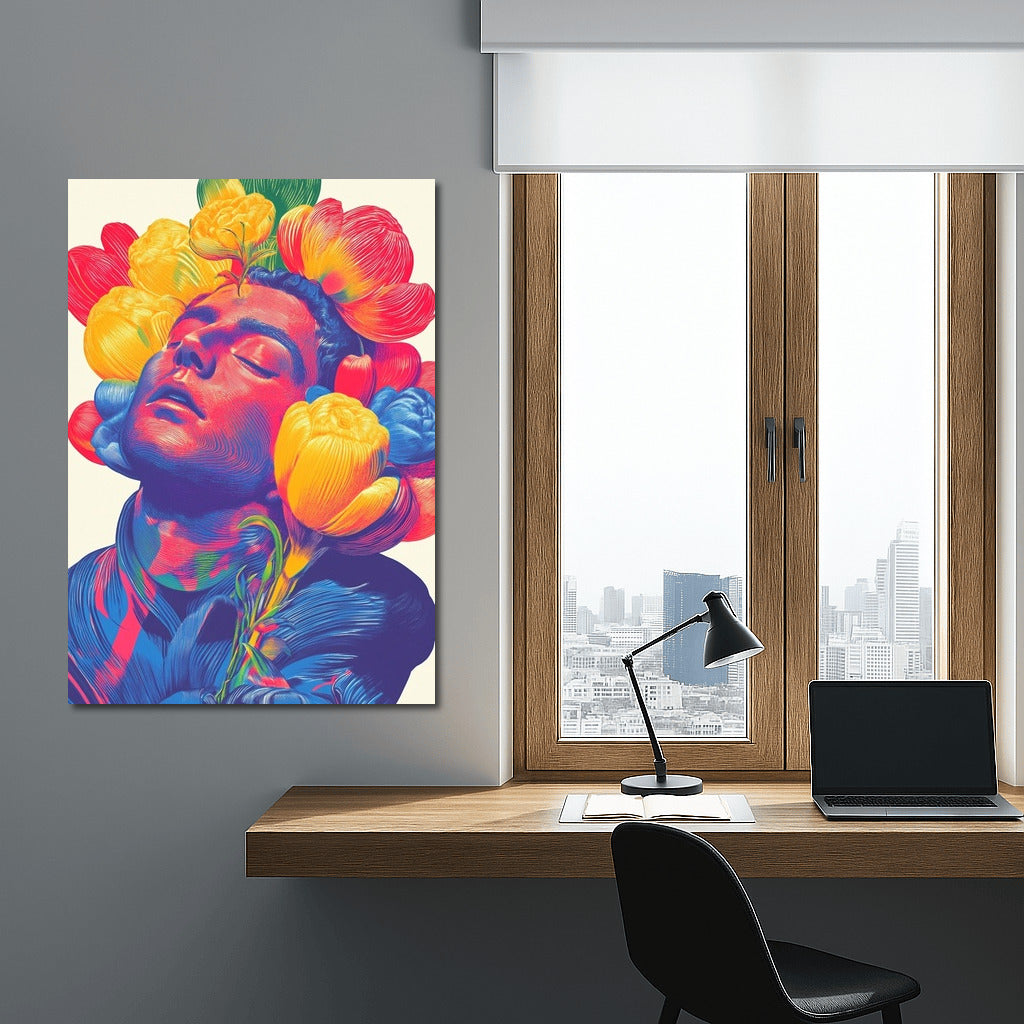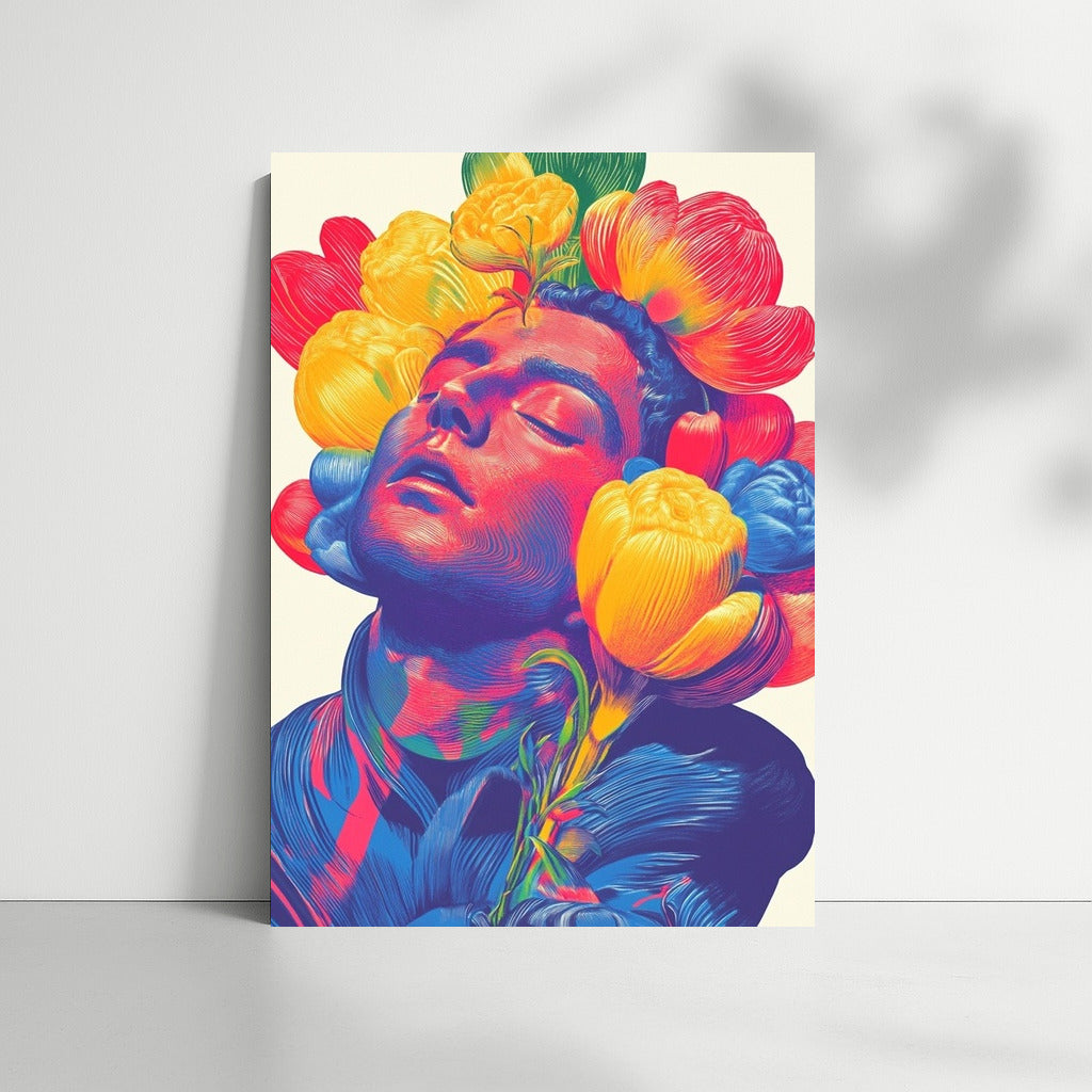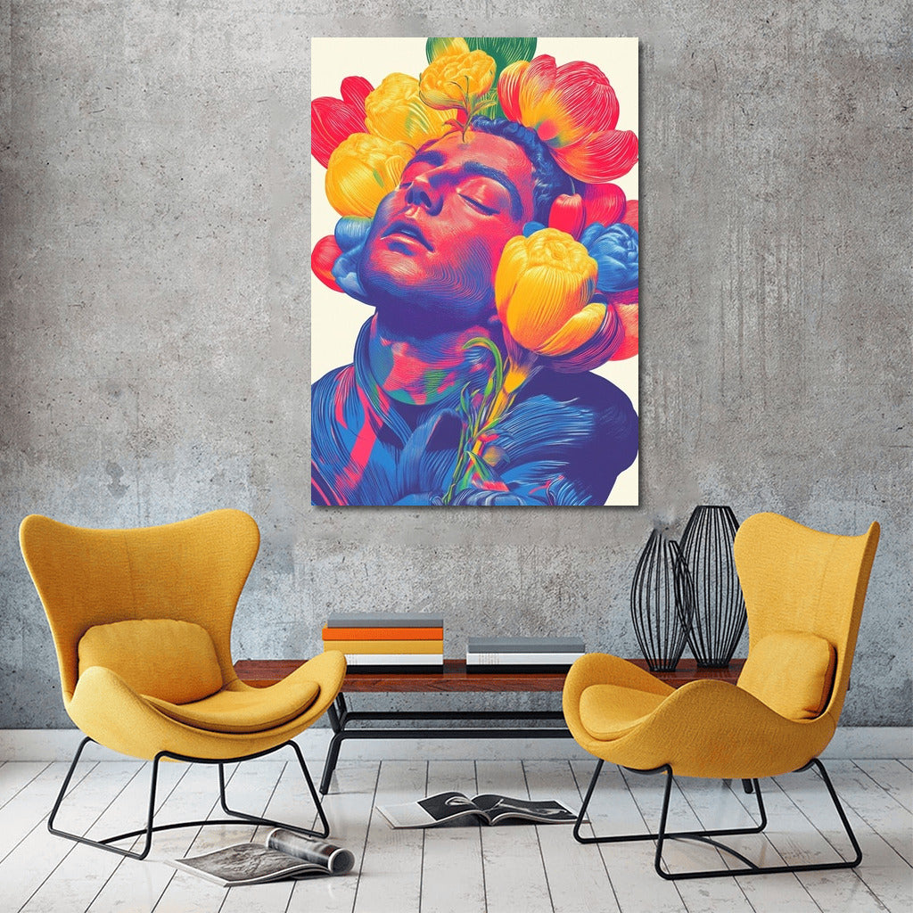 Dive into a dream world with a vibrant painting: a fantasy where a man dissolves in a riot of floral colors. Wall art! See more from the collection: Pop Art