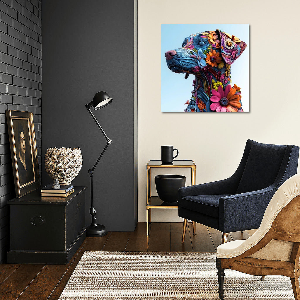 A vibrant flower dog poster: wall art that will liven up any space with a play of colors and unique imagination. See more from the collection: Animals Art