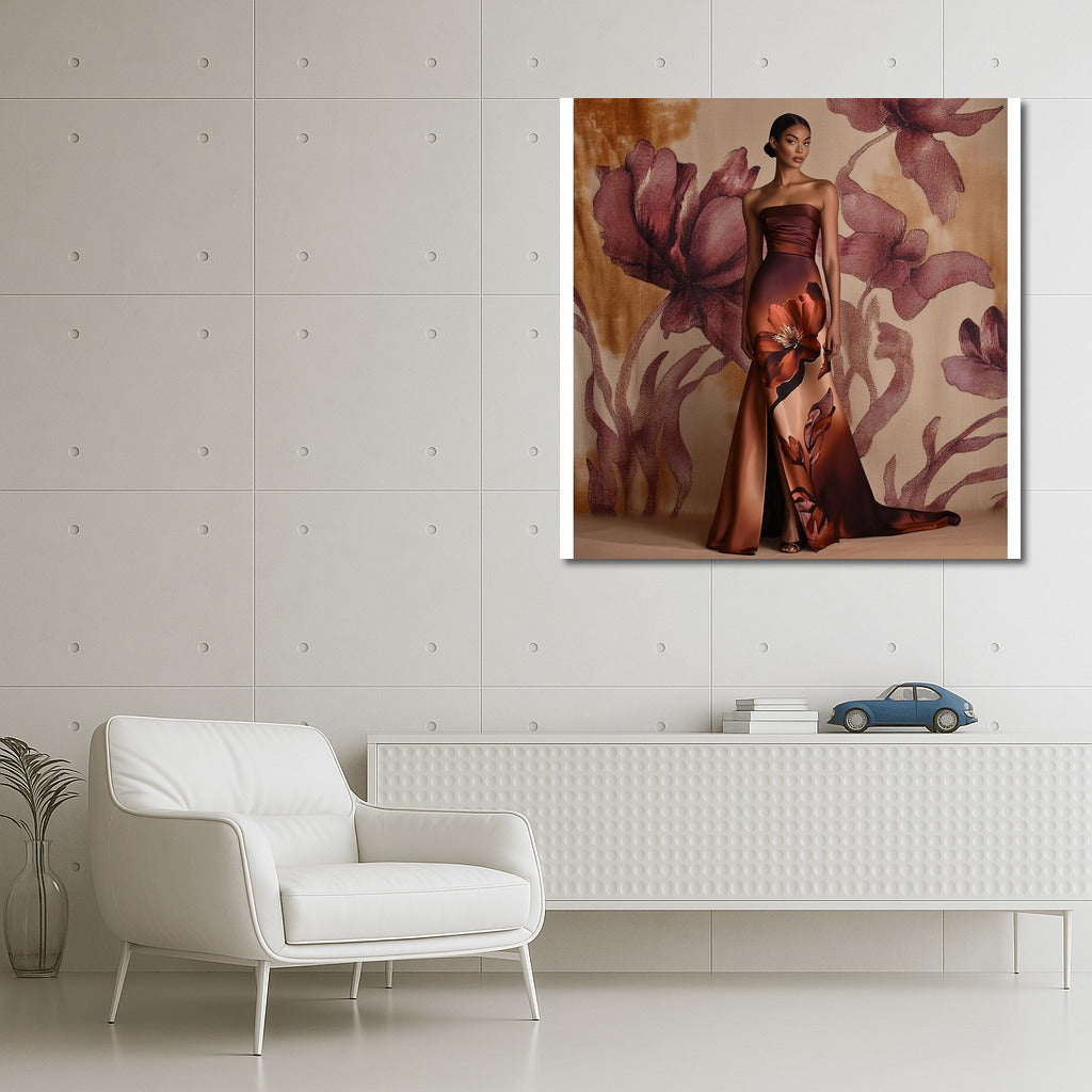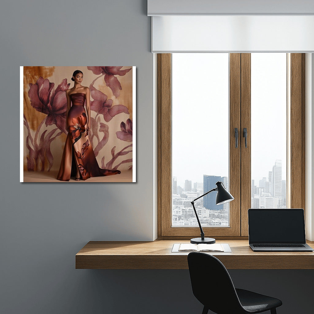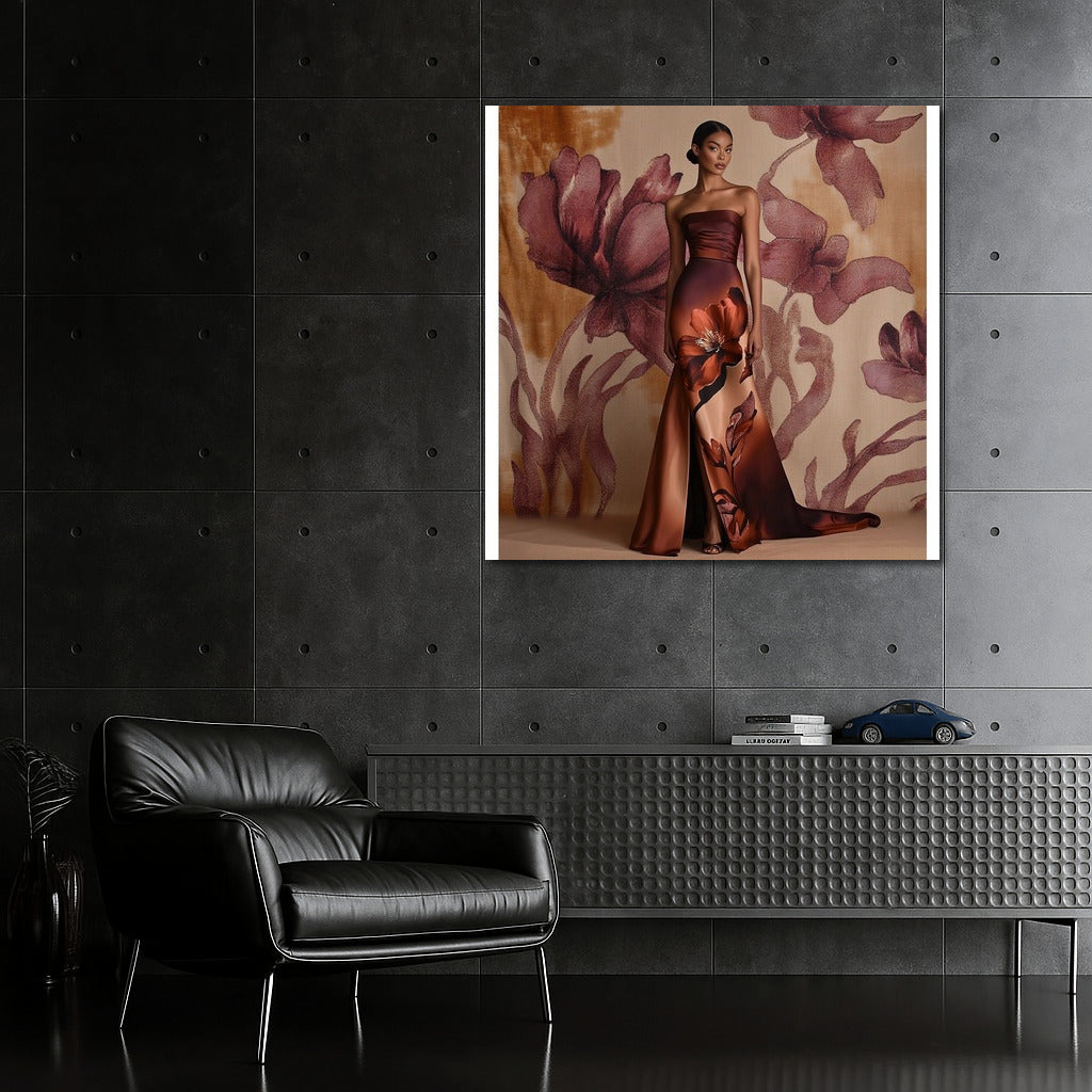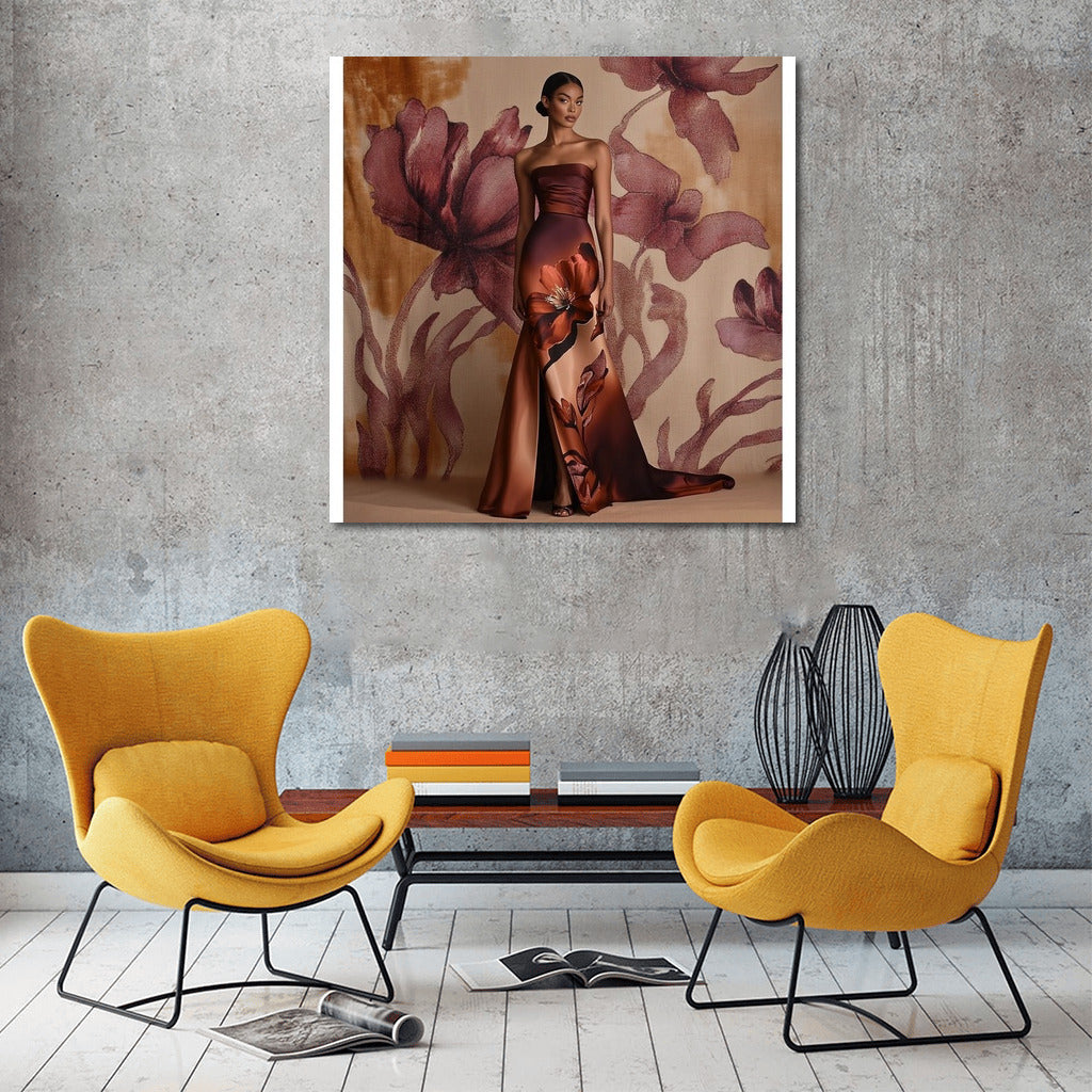 An elegant painting of a girl in a dress blending with a floral background is the perfect wall art for a sophisticated interior. See more from the collection: Fashion Art