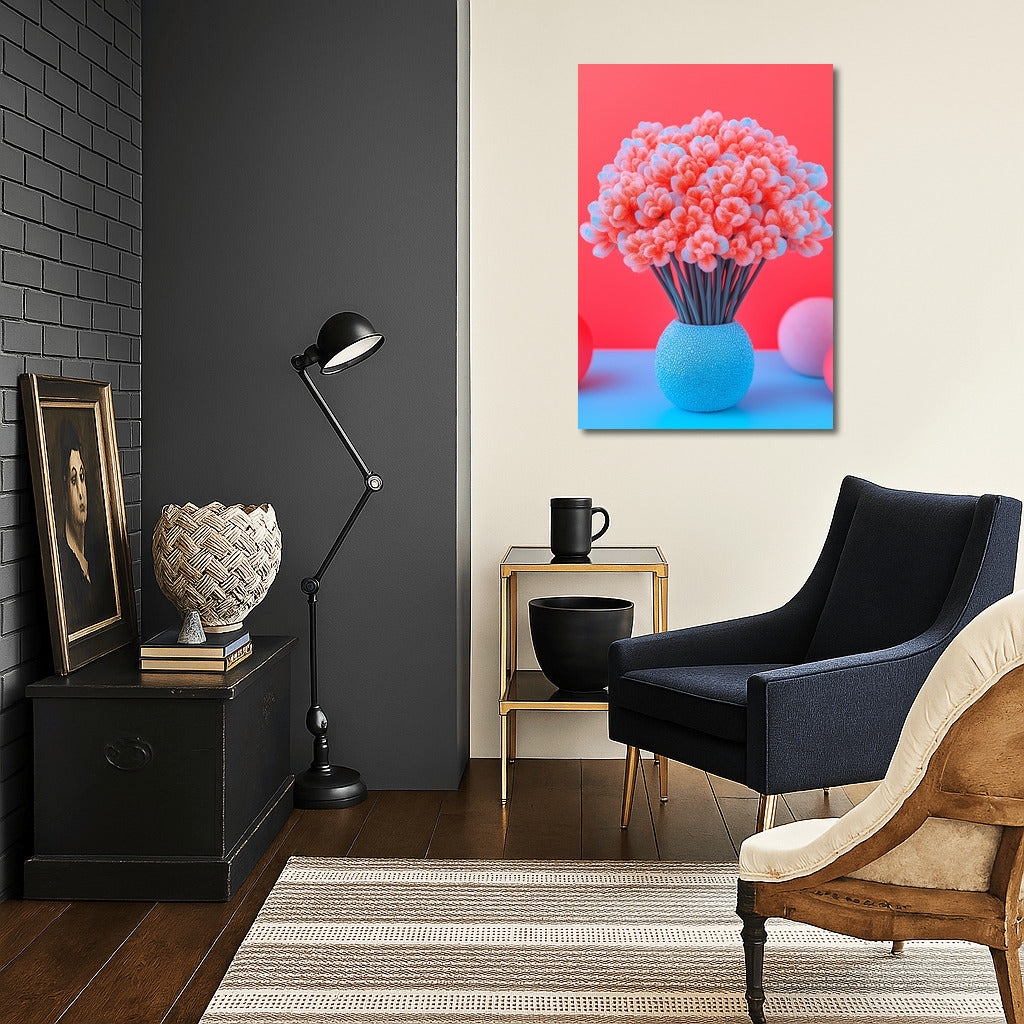 Vibrant wall art: abstract flowers in a sky blue vase. Refresh the interior of any room with this painting! See more from the collection: Flowers Art